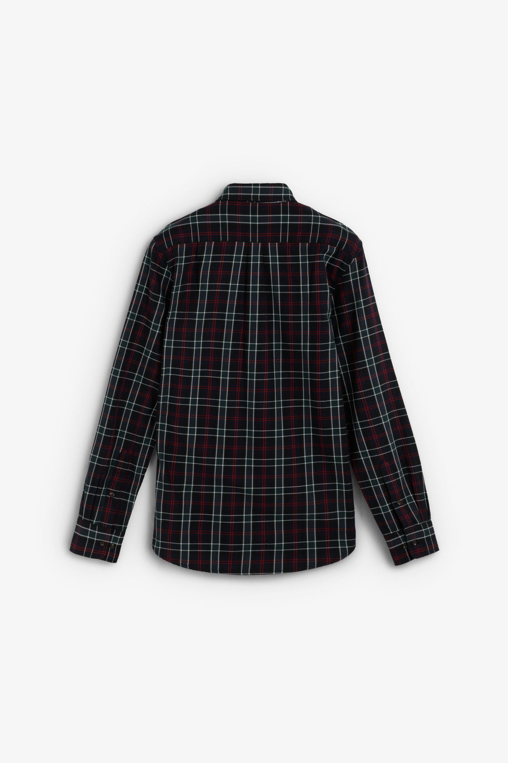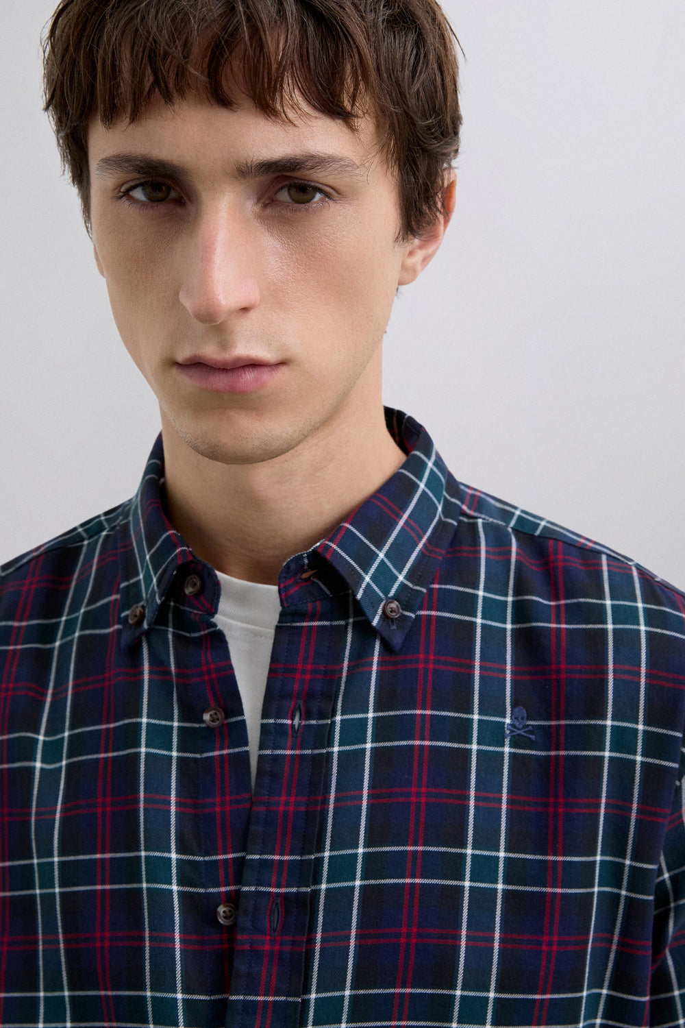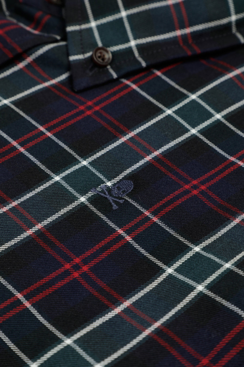 Camisa confecionada em algodão BCI xadrez tartan. Corte regular, gola com botões e fecho de botões. Manga comprida com punhos abotoados e skull bordada em contraste no peito.