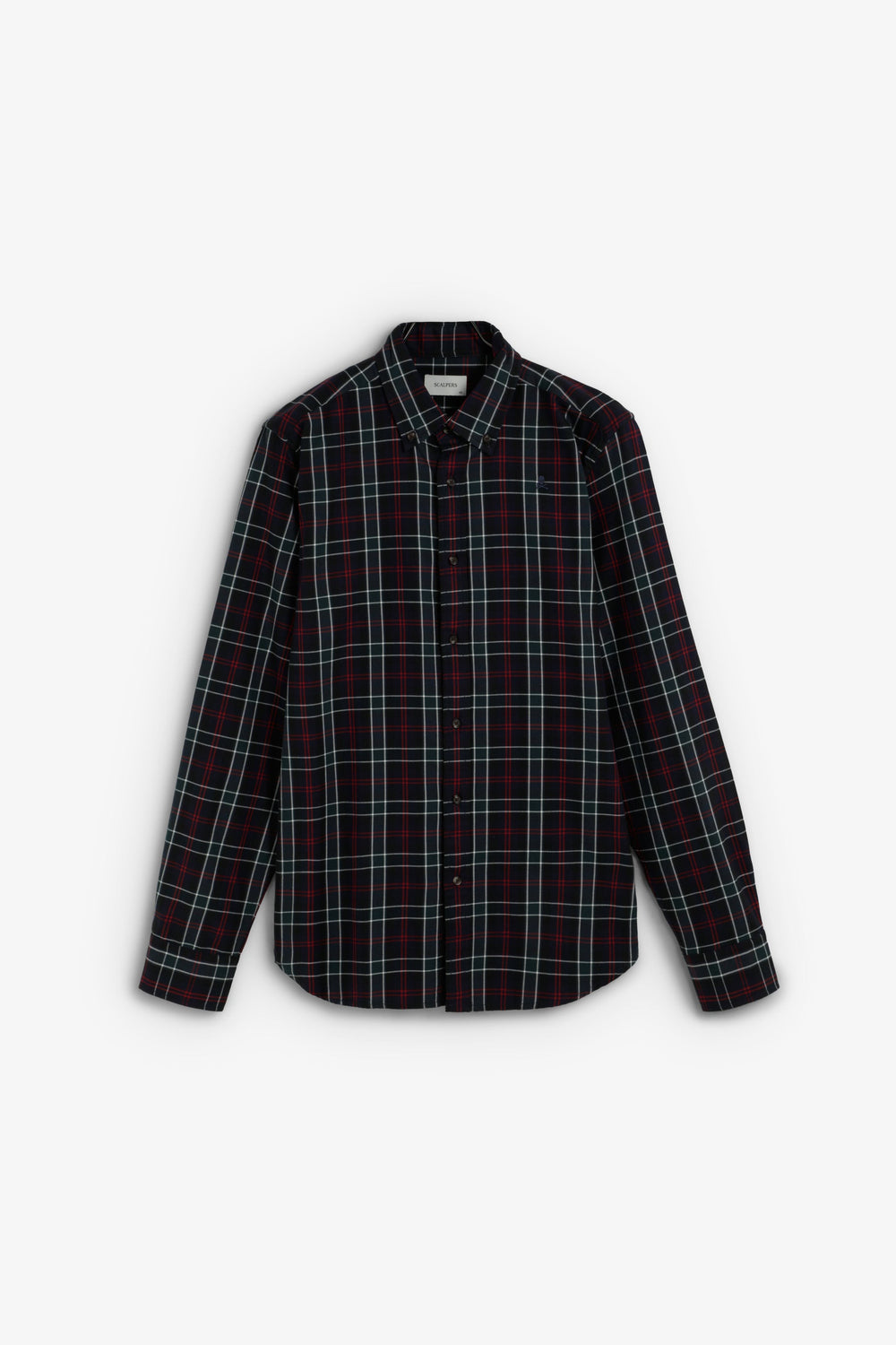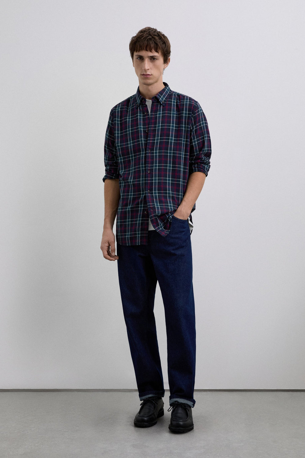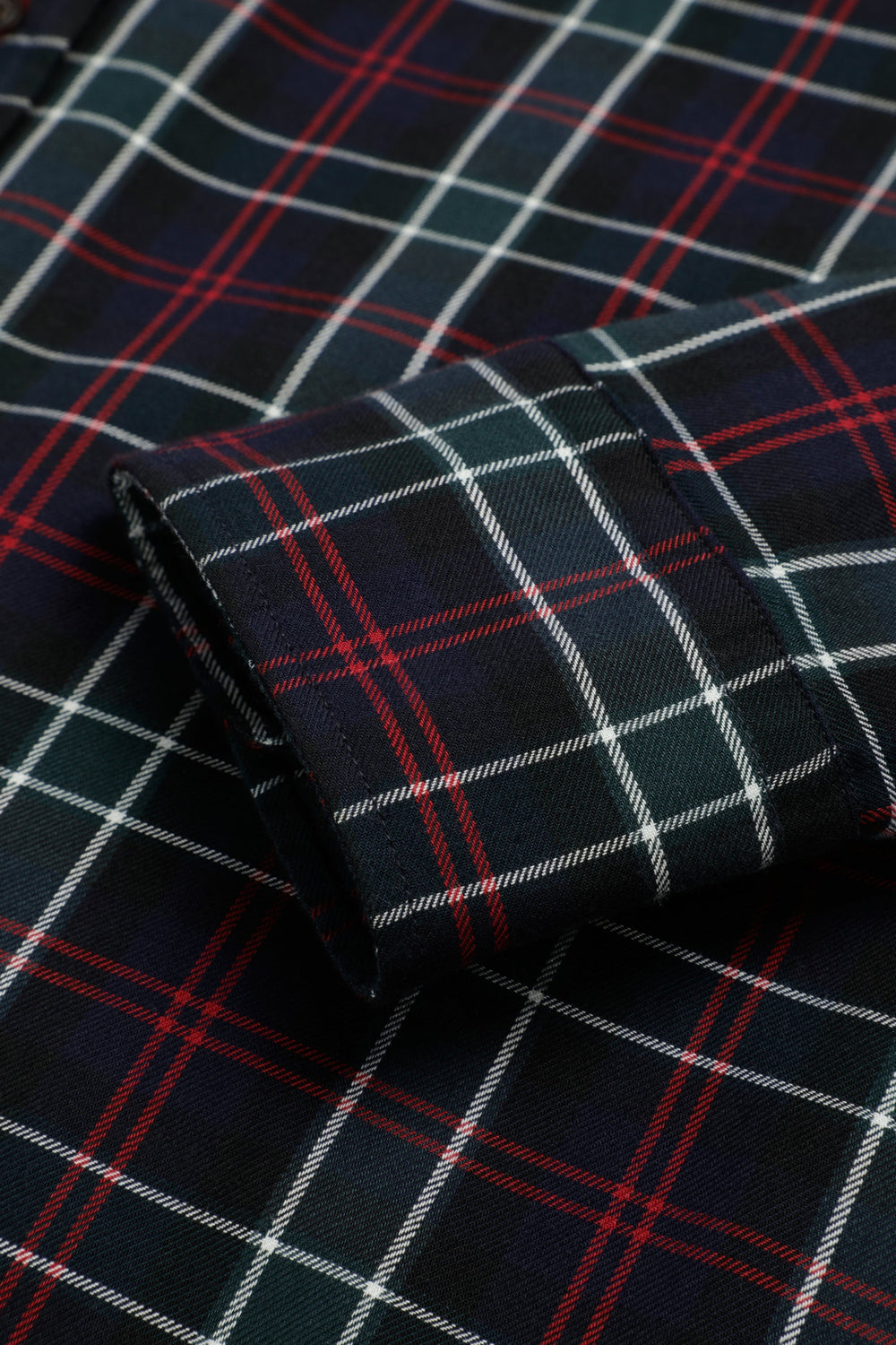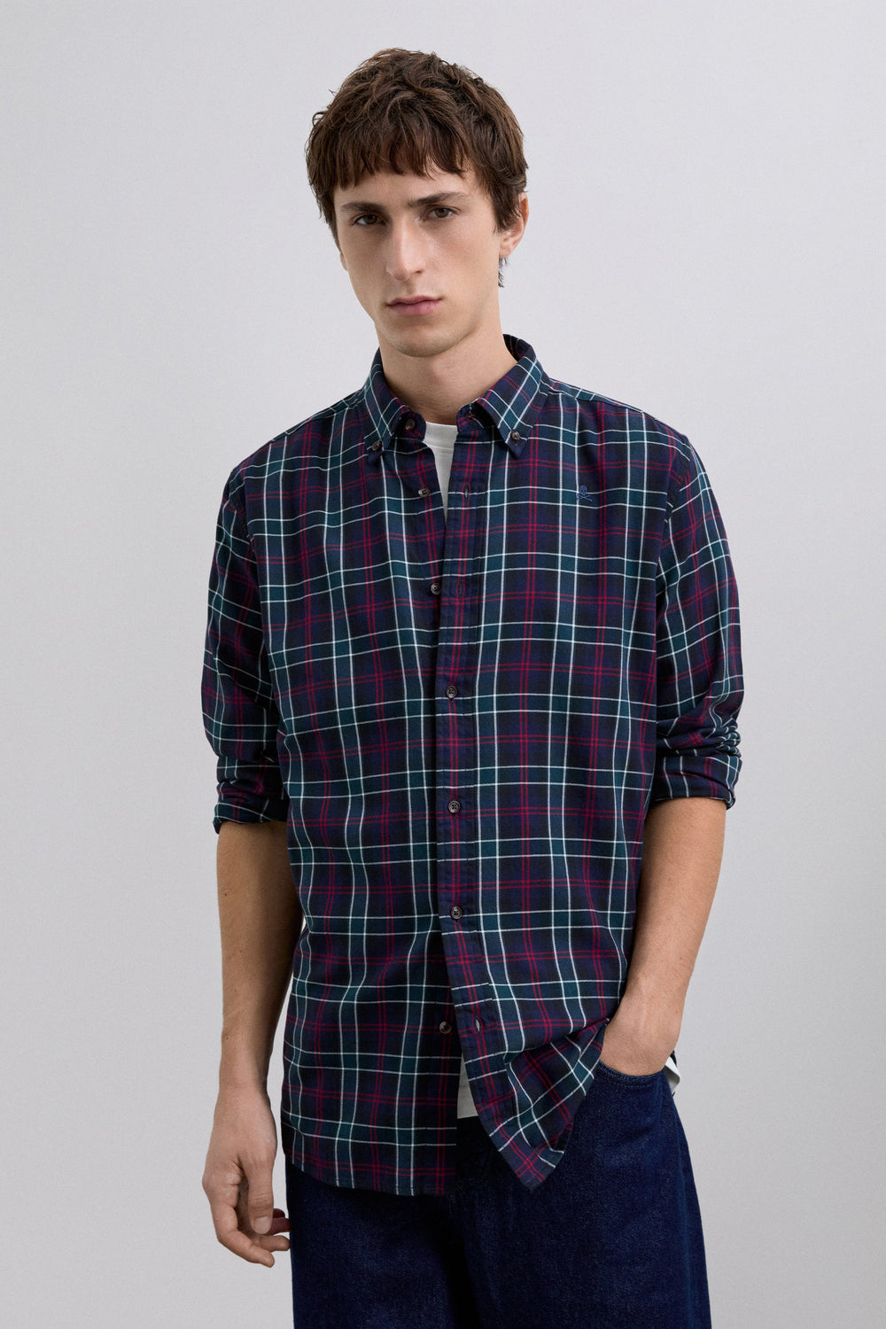 Camisa confecionada em algodão BCI xadrez tartan. Corte regular, gola com botões e fecho de botões. Manga comprida com punhos abotoados e skull bordada em contraste no peito.