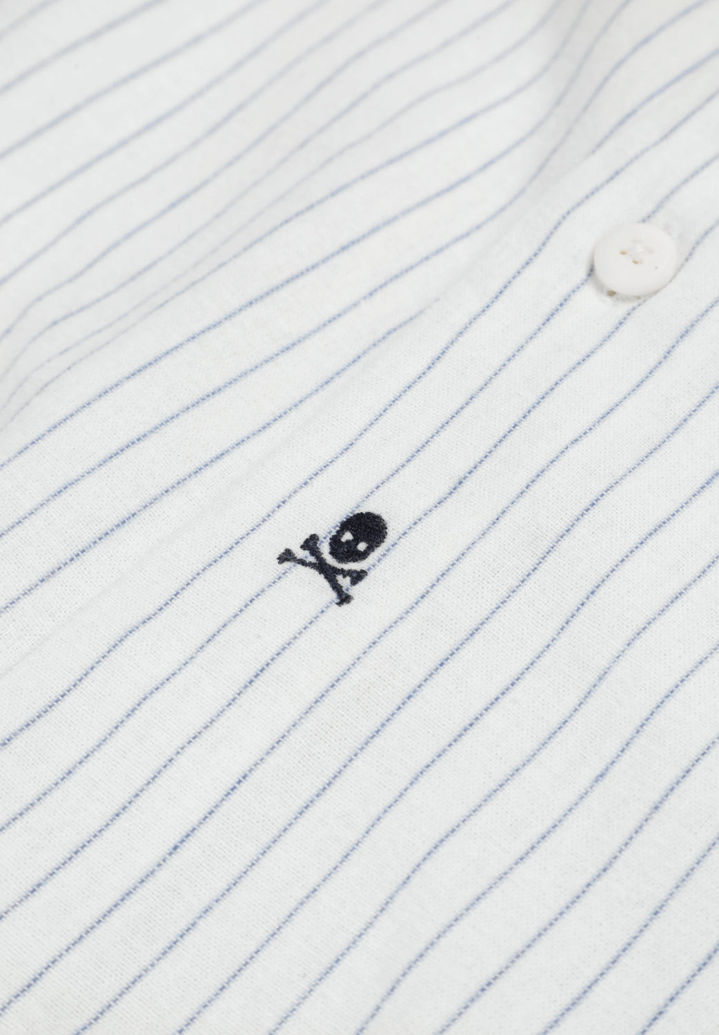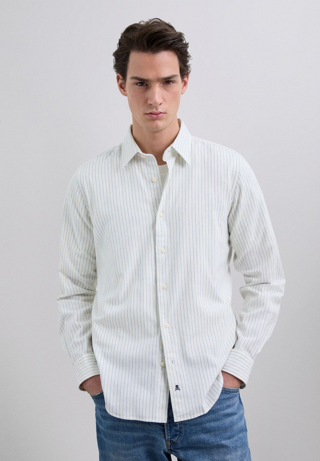 Camisa confecionada em tecido 100% algodão BCI. Colarinho clássico. Manga comprida. Padrão às riscas. Bordado de skull em contraste. Fecho com botão à frente e nos punhos. Acabamento afelpado. Regular fit.