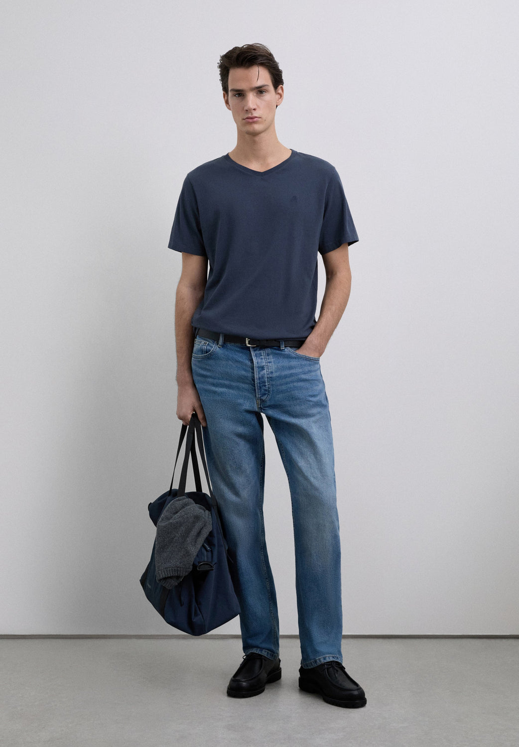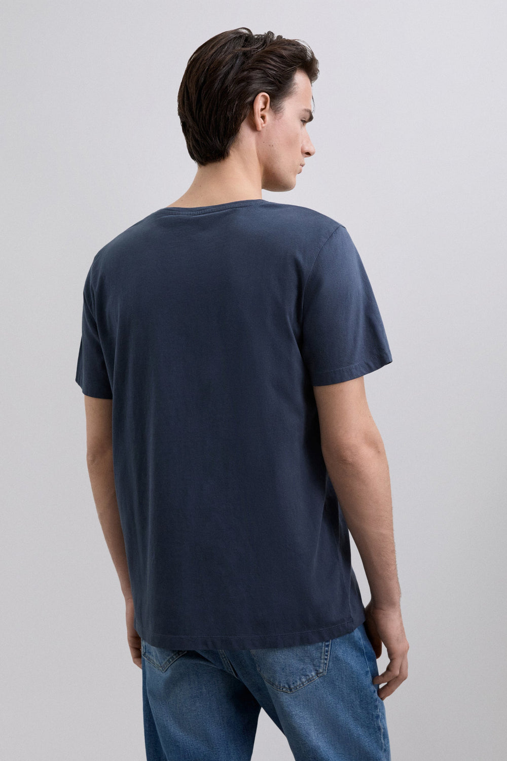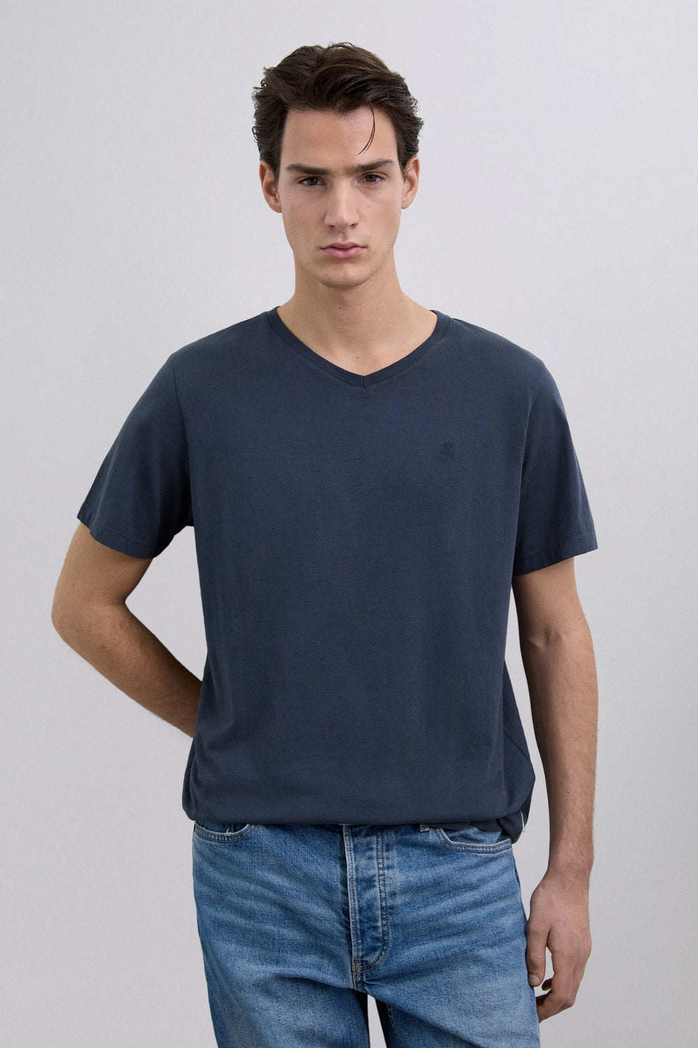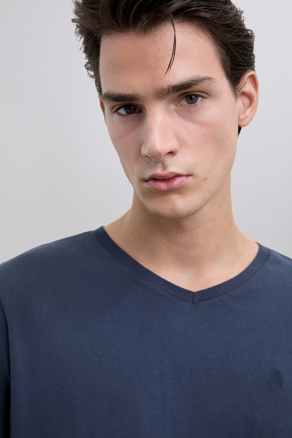 T-shirt básica com caveira bordada. Confeccionada em 100% algodão BCI. Corte Regular Fit. Gola em bico. Manga curta.