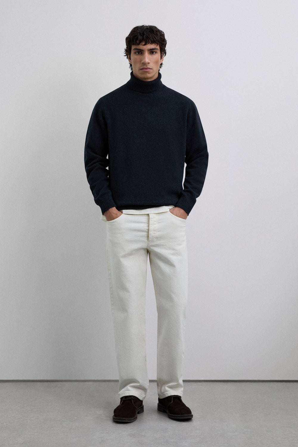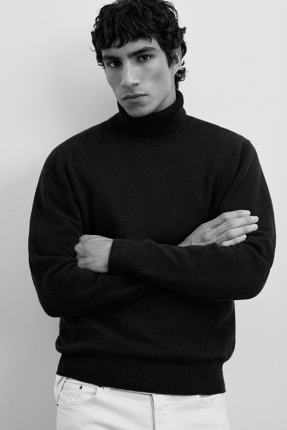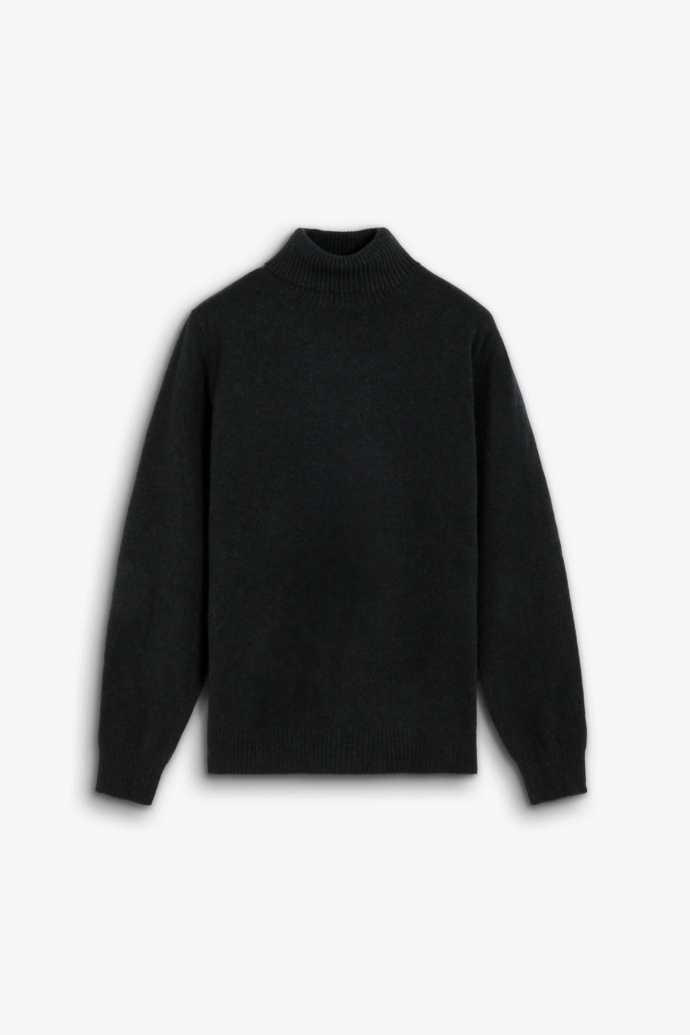 Sweater confecionada em mistura de lã e caxemira. Gola alta. Manga comprida. Acabamentos em nervuras.