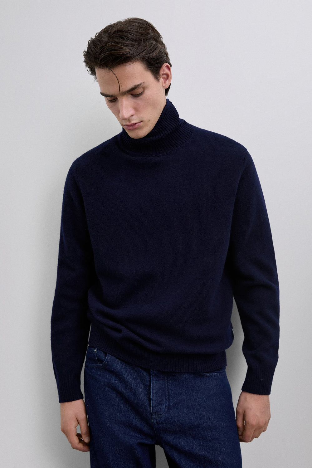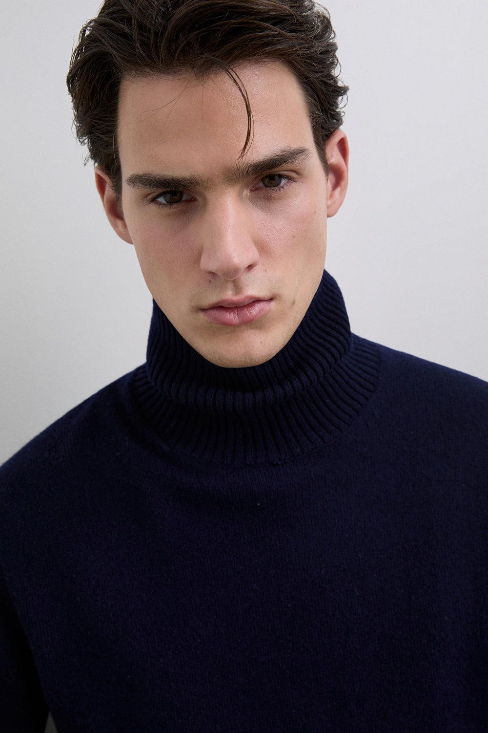 Sweater confecionada em mistura de lã e caxemira. Gola alta. Manga comprida. Acabamentos em nervuras.