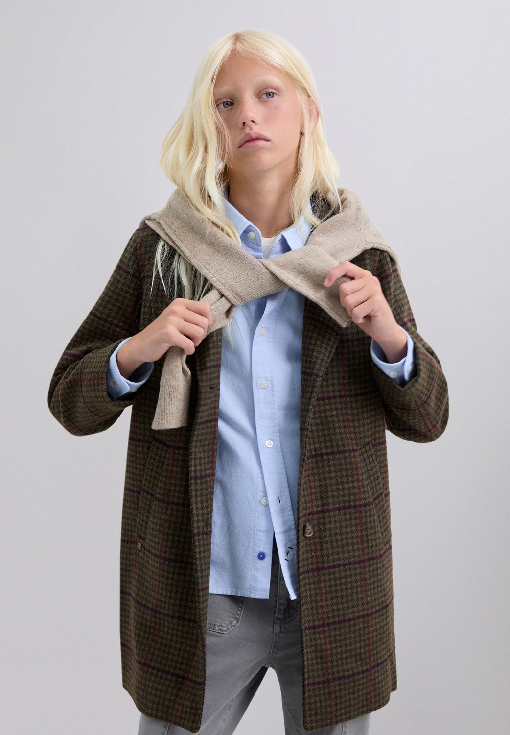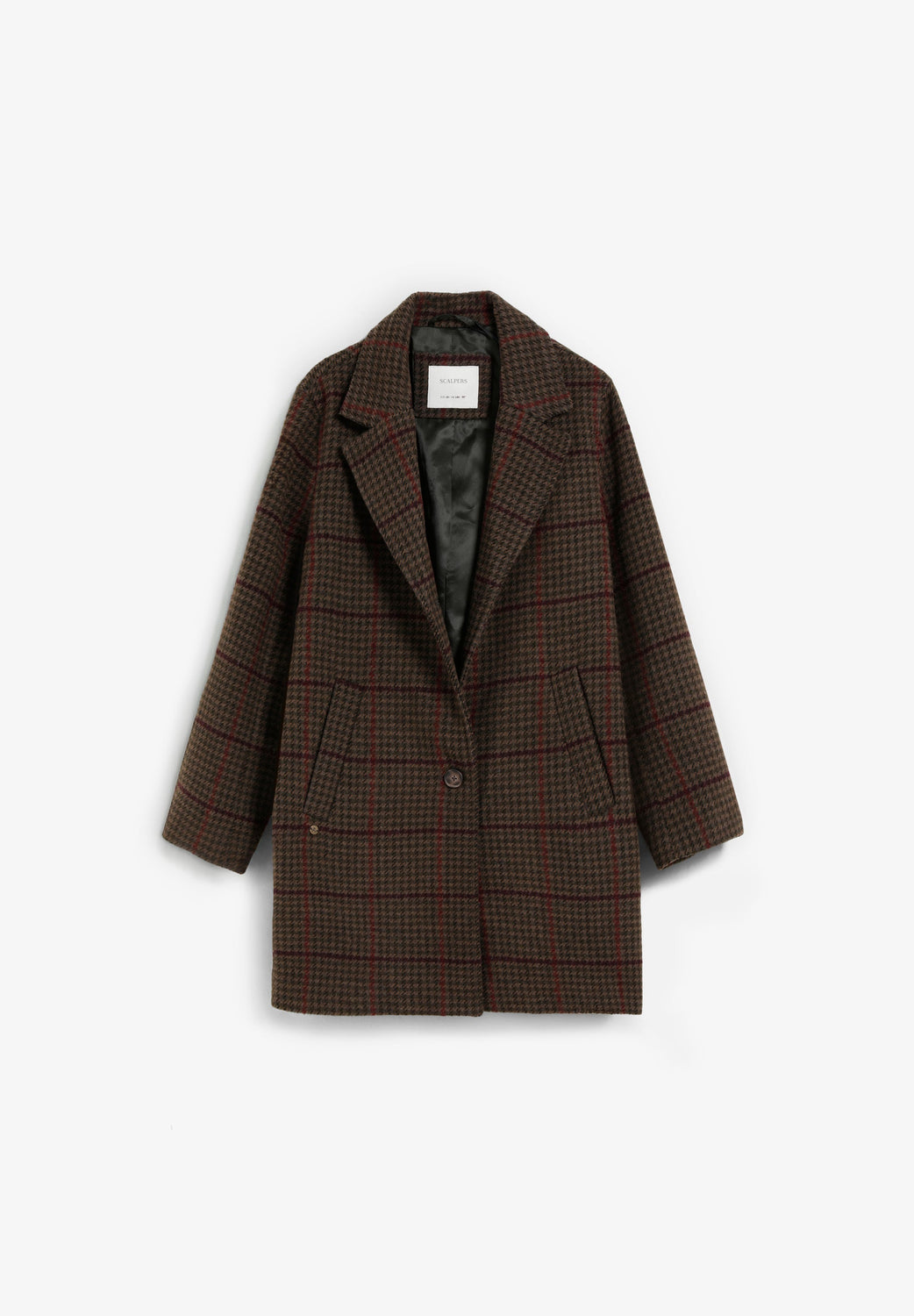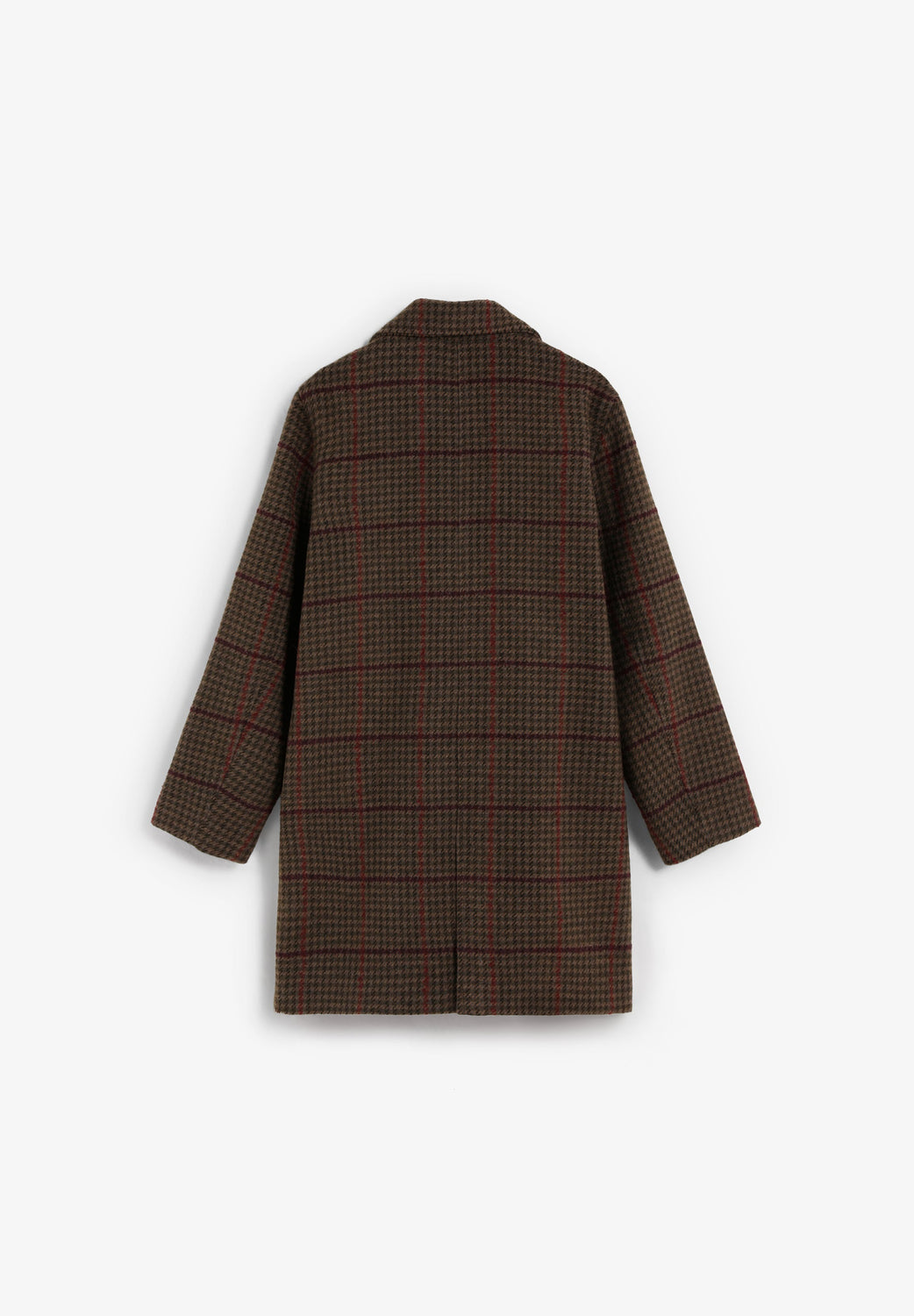 Casaco de pano xadrez. Gola com lapelas. Fecho com botões. Manga comprida. Bolsos escondidos com aba.