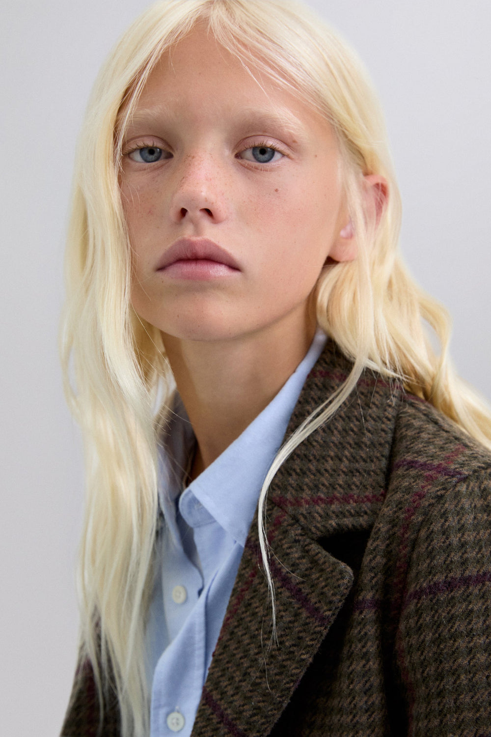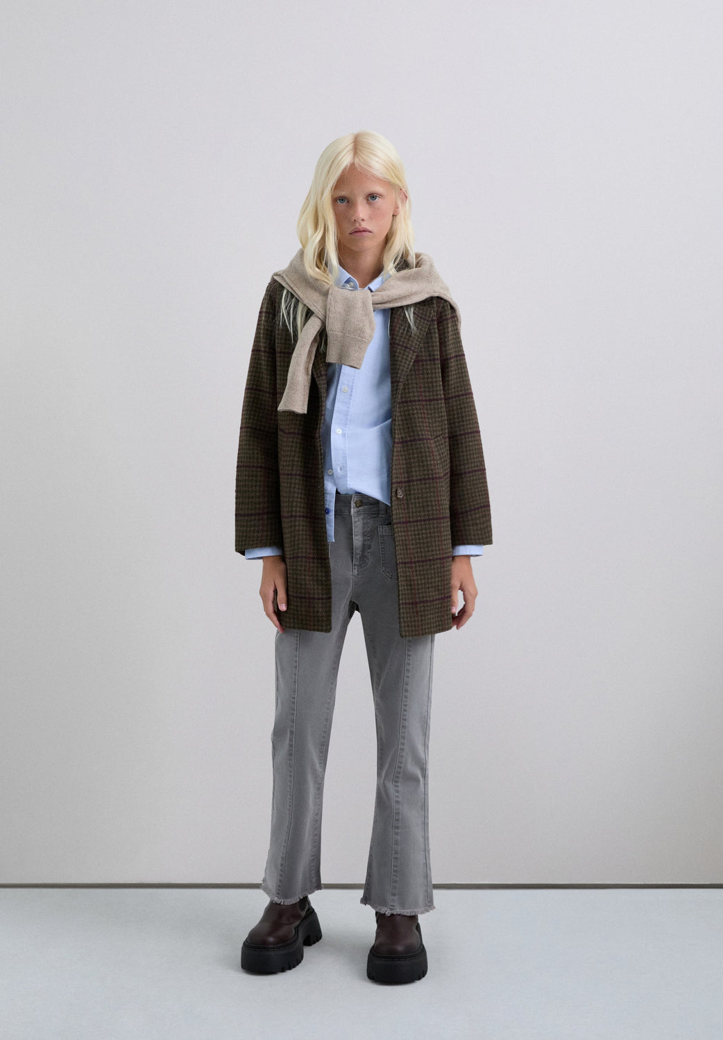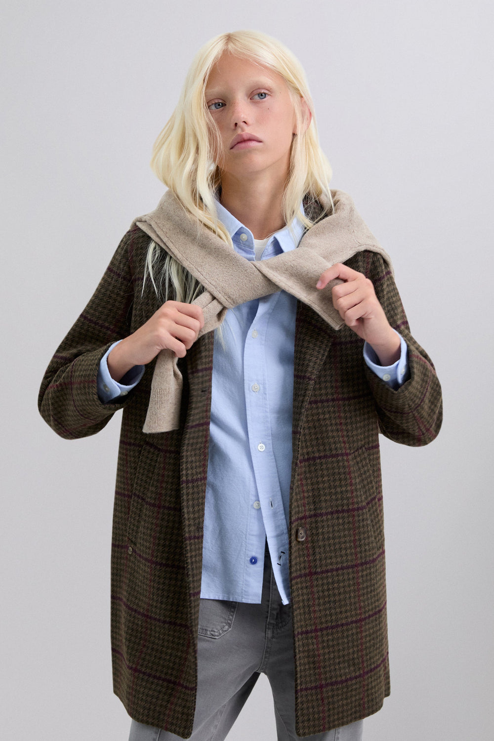 Casaco de pano xadrez. Gola com lapelas. Fecho com botões. Manga comprida. Bolsos escondidos com aba.