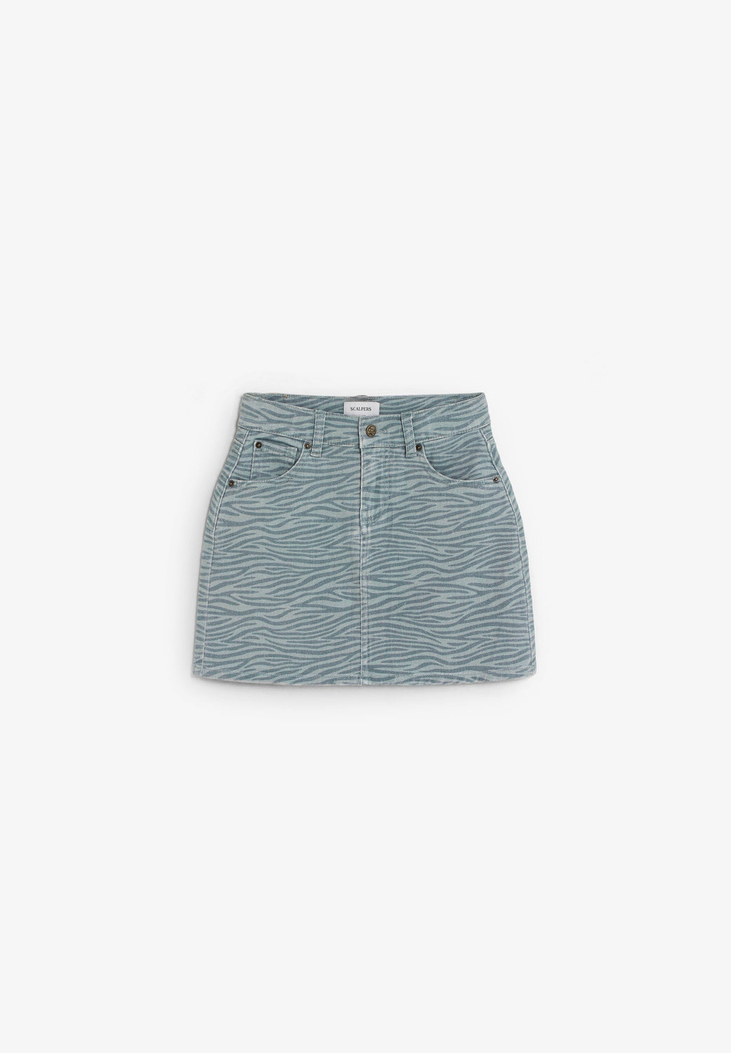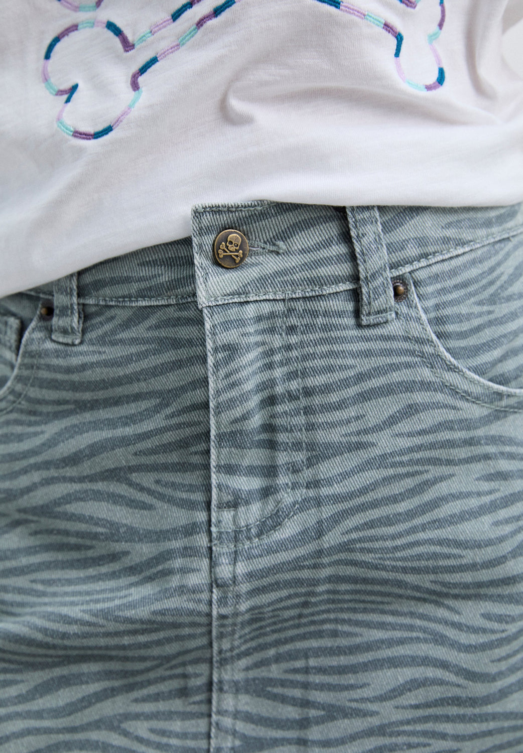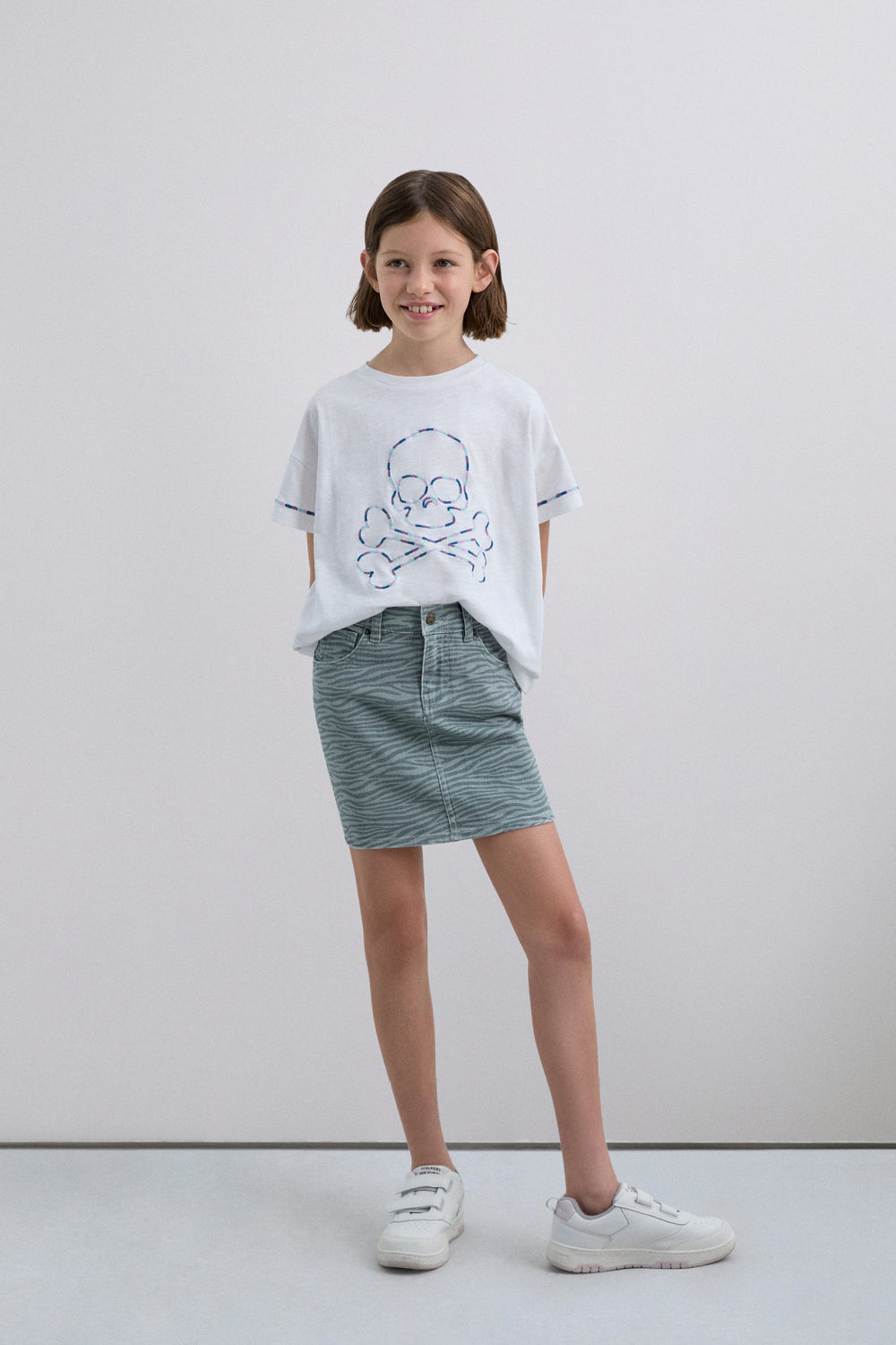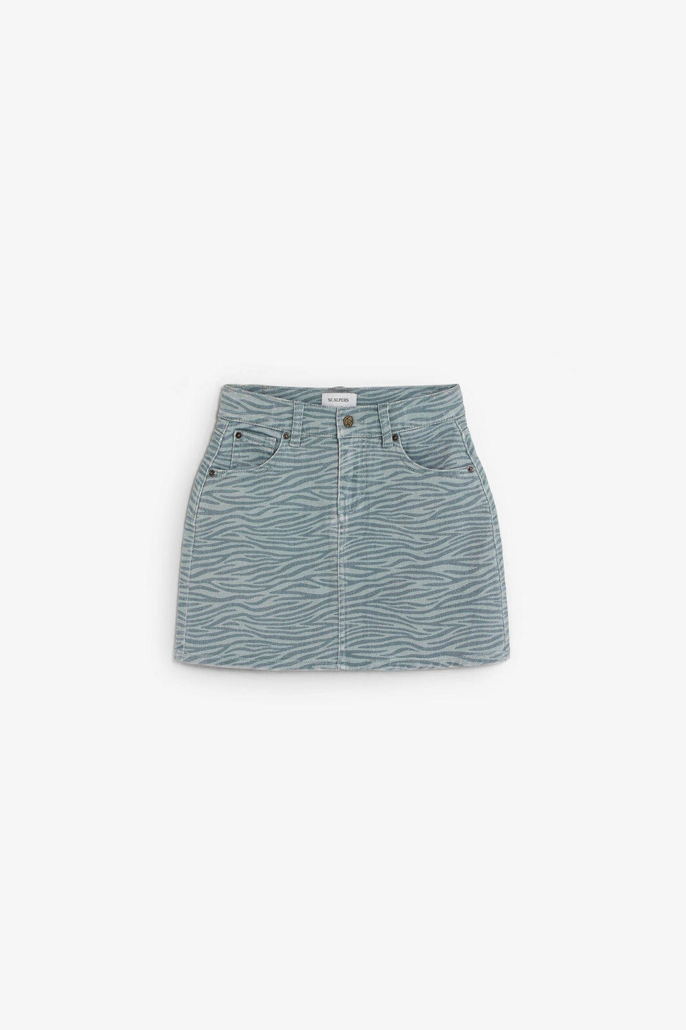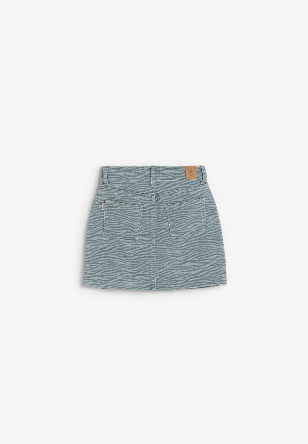 Minissaia confecionada em 98% Algodão Orgânico BCI. Fecho à frente com botão e zip. Bolsos à frente e atrás. Padrão de zebra. Pormenor de etiqueta na parte traseira.