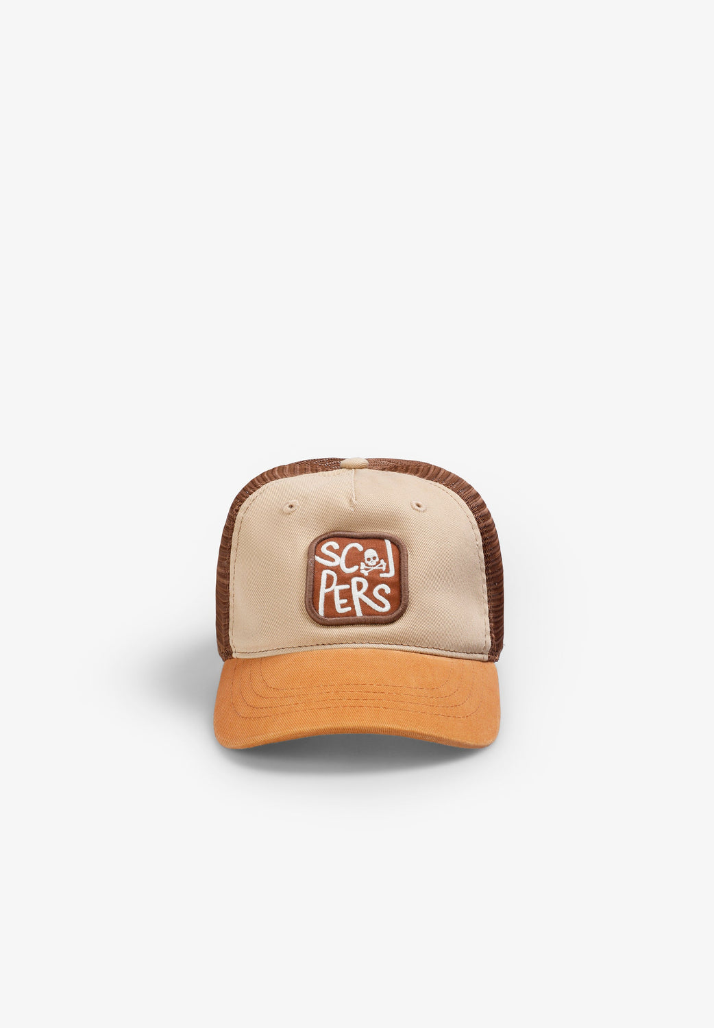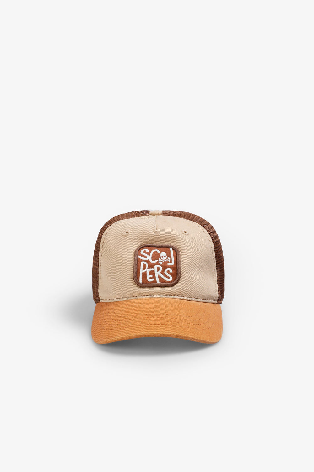 Boné estilo trucker confecionado em algodão e tecido técnico com malha traseira. Viseira e pormenor de remendo bordado com skull e logótipo em contraste.