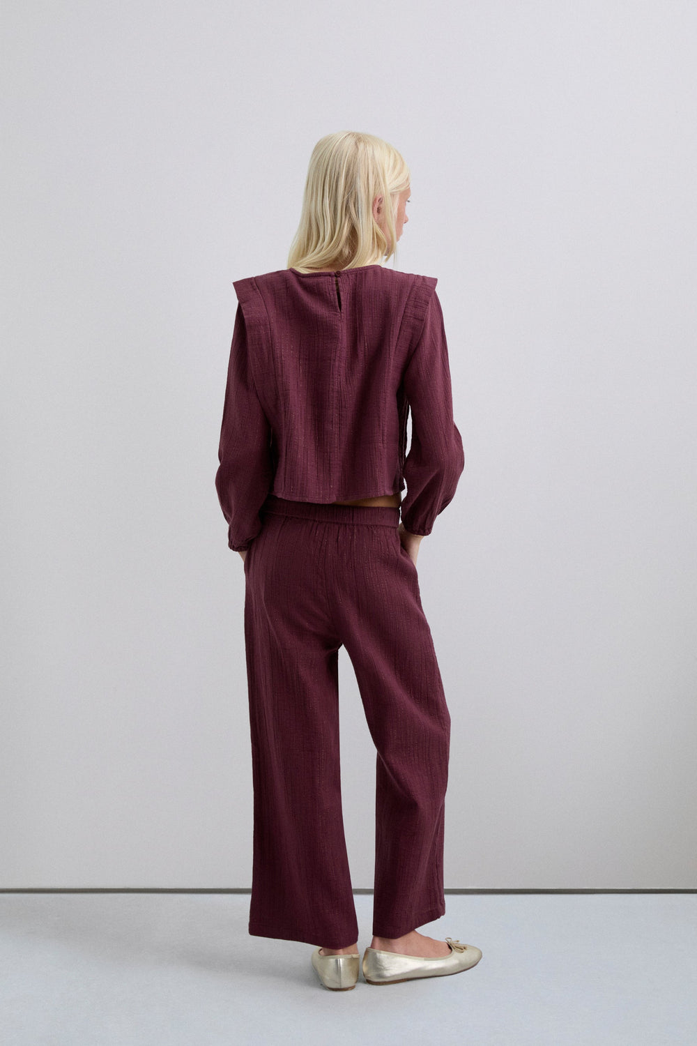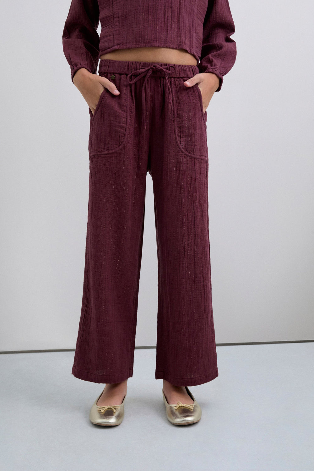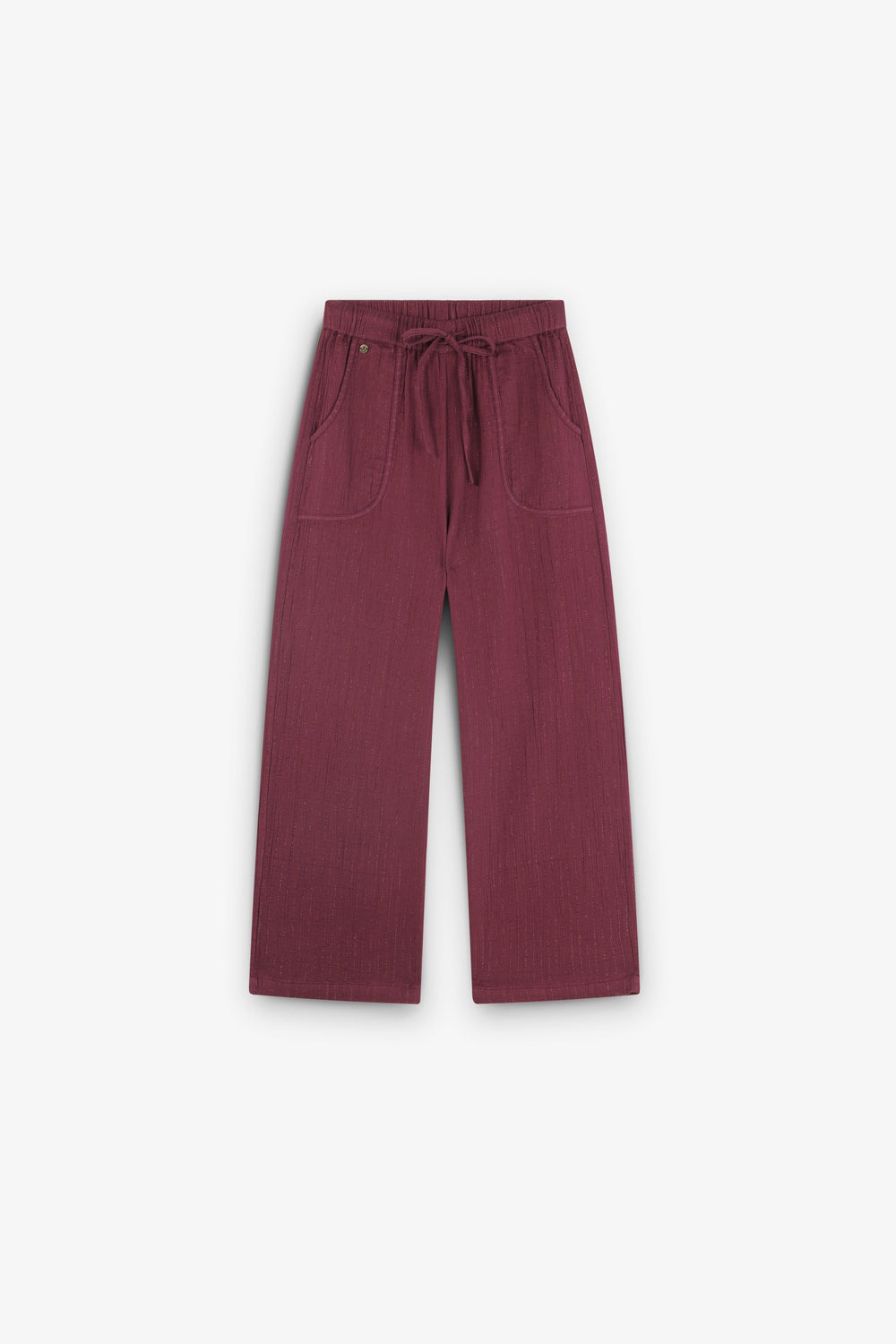 Calças culottes confecionadas em algodão BCI. Dois bolsos à frente. Cintura levemente elástica com fecho de cordão. Pormenor de logótipo.