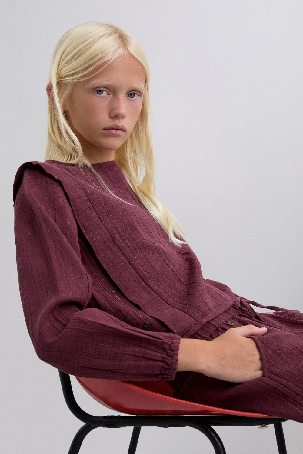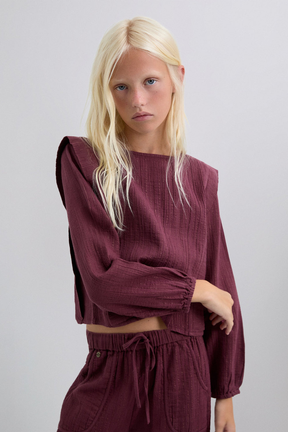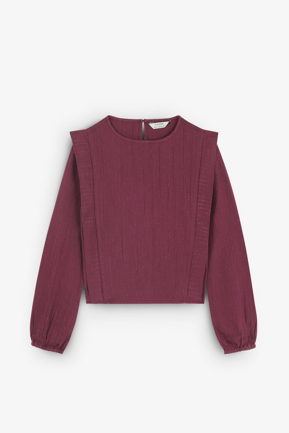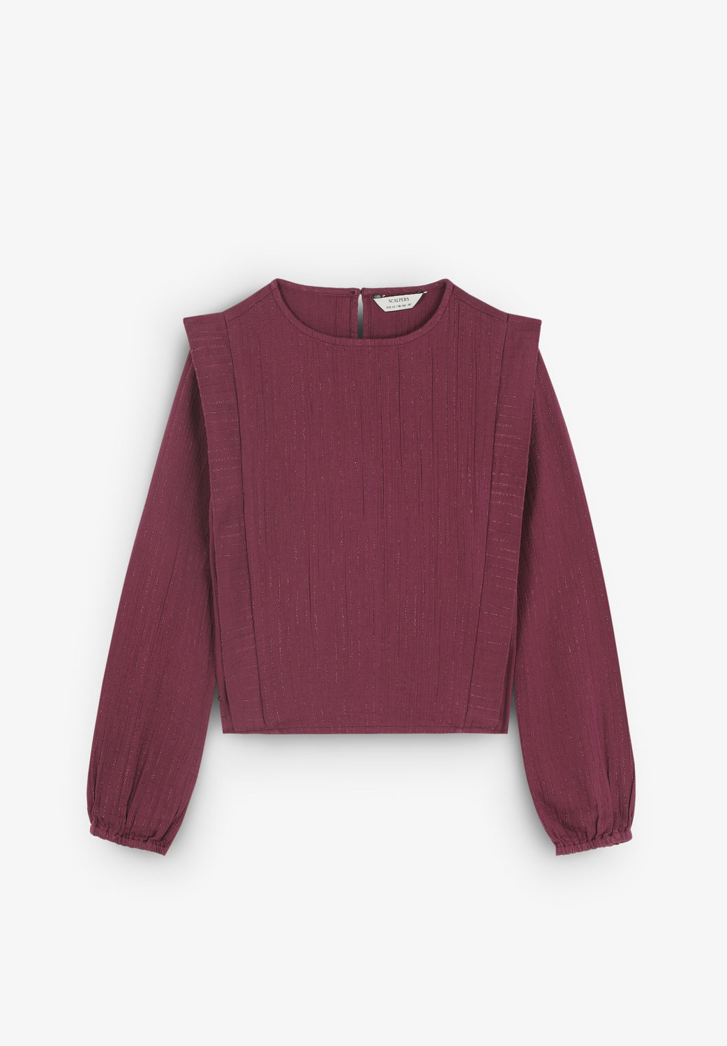 Blusa confecionada em algodão BCI. Decote redondo. Pregas à frente. Detalhes canelados. Manga comprida. Punhos elásticos. Fecho atrás com botão.