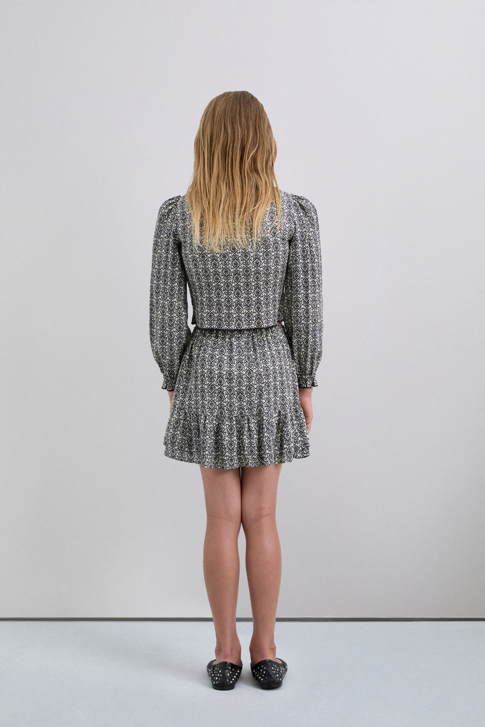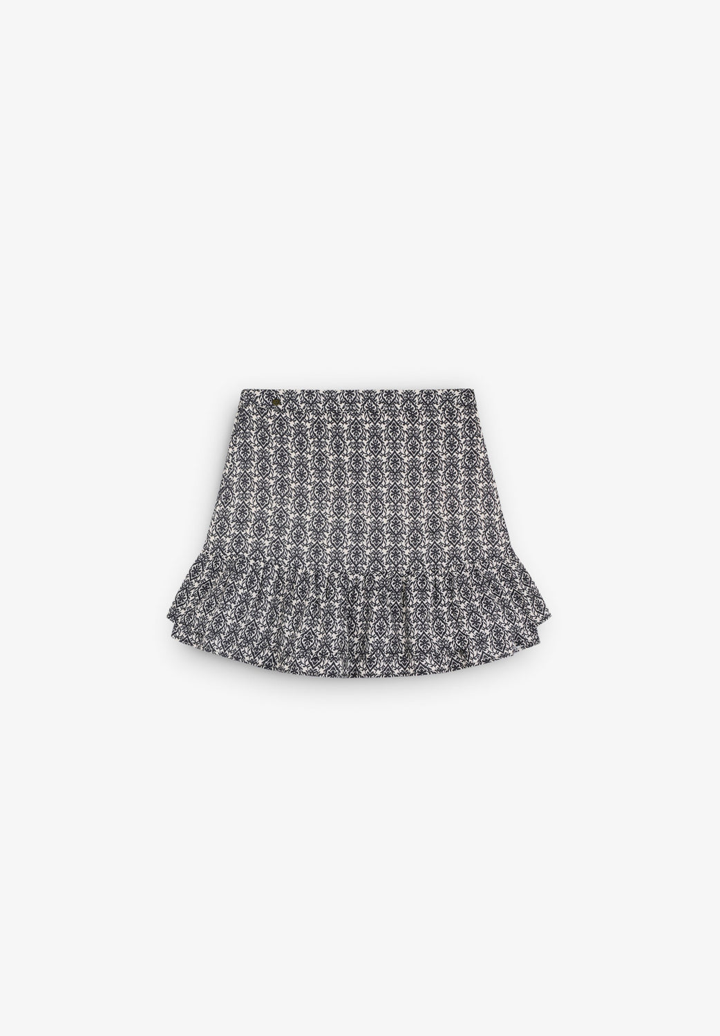 Minissaia com padrão confecionada em 100% viscose. Fecho lateral e folhos na bainha.