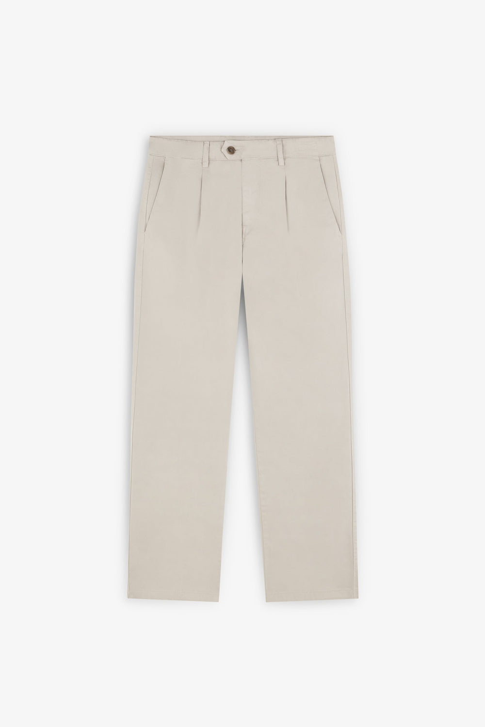 Calças chinos confecionadas em mistura de algodão BCI. Corte largo com darts. Fecho com zip oculto com placket e botão na cintura. Bolsos laterais e atrás. Presilhas na cintura.