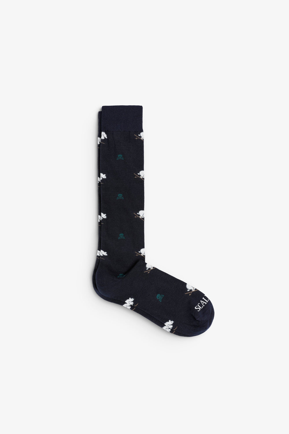 Meias confecionadas em mistura de algodão orgânico. Padrão de skulls e ursos. Pormenor de logótipo em contraste.