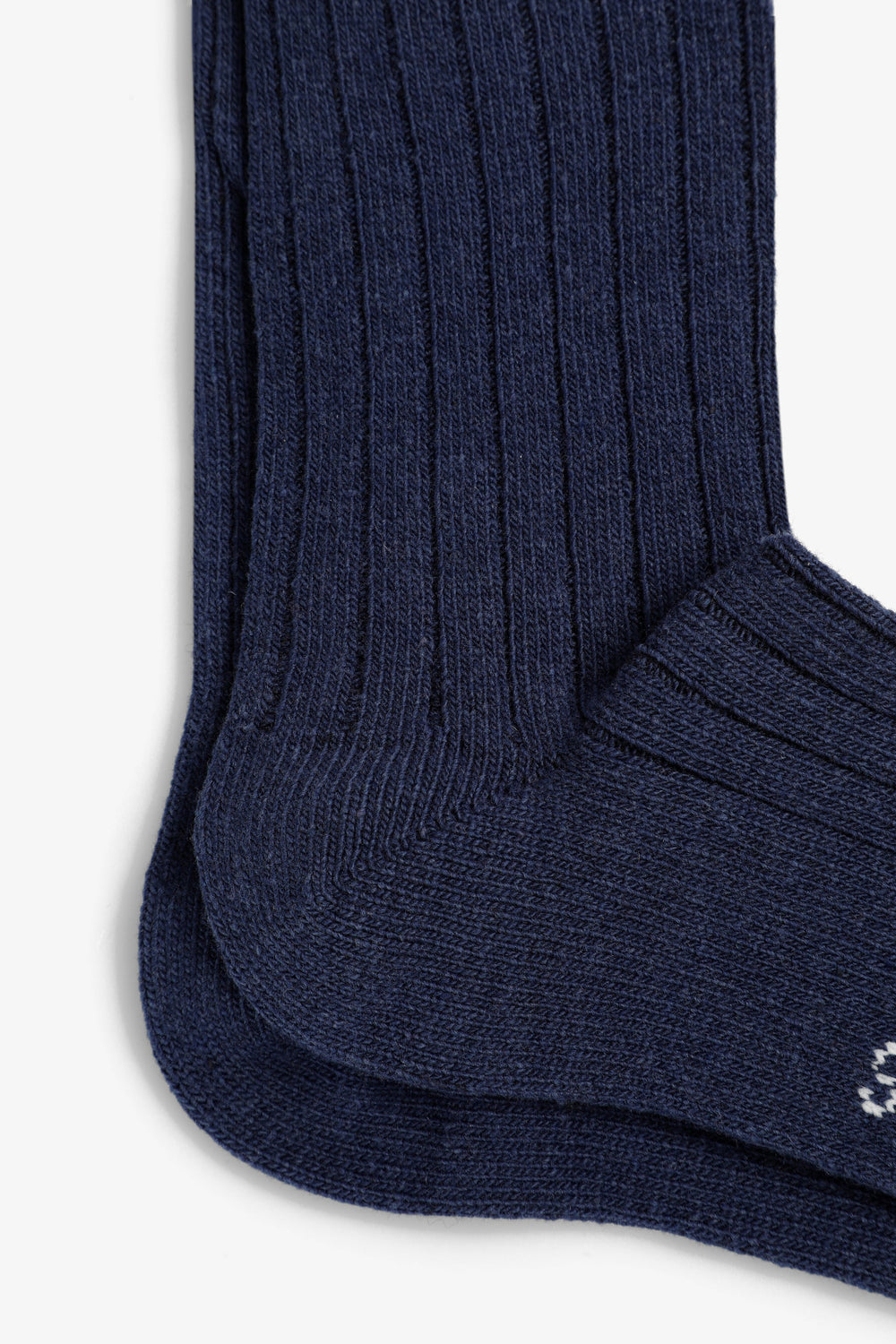Meias altas confecionadas em mistura de lã e caxemira. Pormenor de logótipo bordado no calcanhar. Acabamentos superiores canelados.
