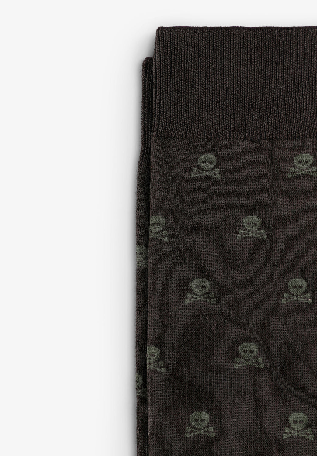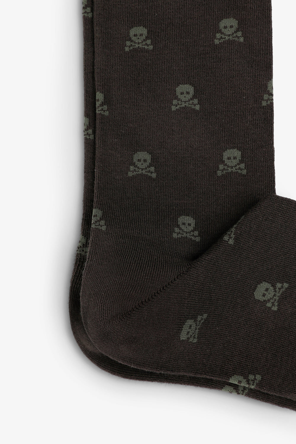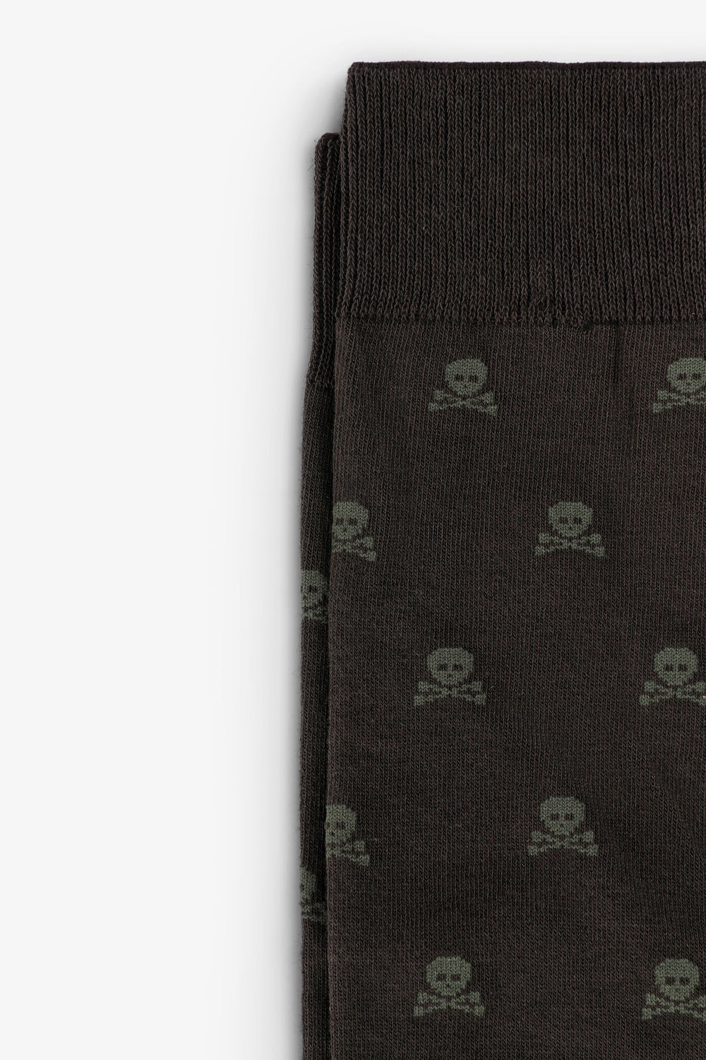 Meias confecionadas em mistura de algodão orgânico. Padrão de skulls. Pormenor de logótipo em contraste.