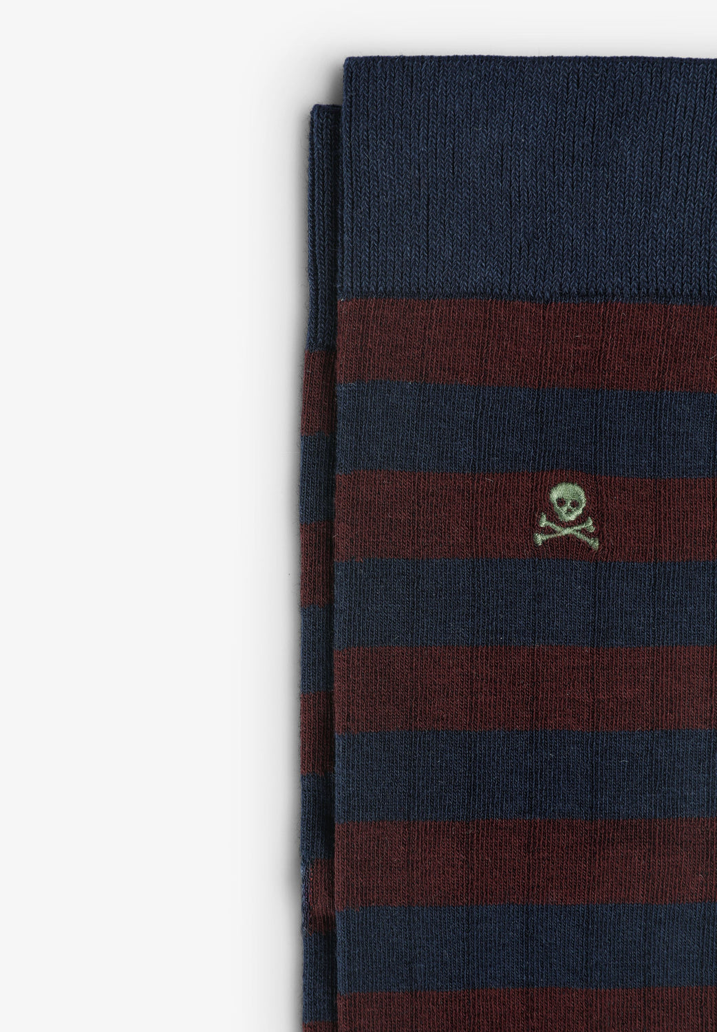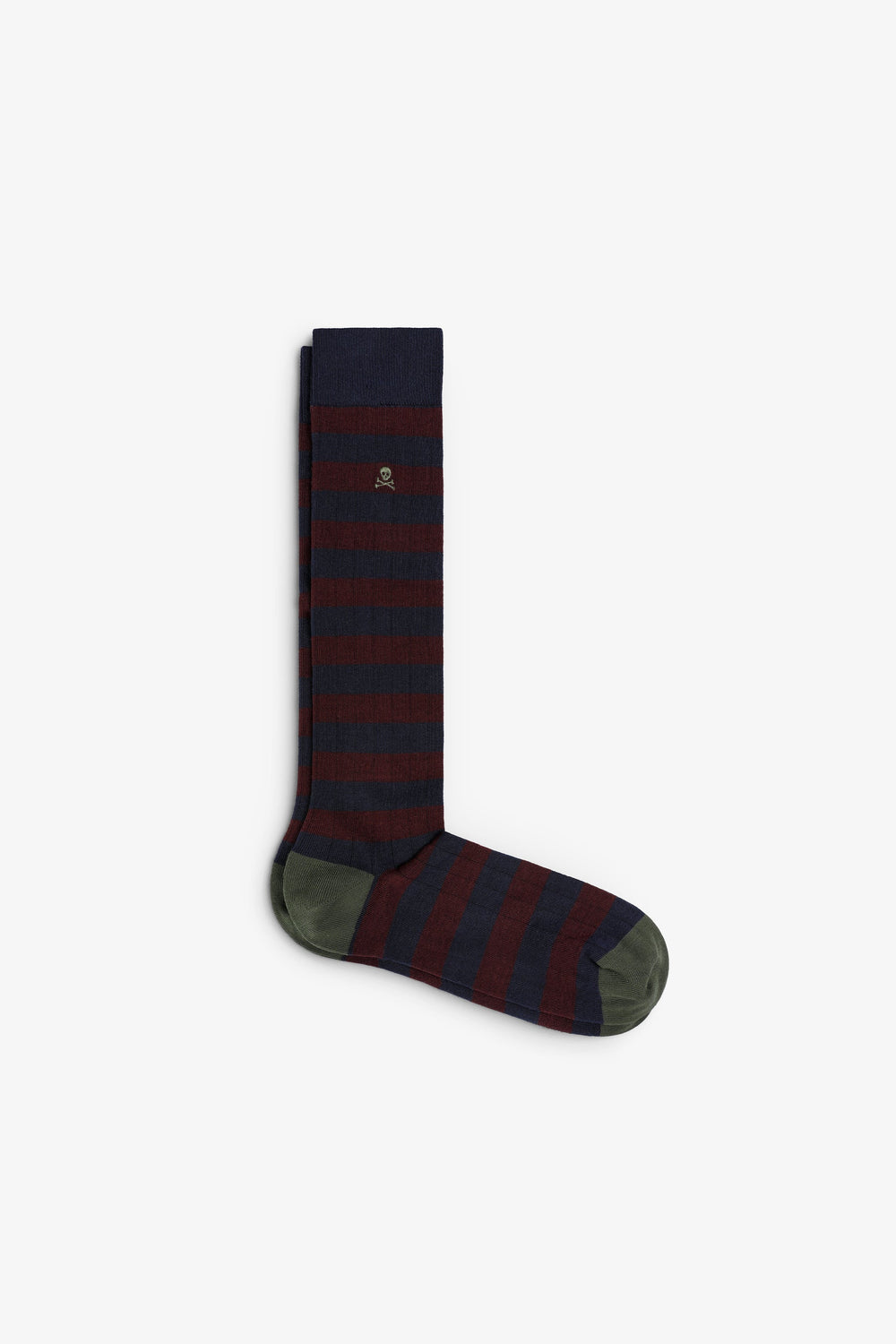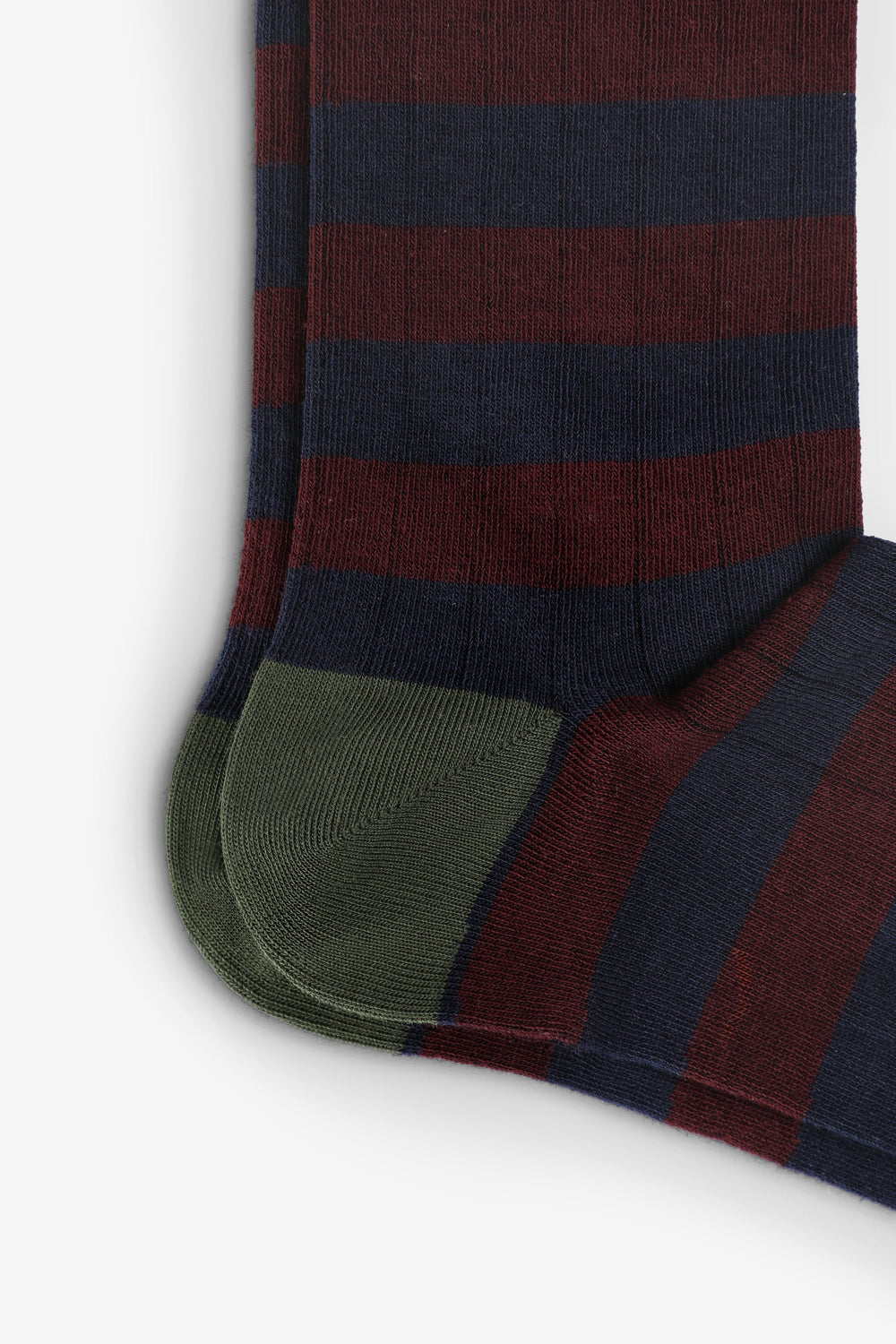 Meias confecionadas em mistura de algodão orgânico. Padrão às riscas. Pormenor de logótipo bordado a contrastar. Altura: 36cm / Comprimento do pé: 23 cm.