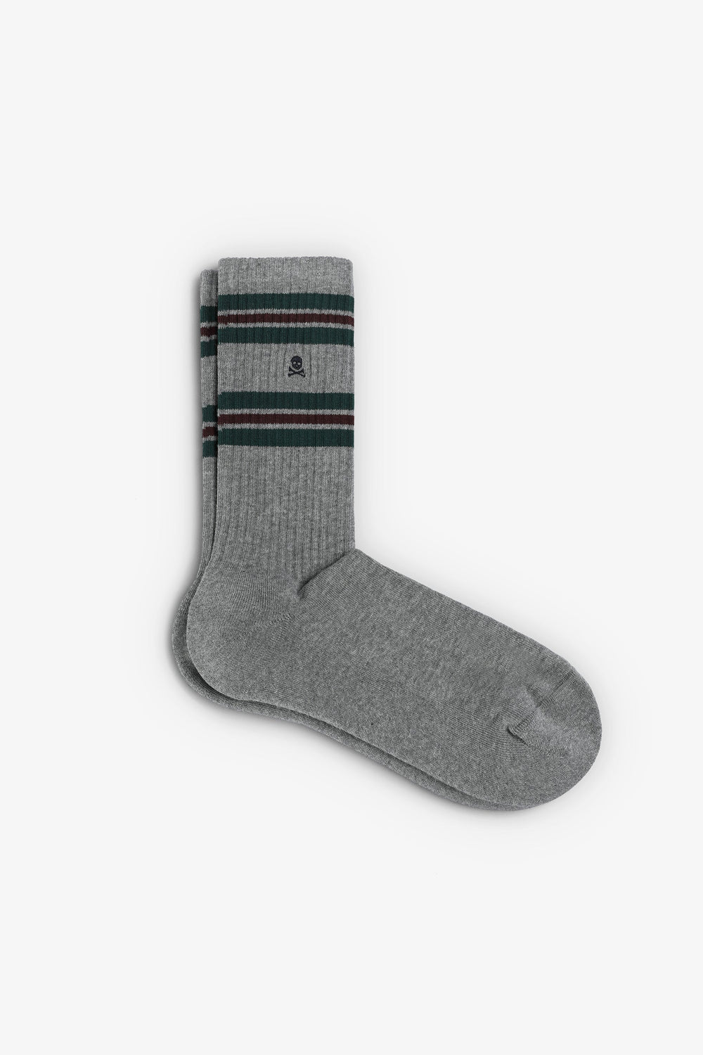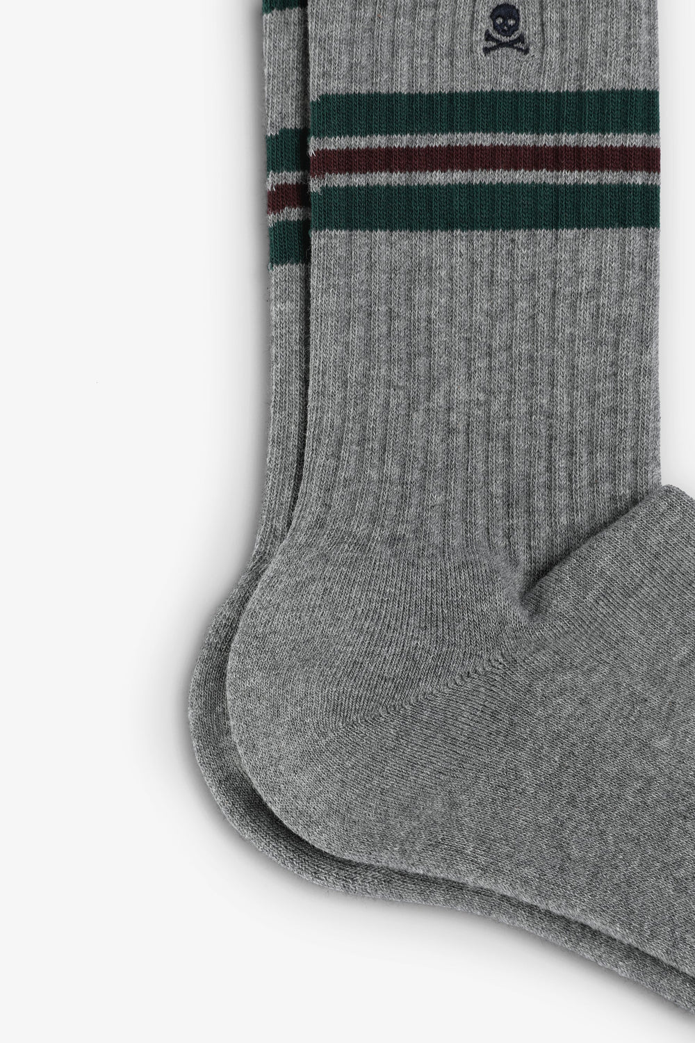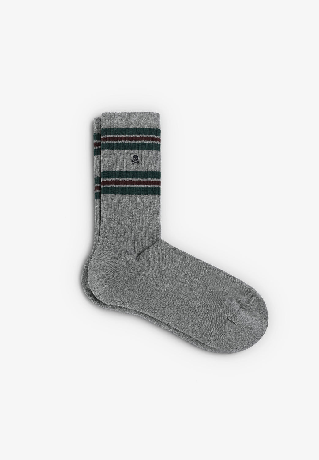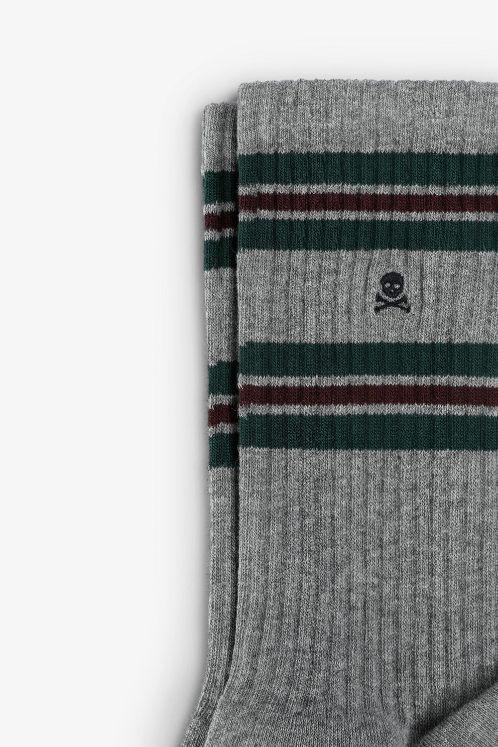 Meias confecionadas em mistura de algodão orgânico. Portmenor de riscas. Pormenor de logótipo bordado a contrastar.