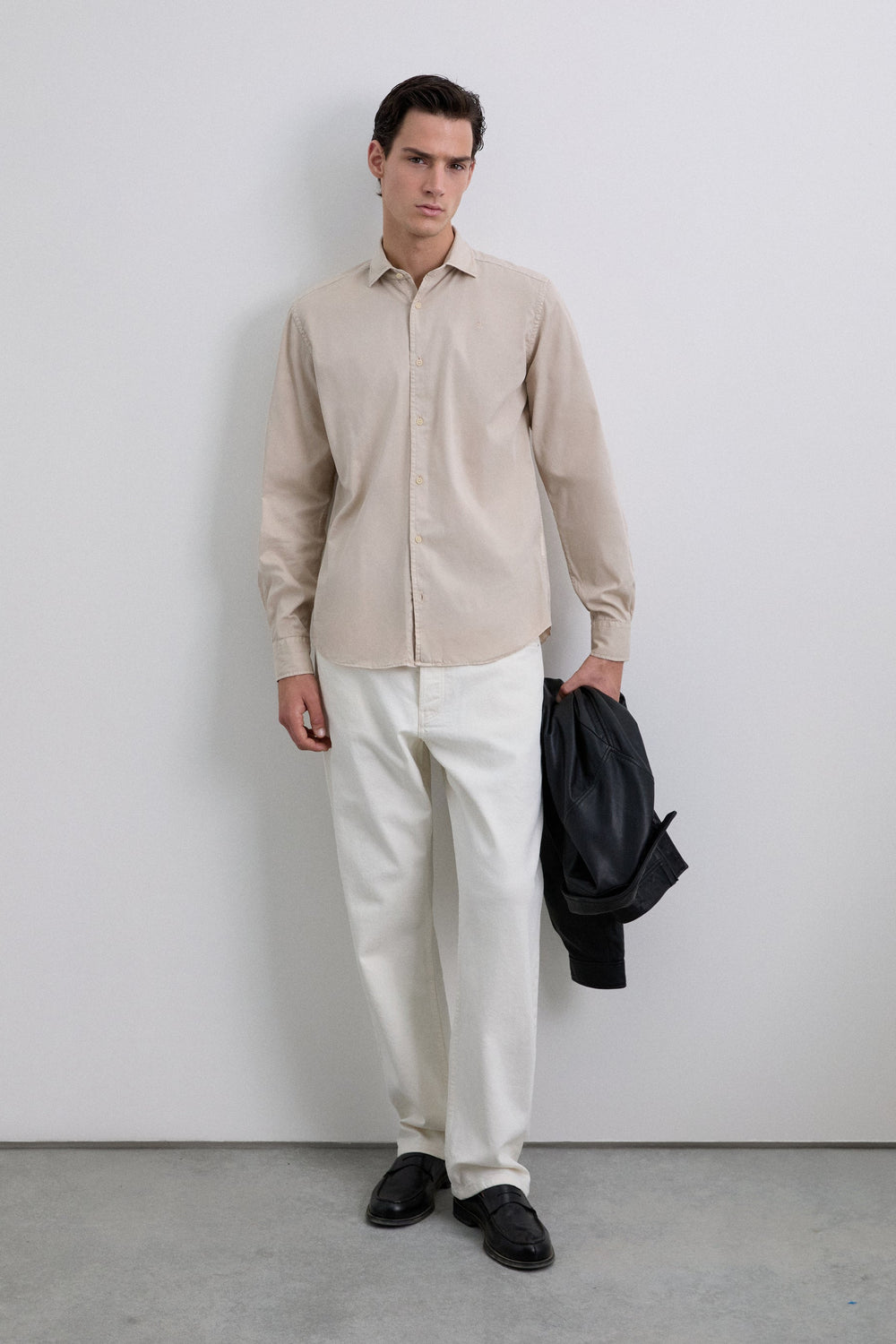 Camisa confecionada em 100% algodão orgânico. Corte regular. Gola italiana. Fecho de botões à frente. Manga comprida com punhos abotoados. Bolso de remendo no peito. Dobra no punho. Pormenor de skull bordada no tom.