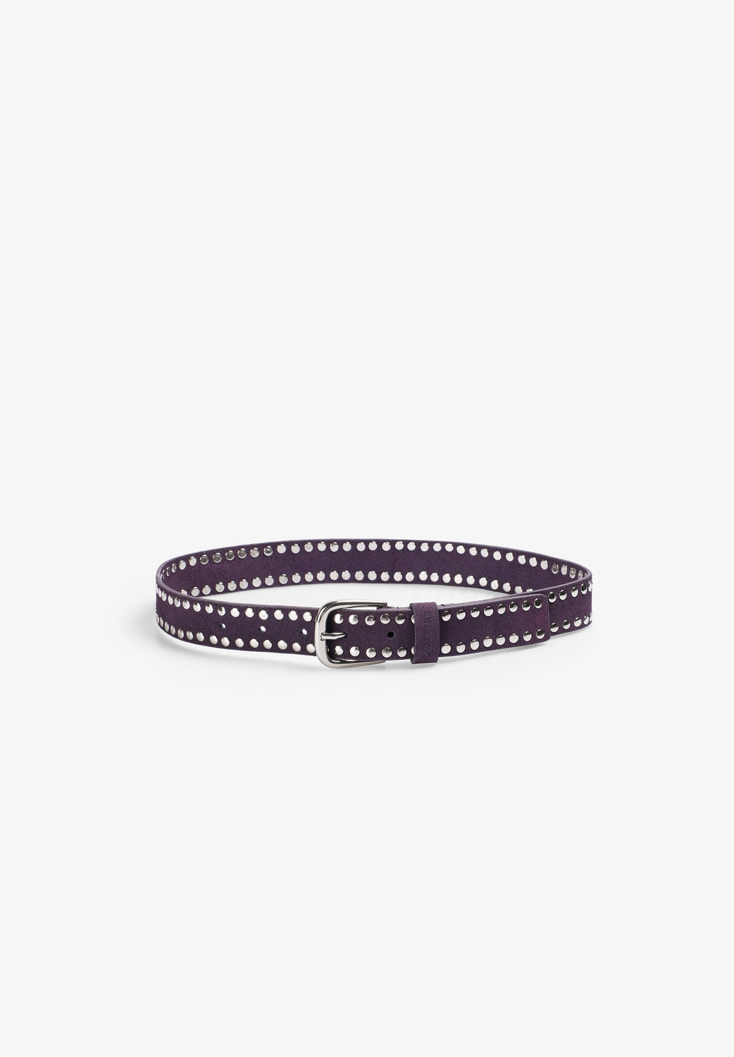 Cinto confecionado em 100% camurça. Pormenor de tachas e fecho com fivela.