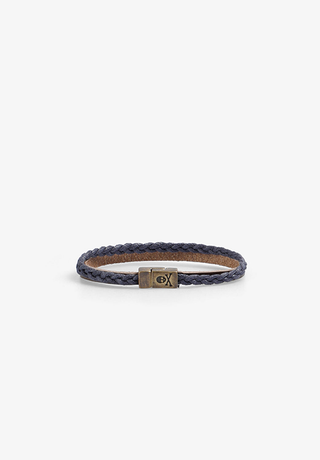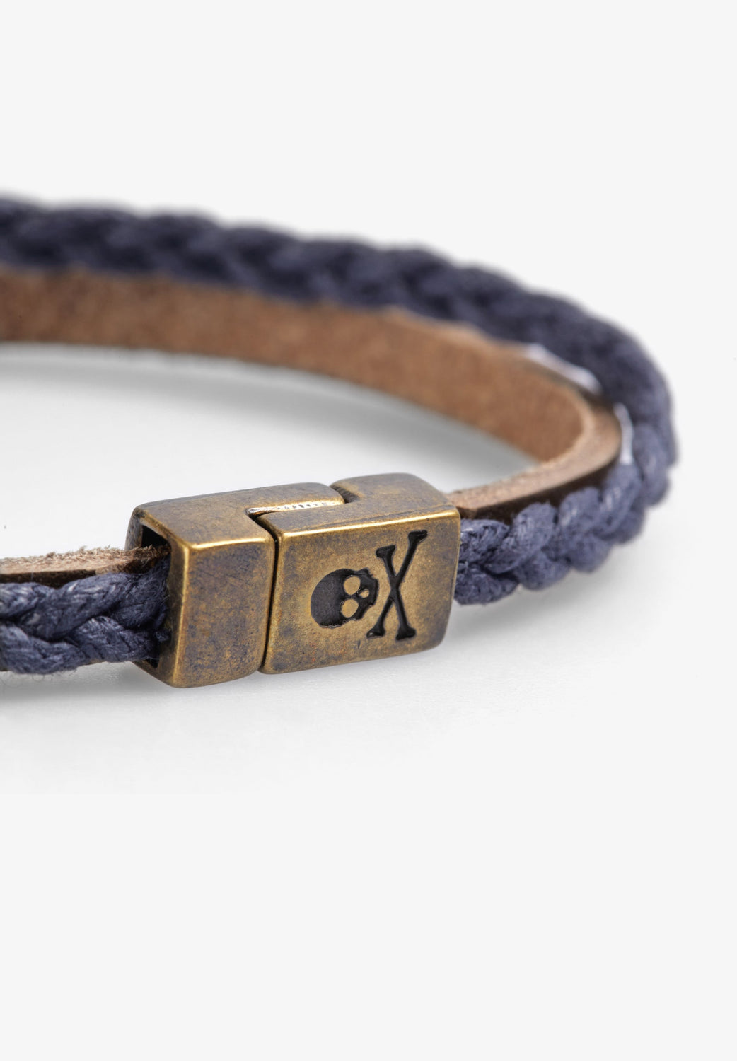 Pulseira de pele confecionada em 100% pele e algodão. Pormenor metálico, skull gravada e fecho de pressão.