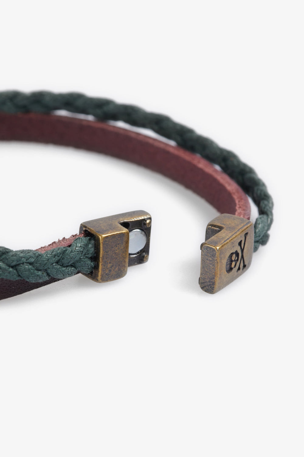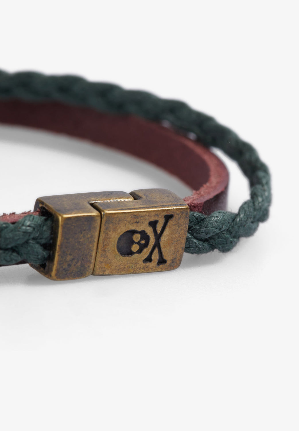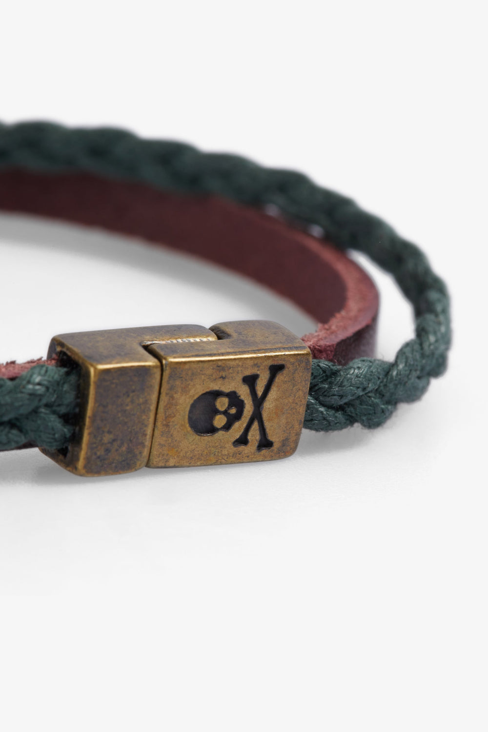 Pulseira de pele confecionada em 100% pele e algodão. Pormenor metálico, skull gravada e fecho de pressão.