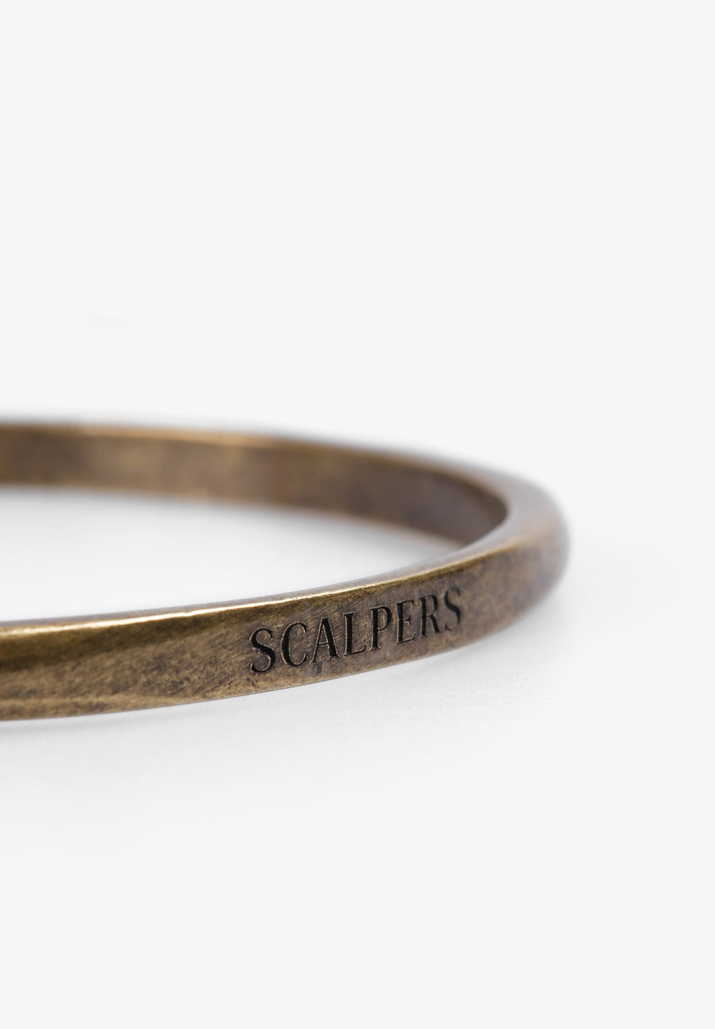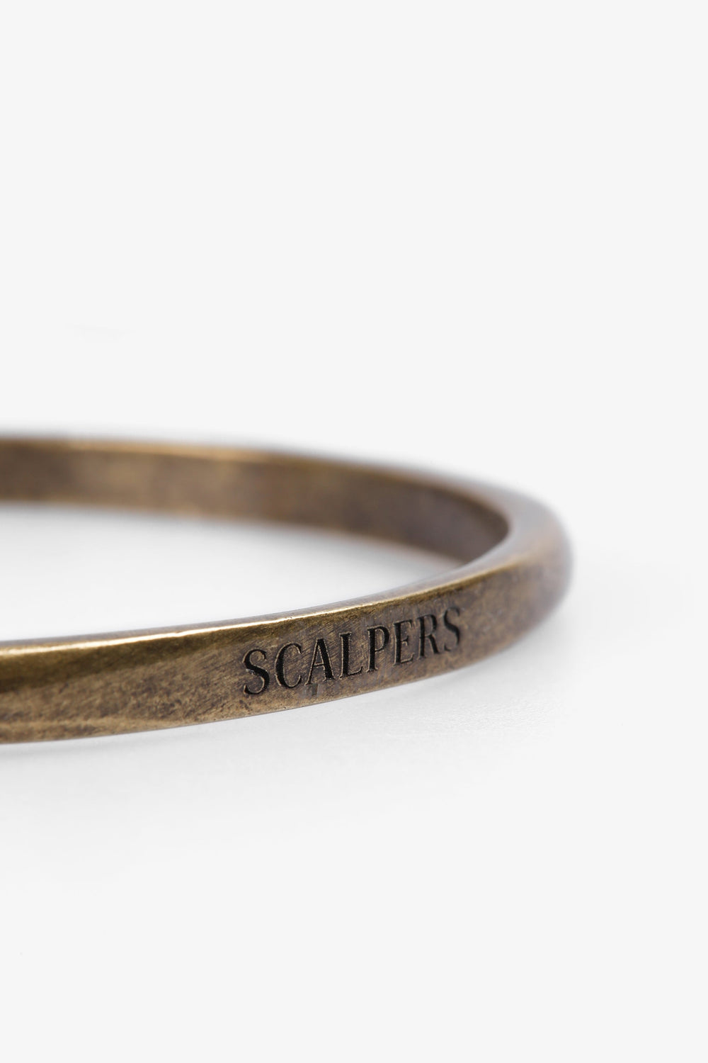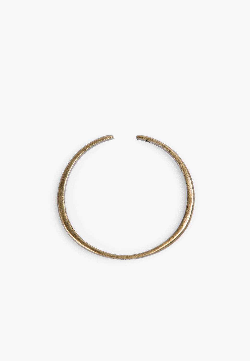 Pulseira confecionada em latão com acabamento em ouro velho. Logótipo gravado à frente.