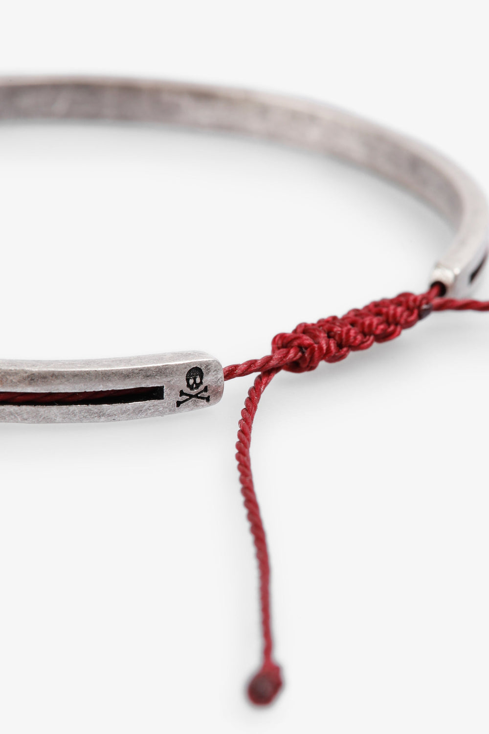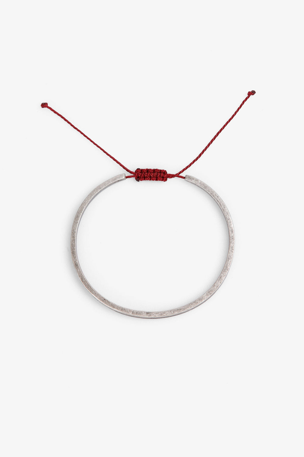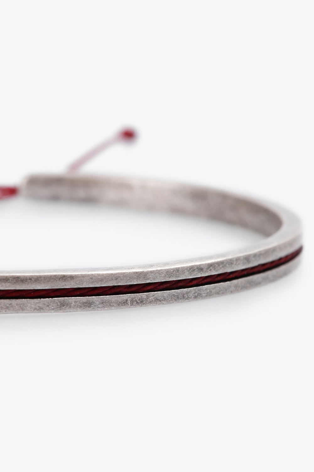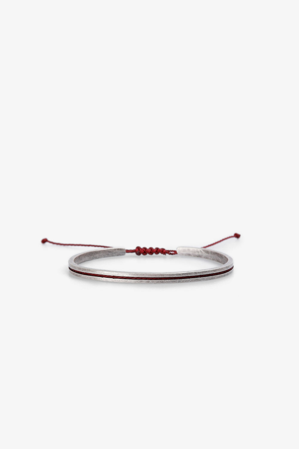Pulseira confecionada em latão com acabamento prateado. Risca em contraste. Ajustável no pulso.