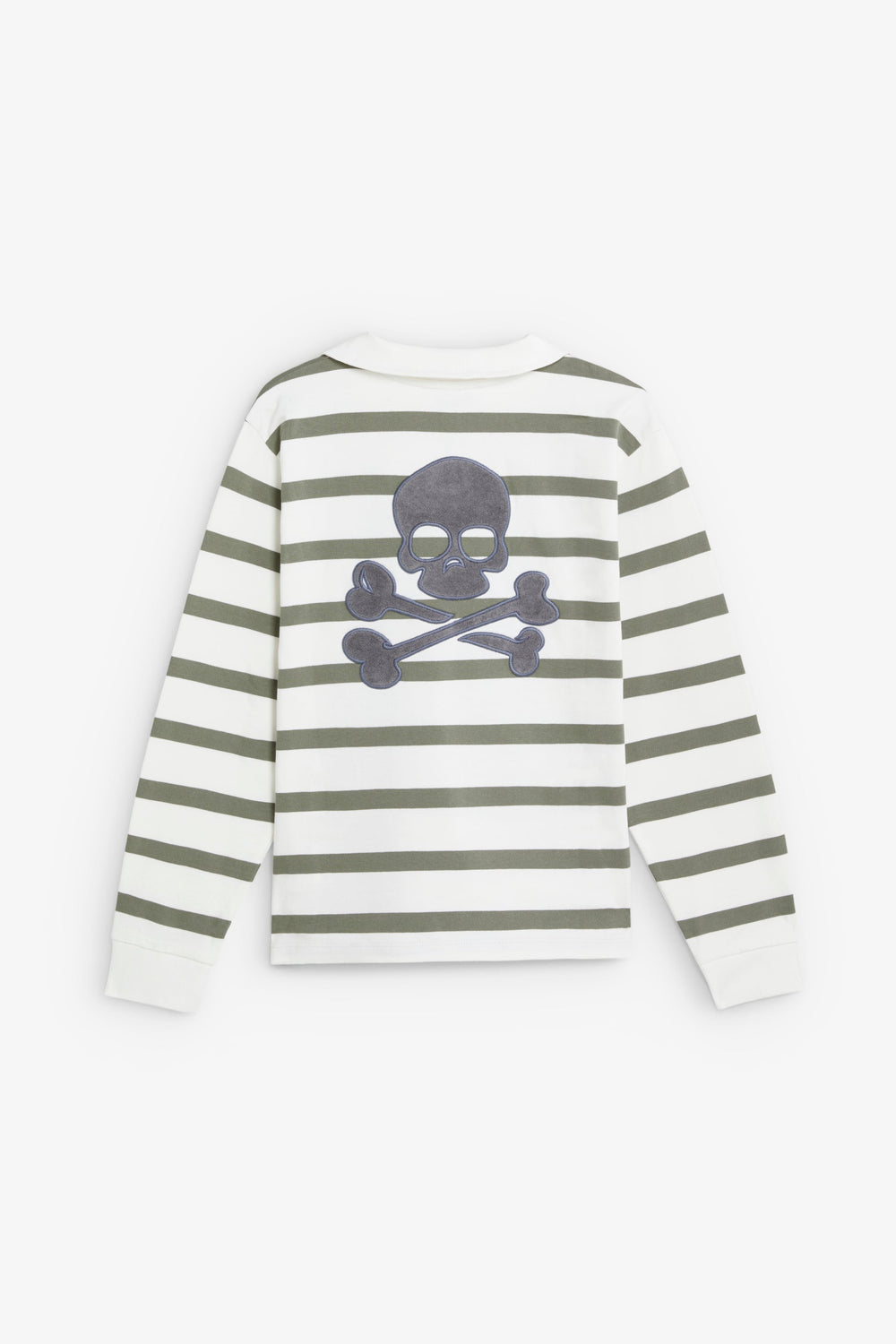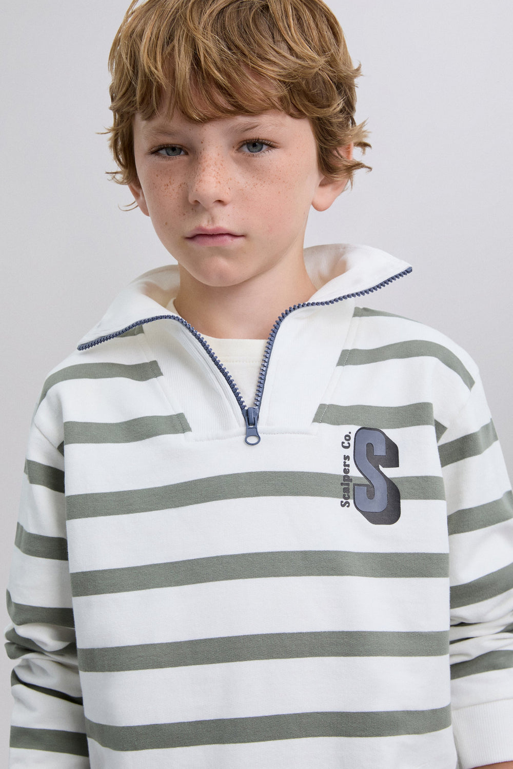 Sweatshirt com padrão às riscas, confecionada em 100% algodão BCI. Gola com fecho com meio fecho de correr. Corte Regular Fit. Manga comprida. Dois bolsos à frente. Motivo bordado no peito e skull nas costas. Acabamentos em nervuras.