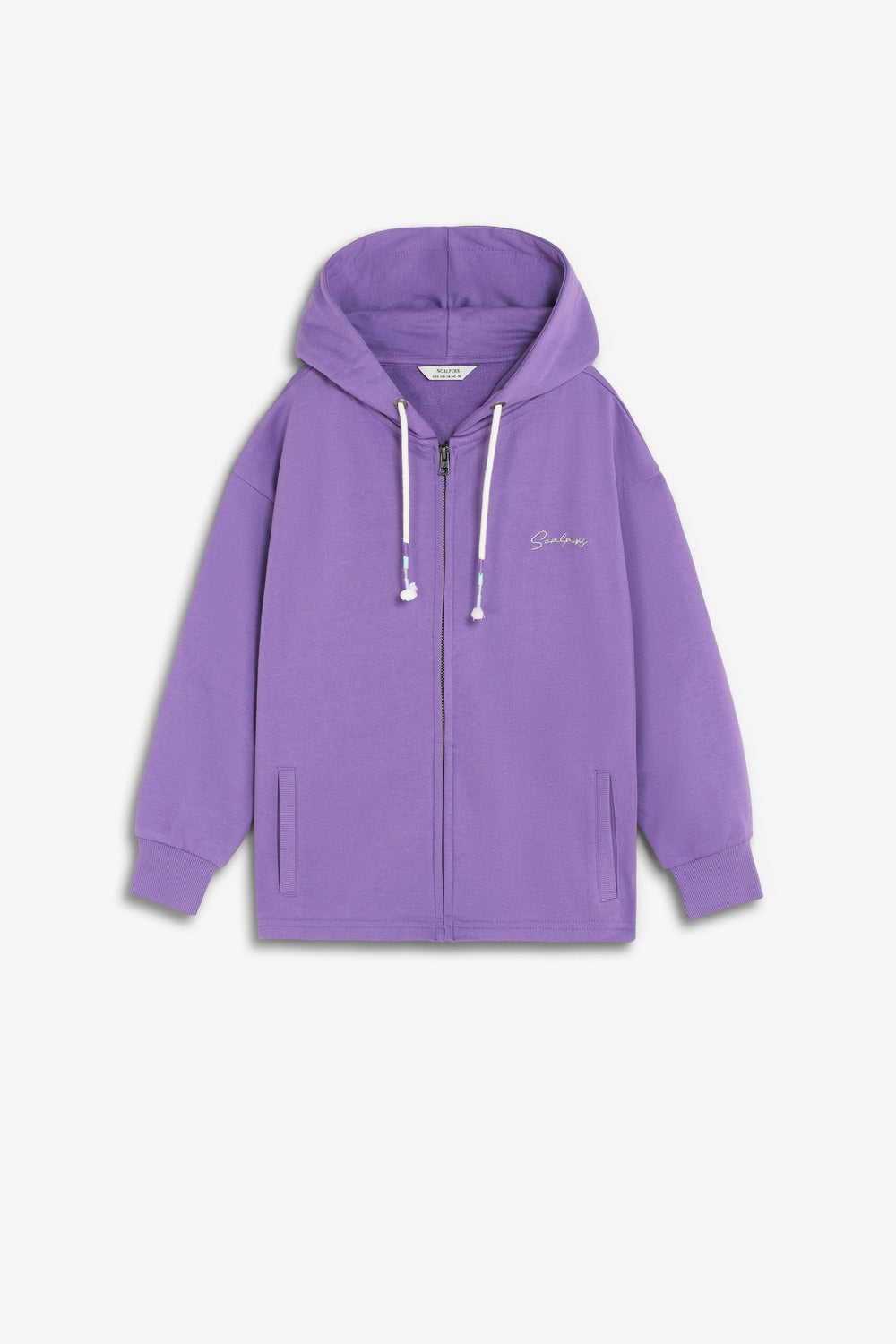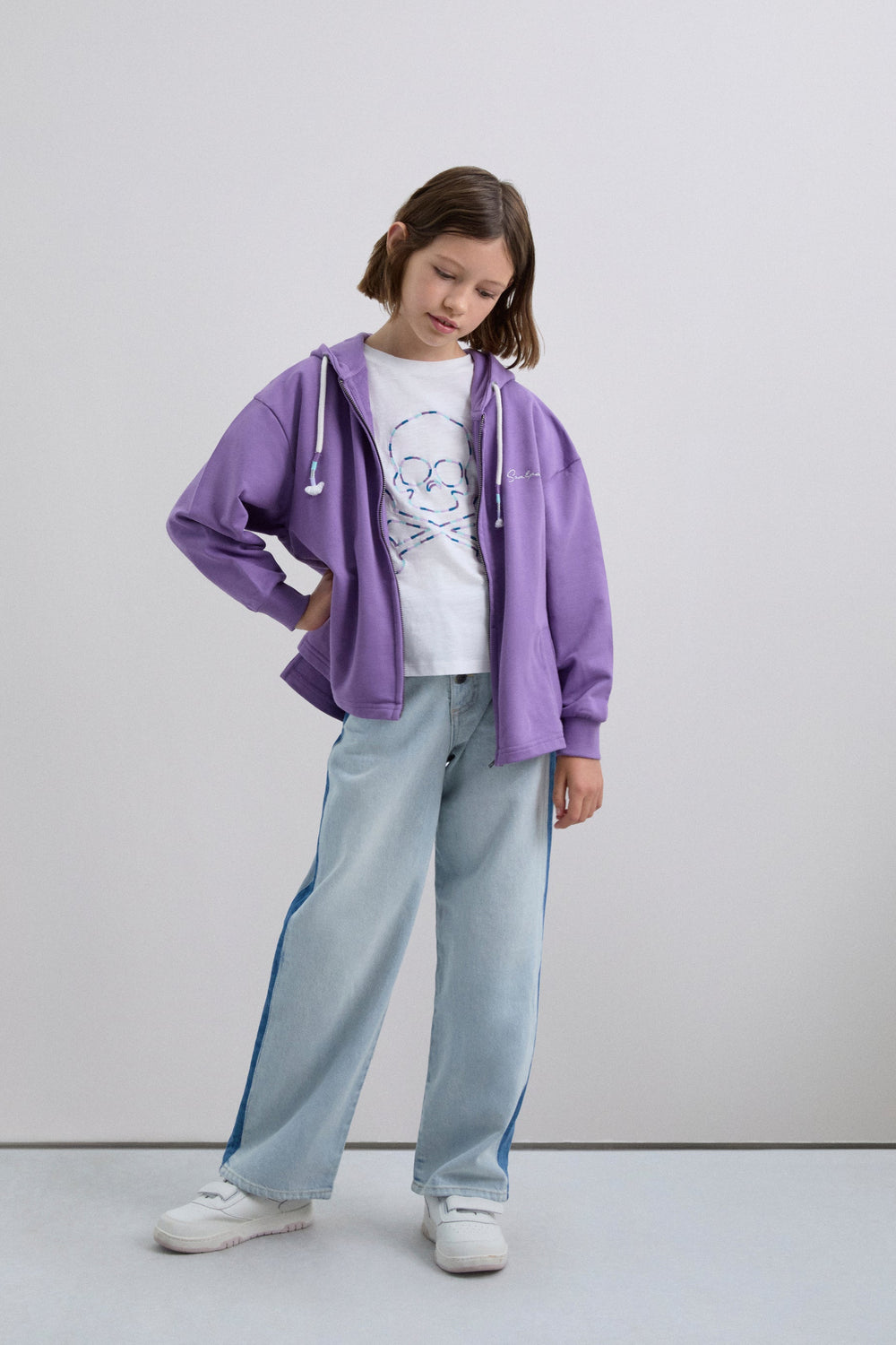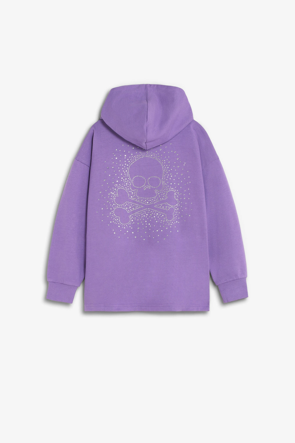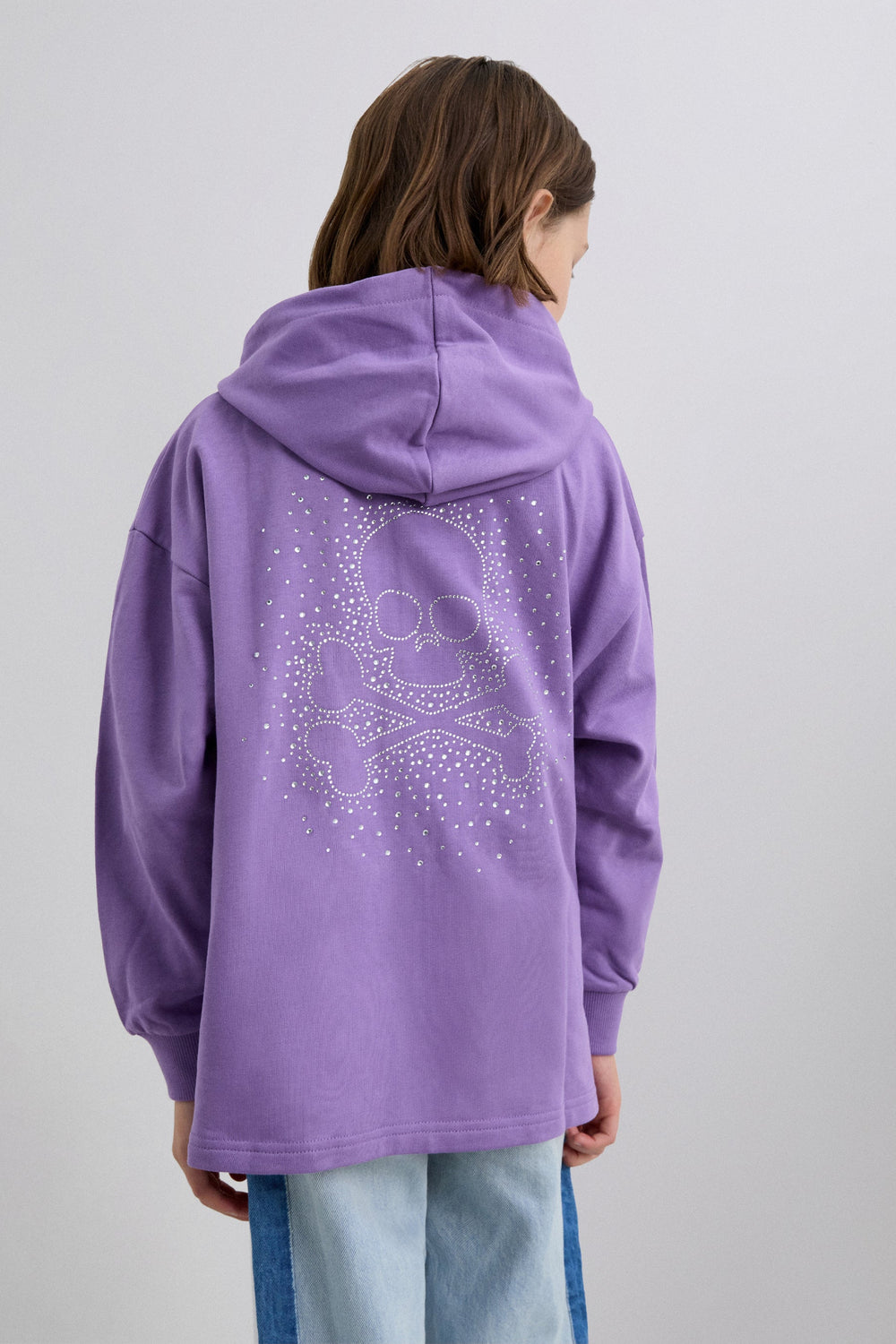 Sweatshirt com capuz ajustável com cordão. Fecho frontal com fecho de correr. Manga comprida terminada em nervuras. Logótipo bordado no peito e caveira com tachas nas costas.