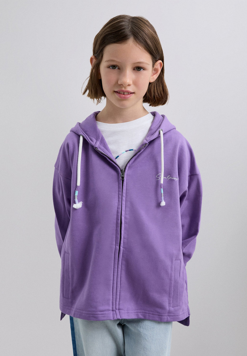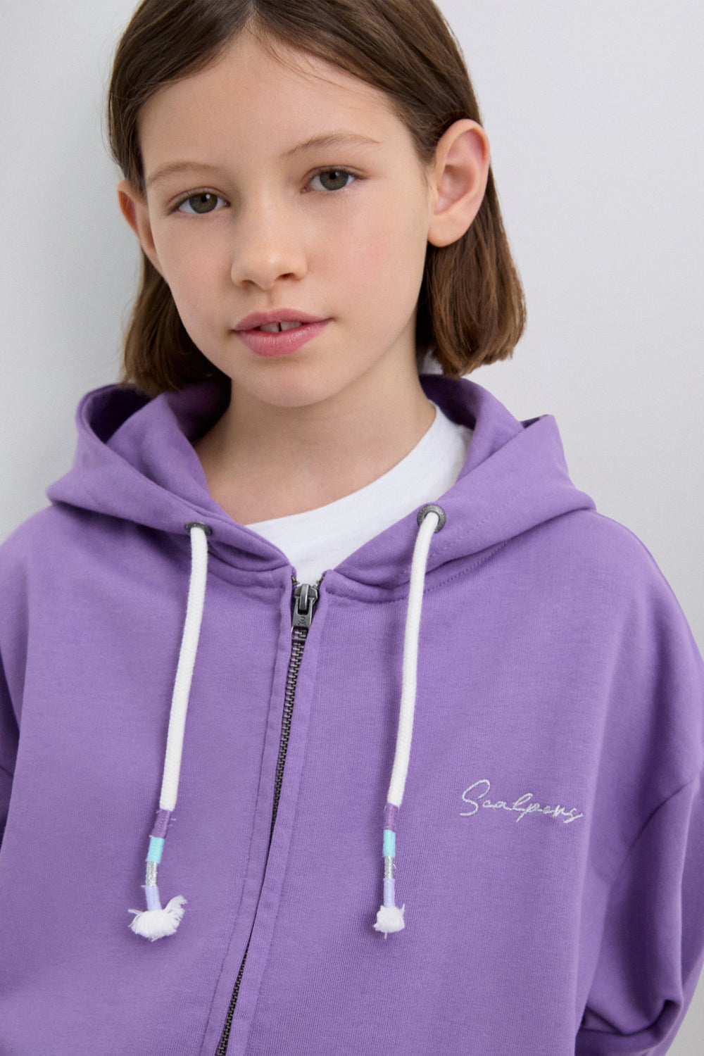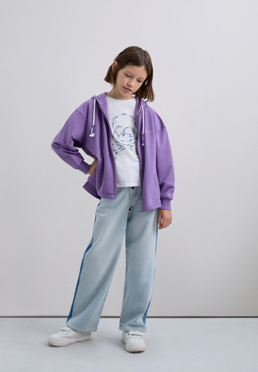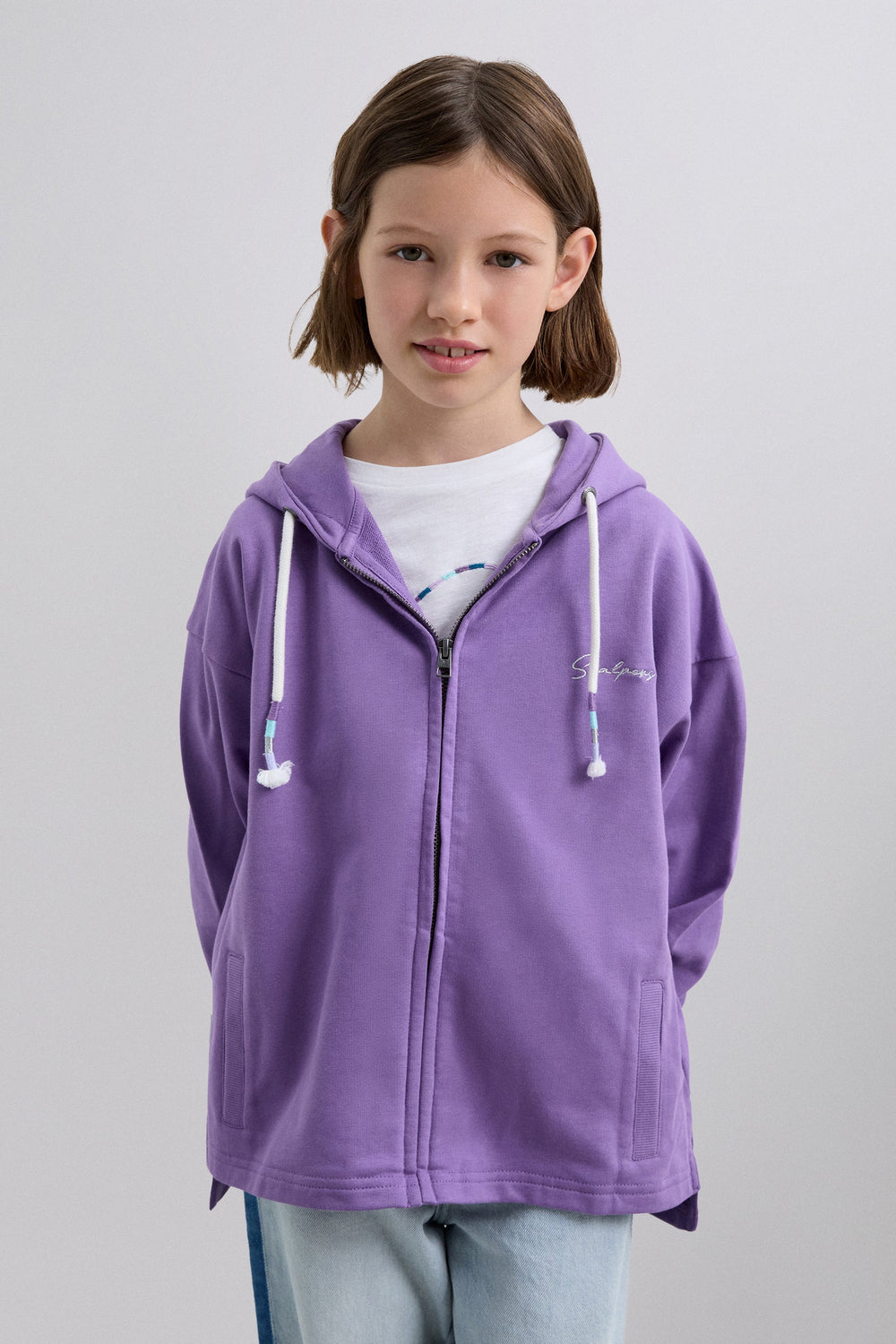 Sweatshirt com capuz ajustável com cordão. Fecho frontal com fecho de correr. Manga comprida terminada em nervuras. Logótipo bordado no peito e caveira com tachas nas costas.