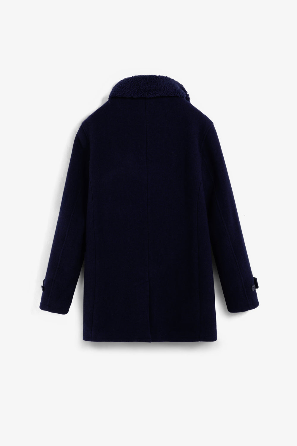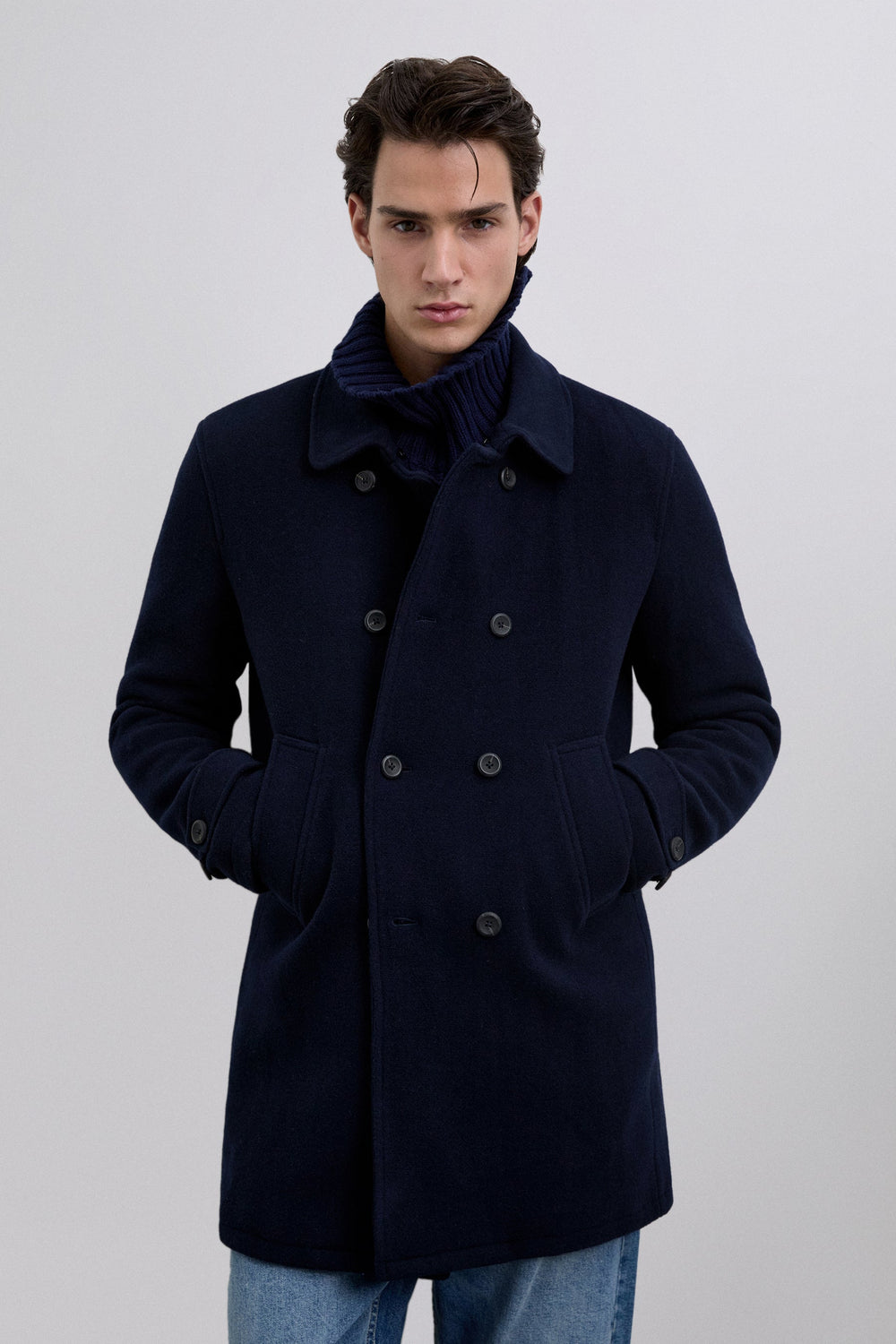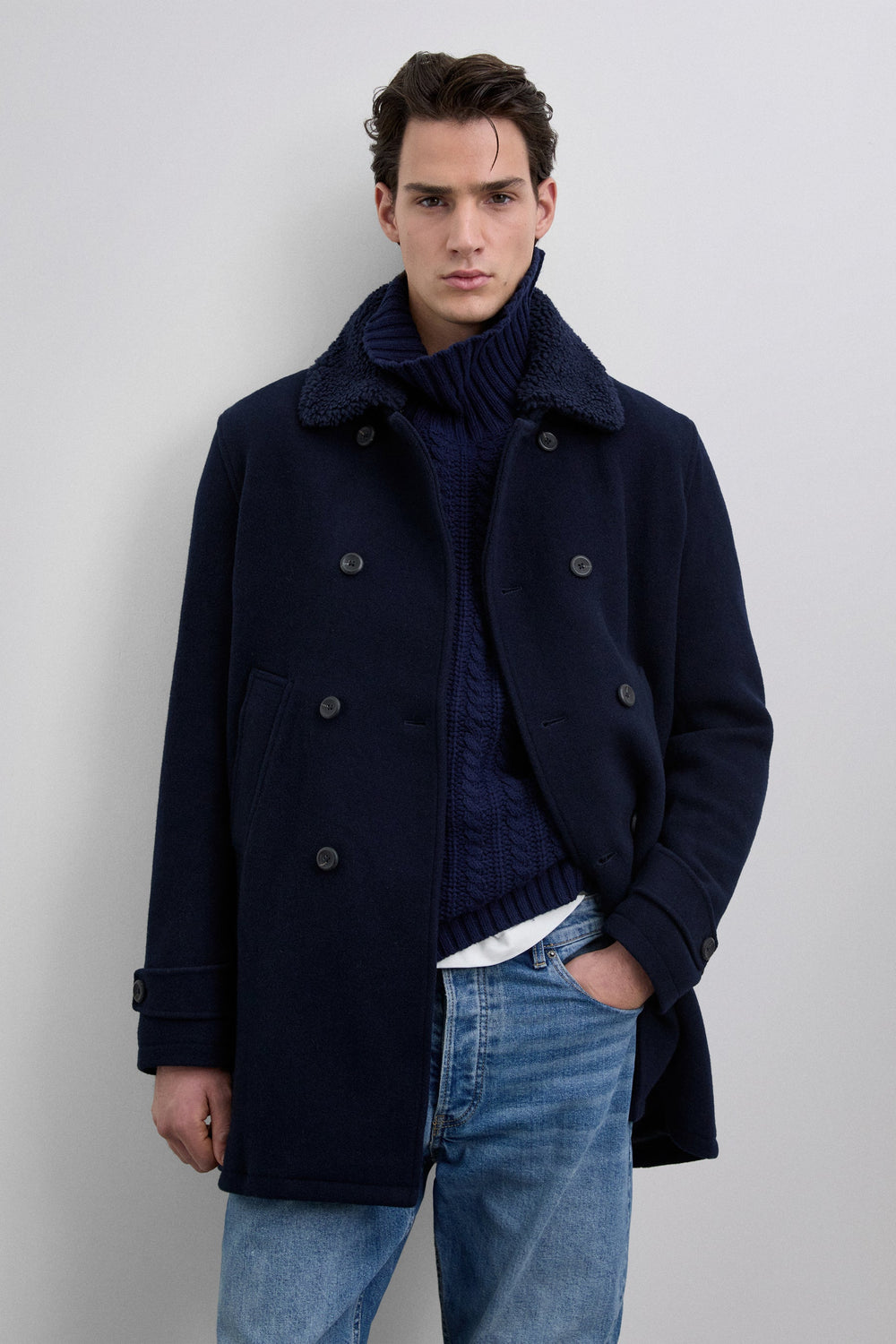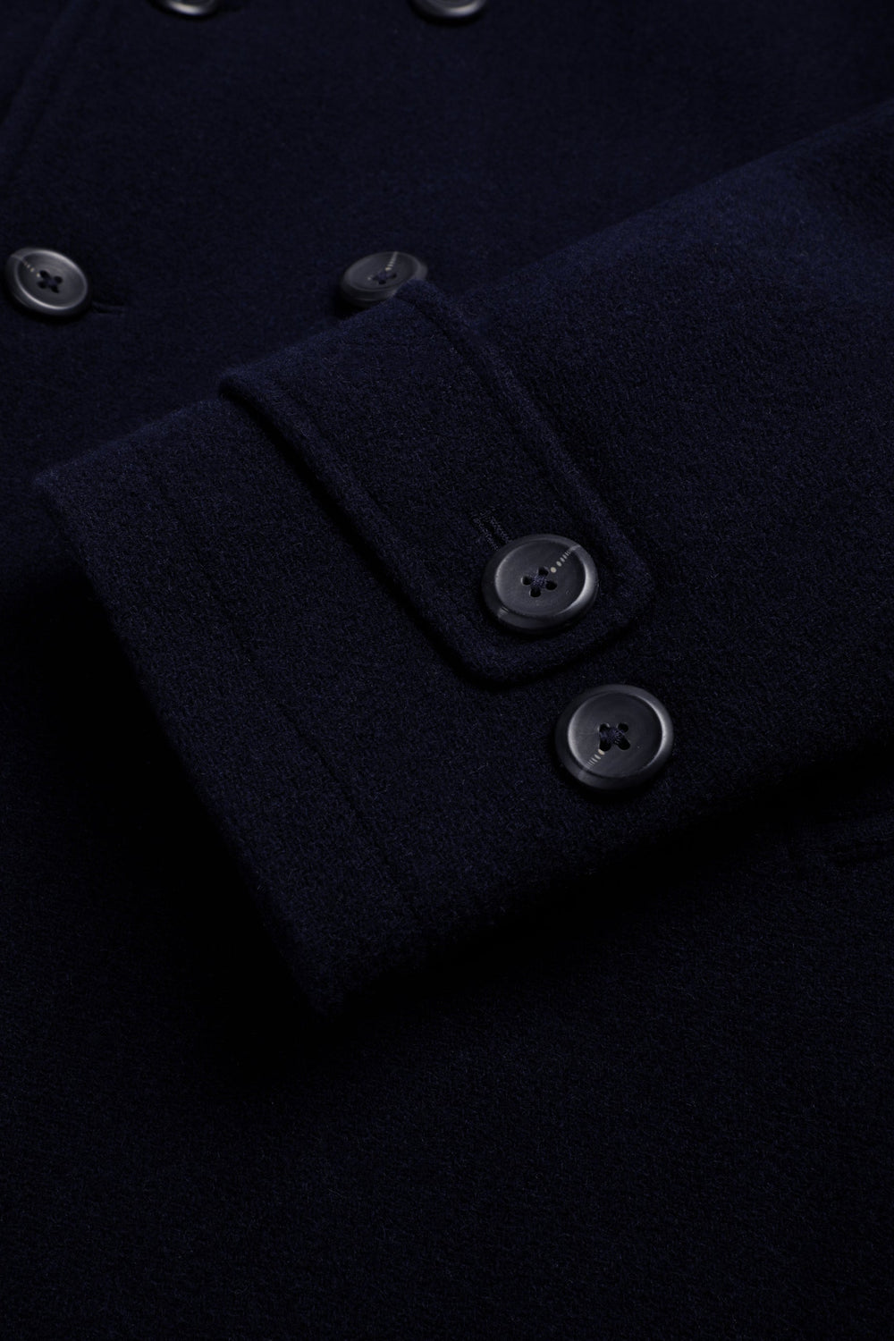 Casaco cruzado confecionado em lã. Fecho com botões, pormenor de punho com presilha. Dois bolsos de linhas vivas amplos e inclinados. Bolso interior. Pormenor desmontável na gola.