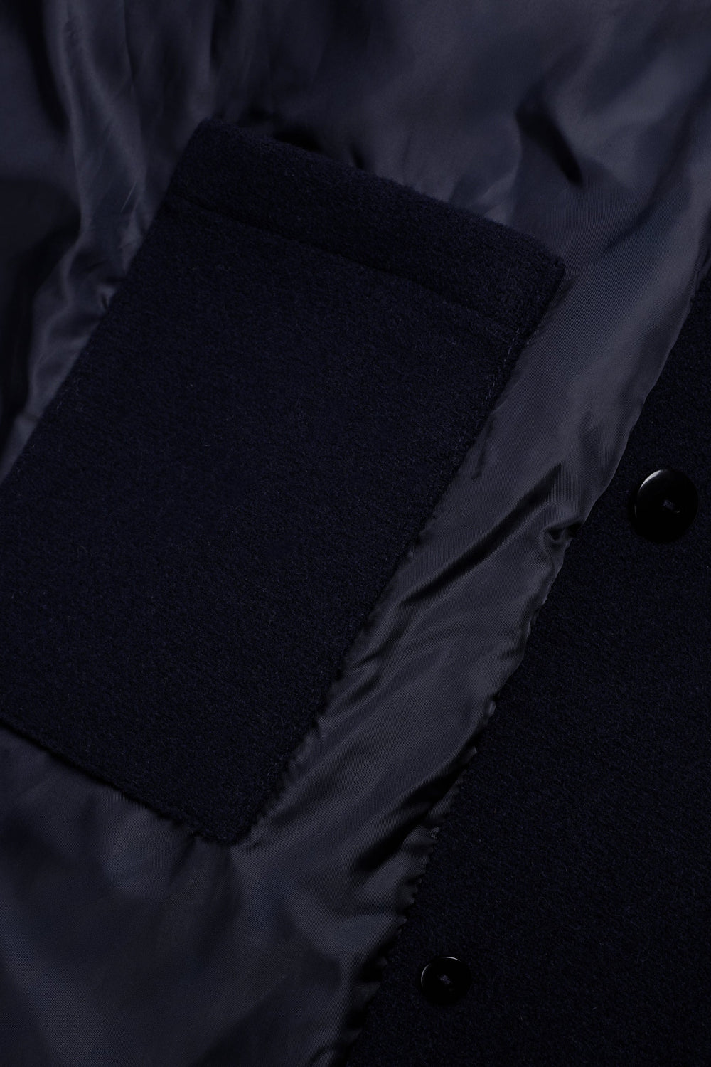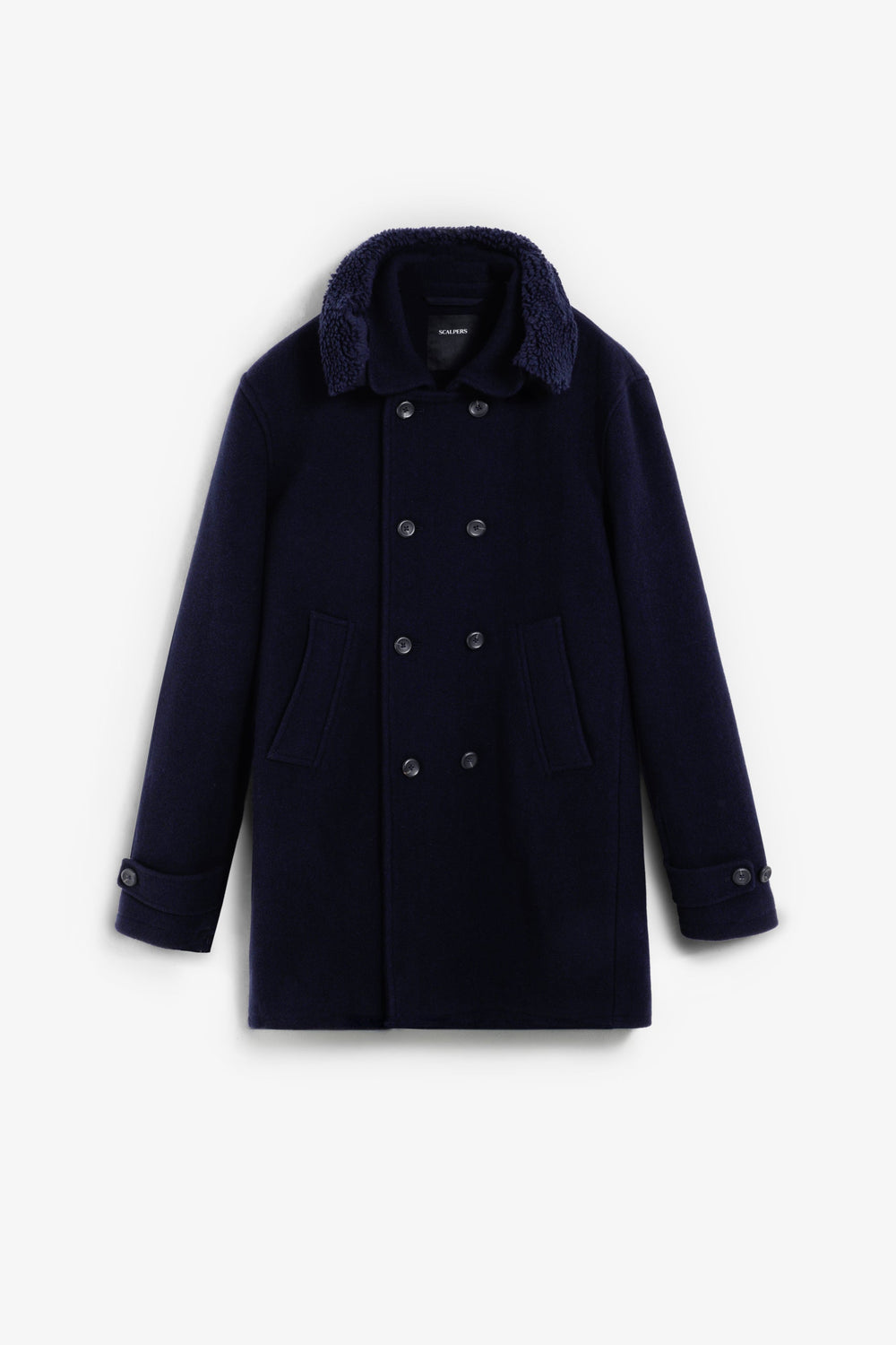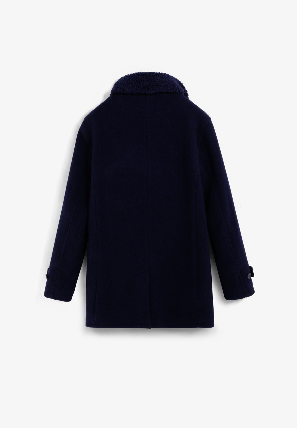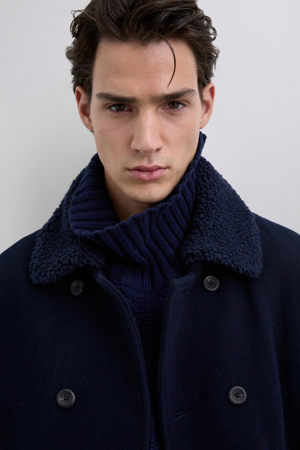 Casaco cruzado confecionado em lã. Fecho com botões, pormenor de punho com presilha. Dois bolsos de linhas vivas amplos e inclinados. Bolso interior. Pormenor desmontável na gola.