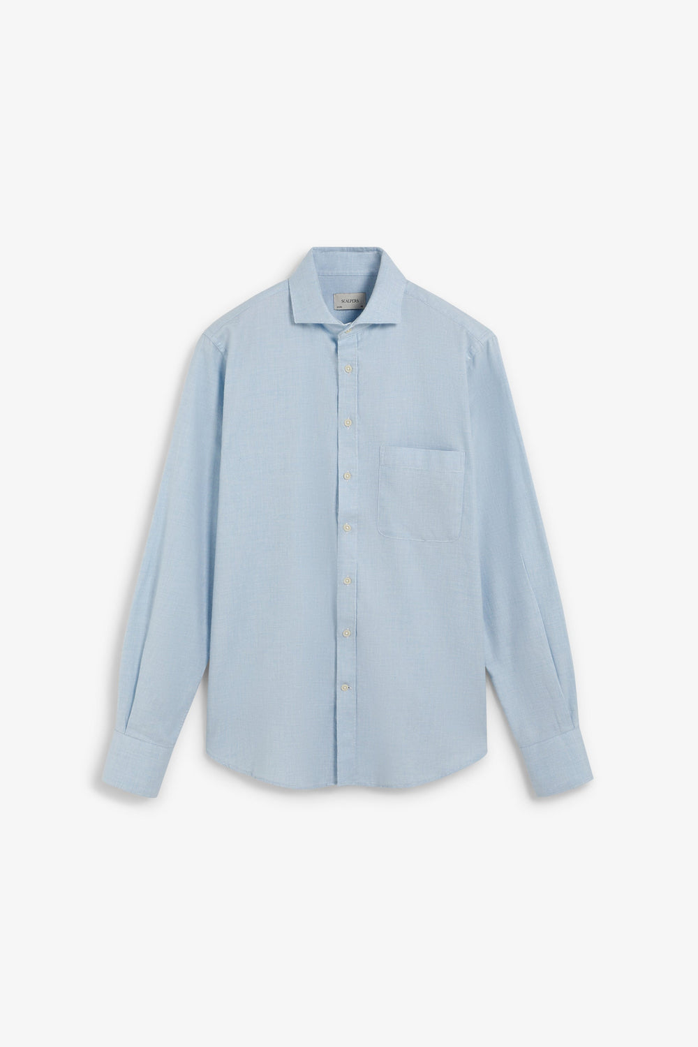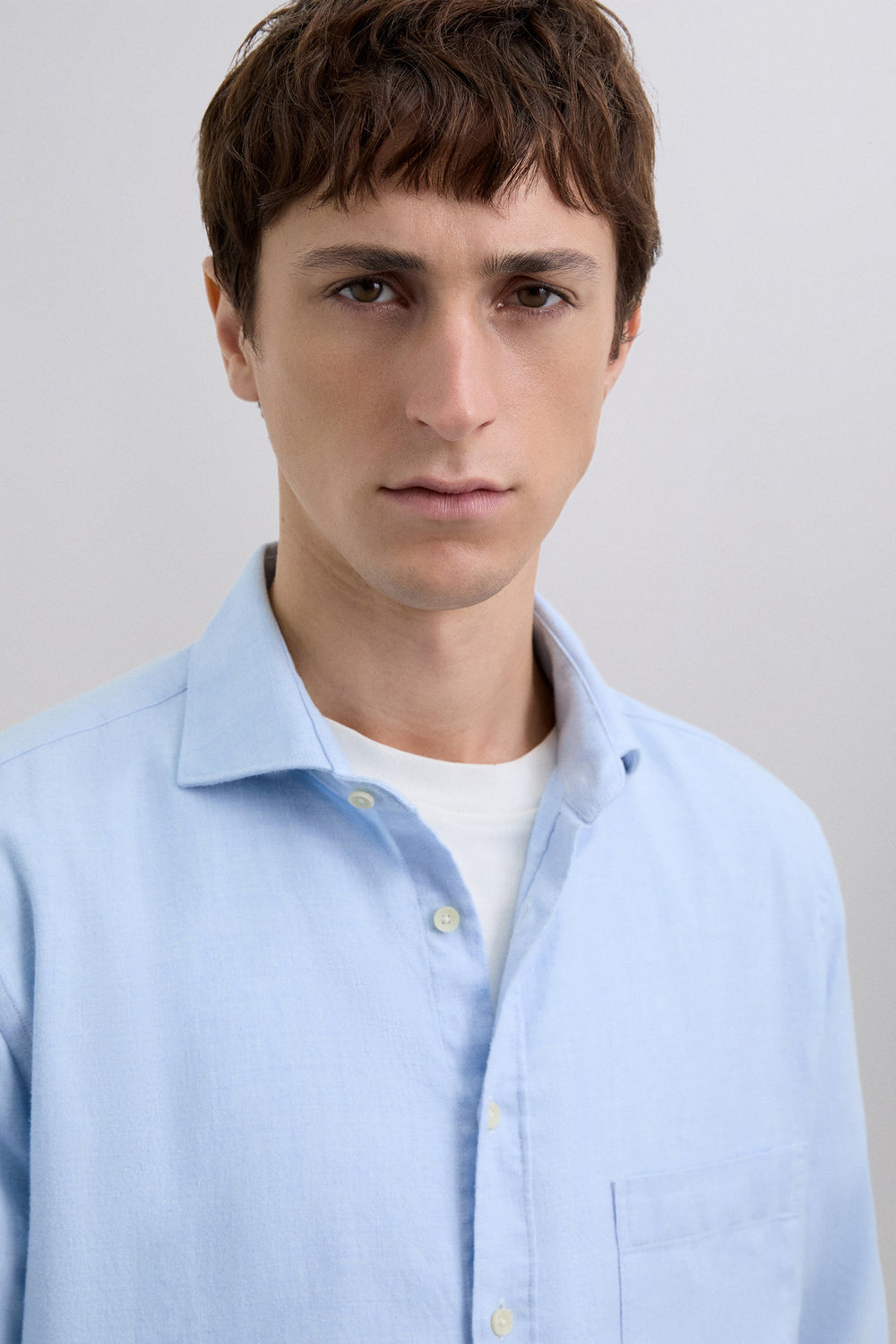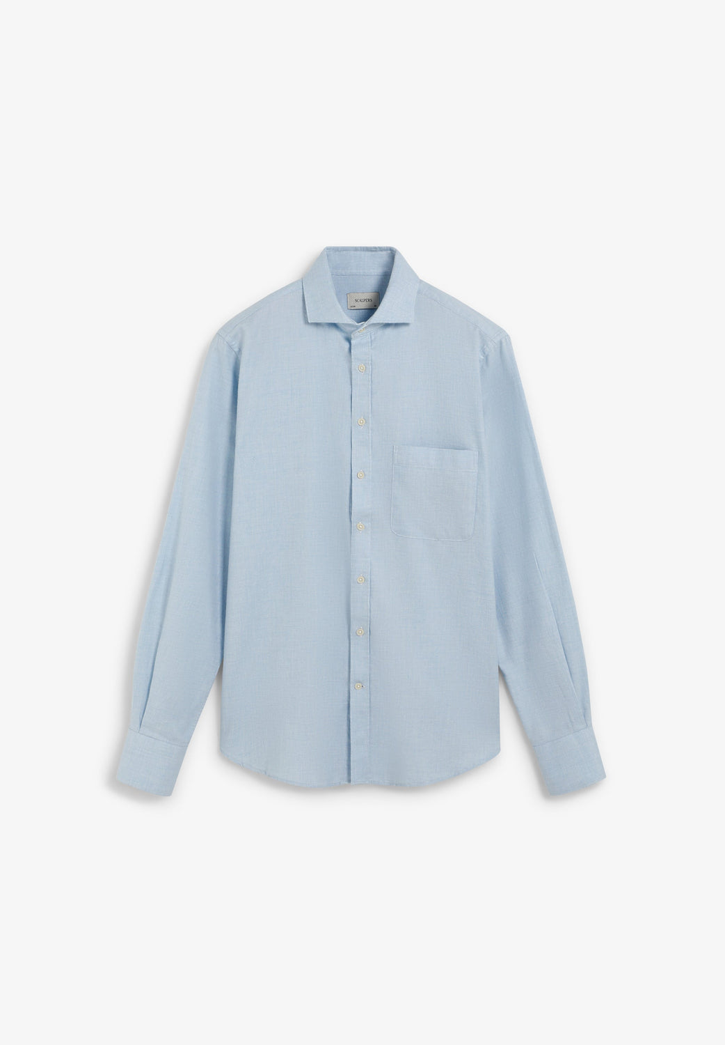 Camisa confecionada em tecido 100% algodão. Slim Fit. Manga comprida. Fecho frontal e nos punhos com abotoadura. Pormenor de bolso de remendo no peito.