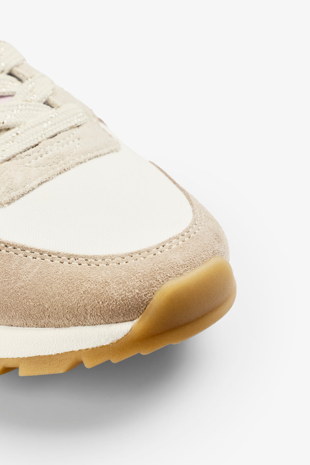 Sapatilhas confecionadas em mistura de camurça e nylon. Estilo running. Combinação de cores e materiais no corte. Sola em phylon e TPR em contraste. Fecho com cordões. Pormenor de logótipo na lateral e na língua.