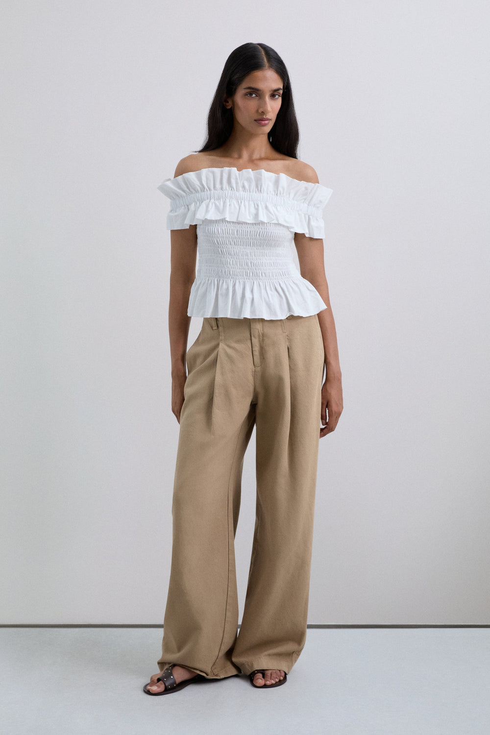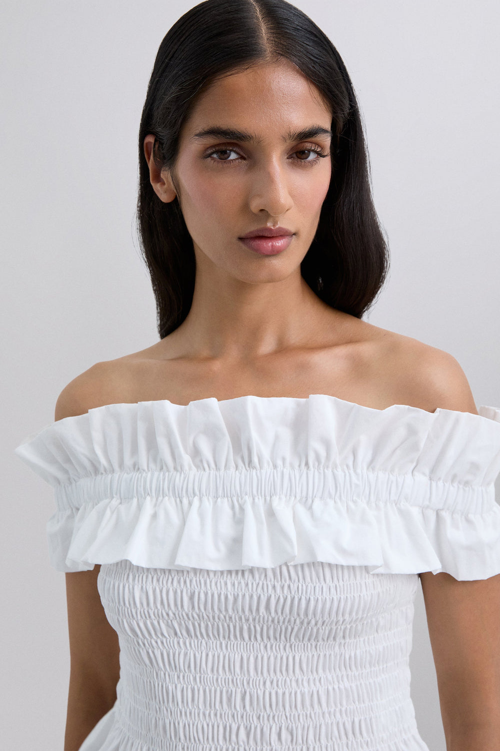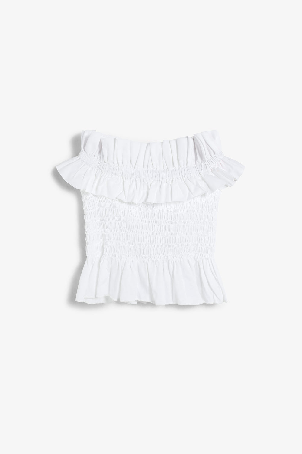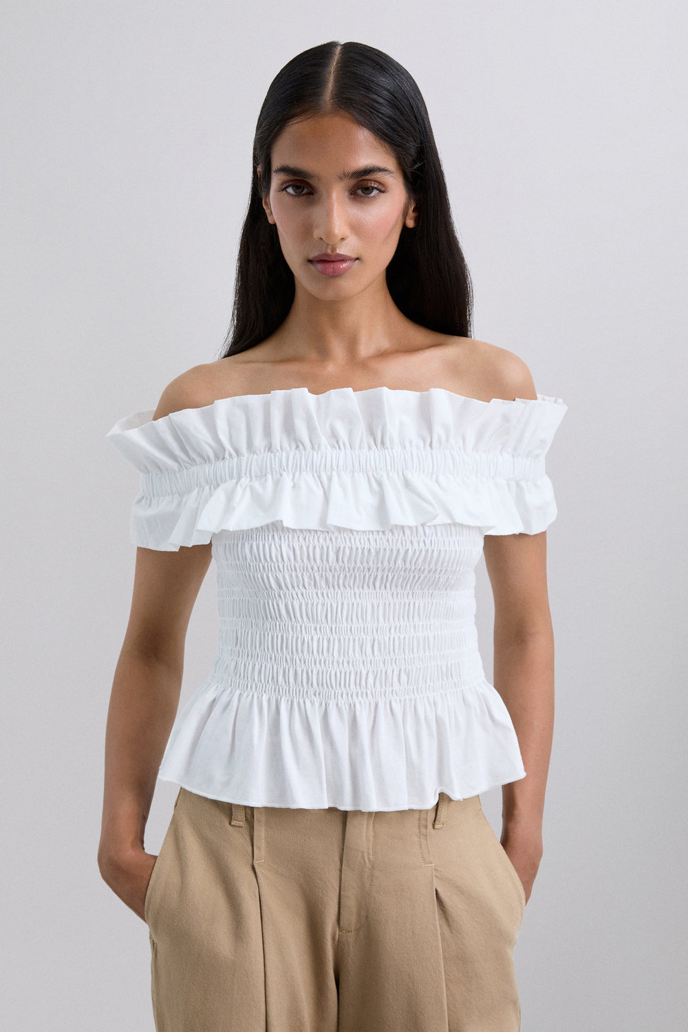 Top confecioando em algodão 100% BCI. Corte Slim Fit. Ombro descaído com pormenor de franzidos e folhos. Corpo com favos de mel.