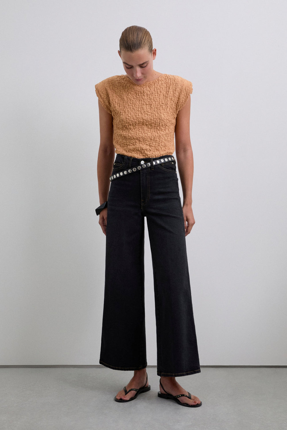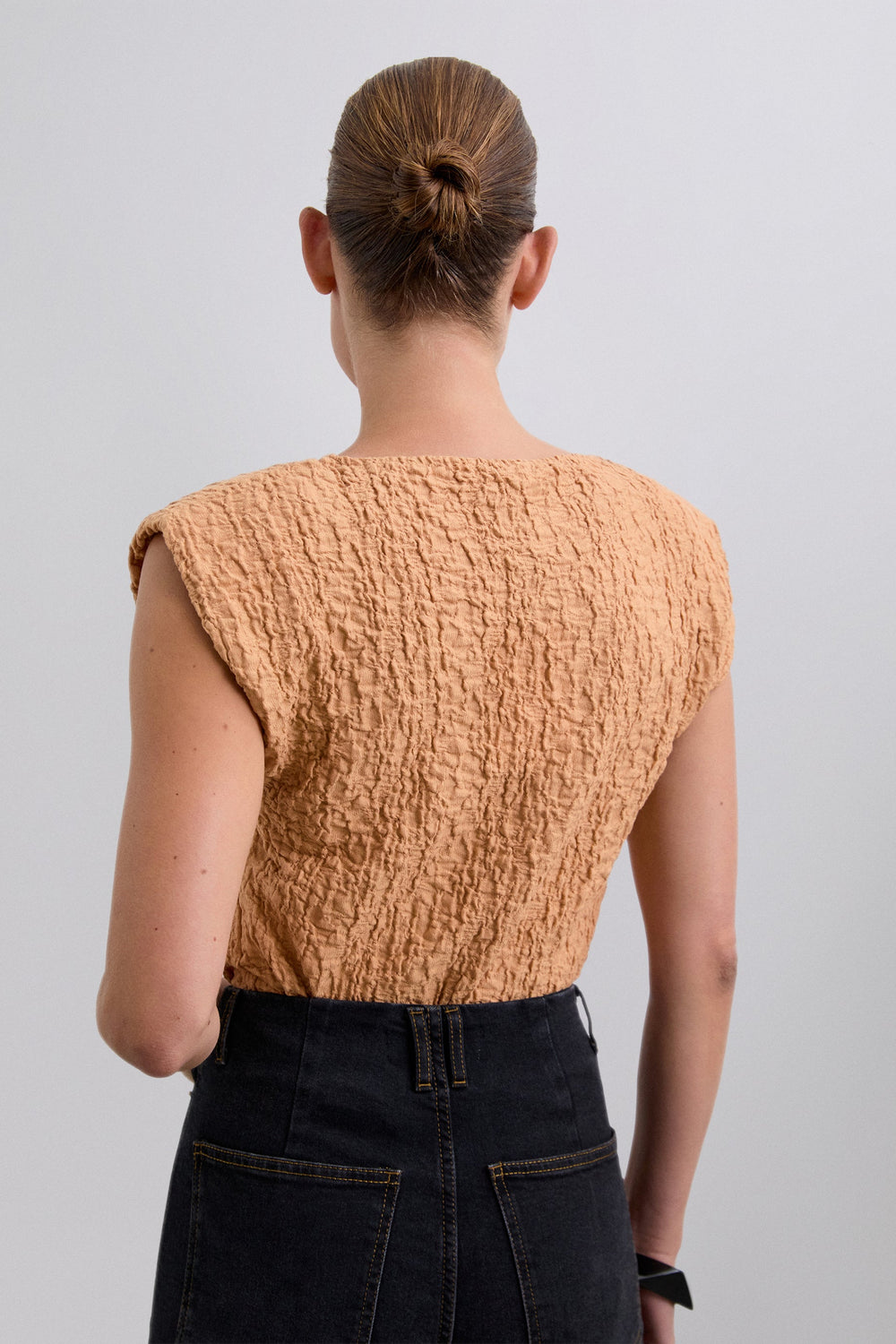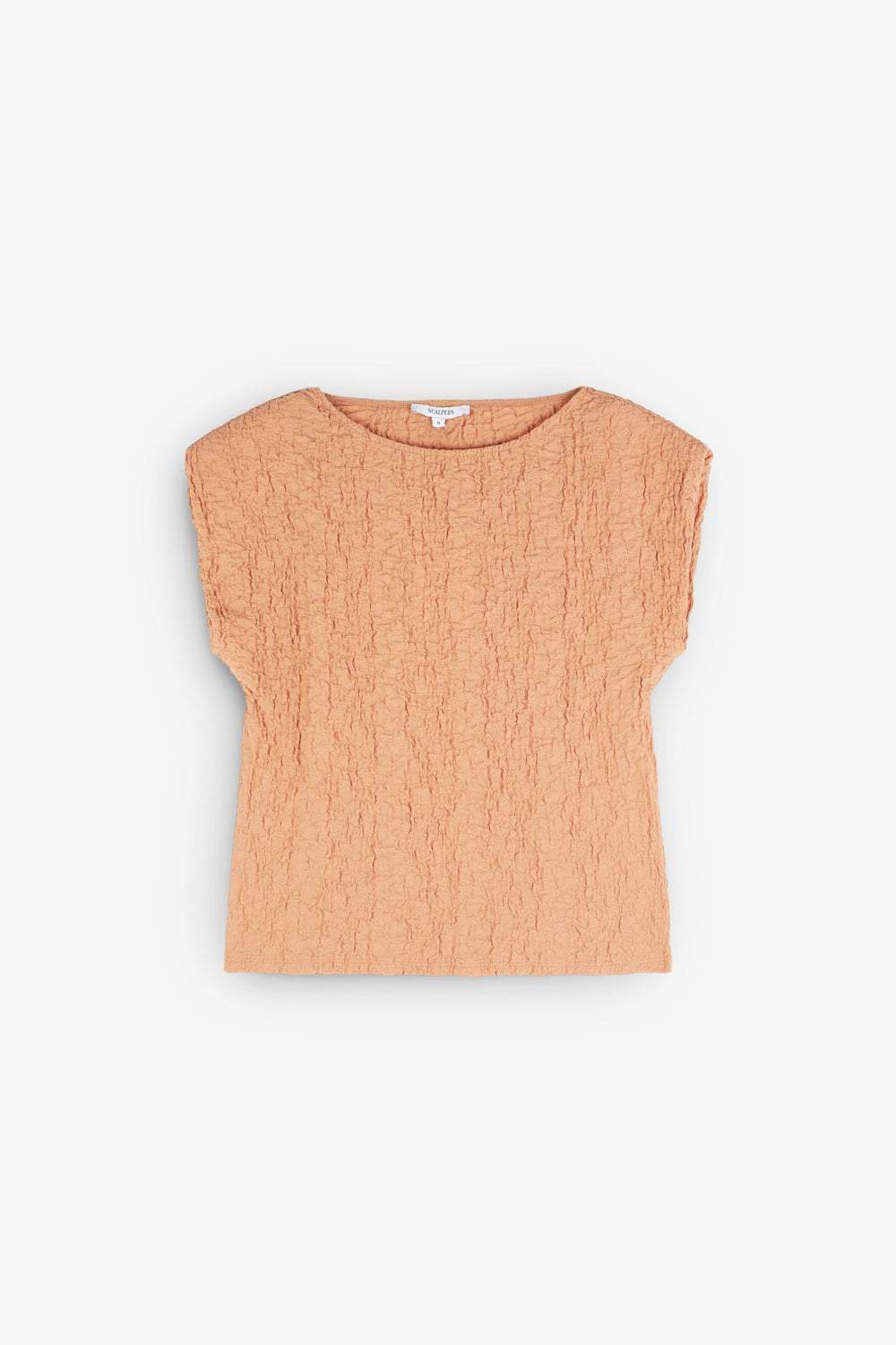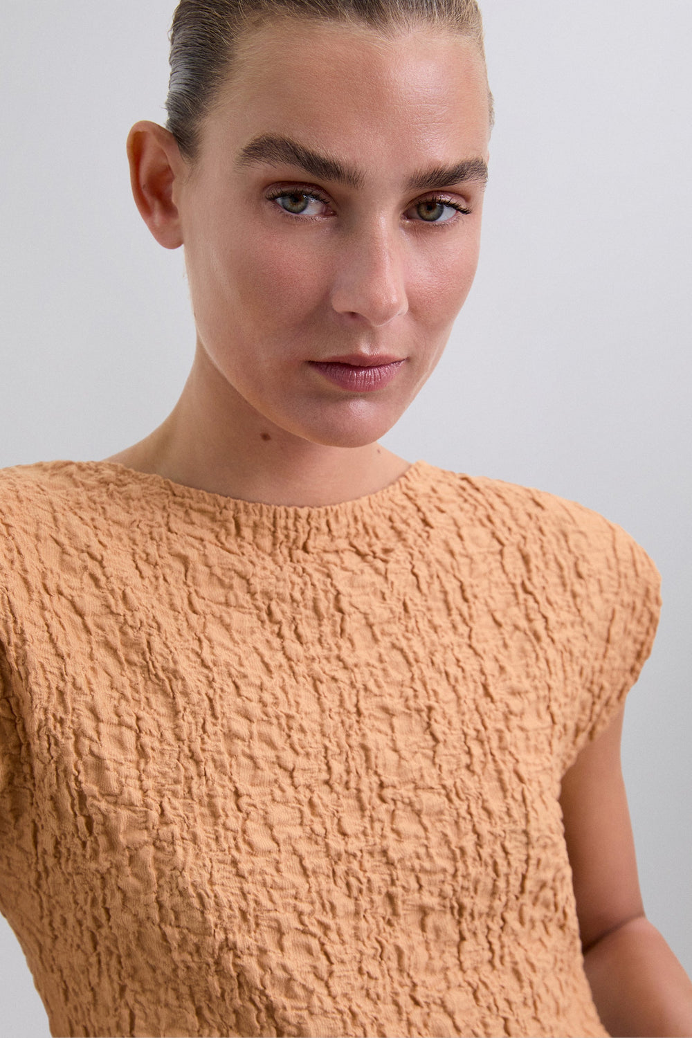 T-shirt confecionada em mistura de algodão ligeiramente elástic com textura crinkle. Corte slim fit, decote redondo e manga curta com ligeira ombreira.
