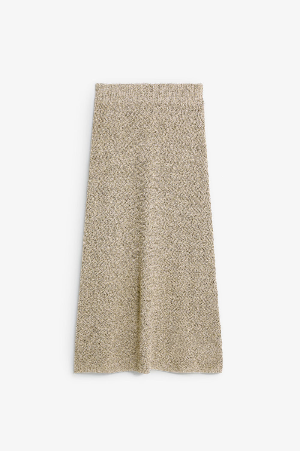 Saia comprida confecionada em tecido de malha. Corte evasé. Cintura com elástico.