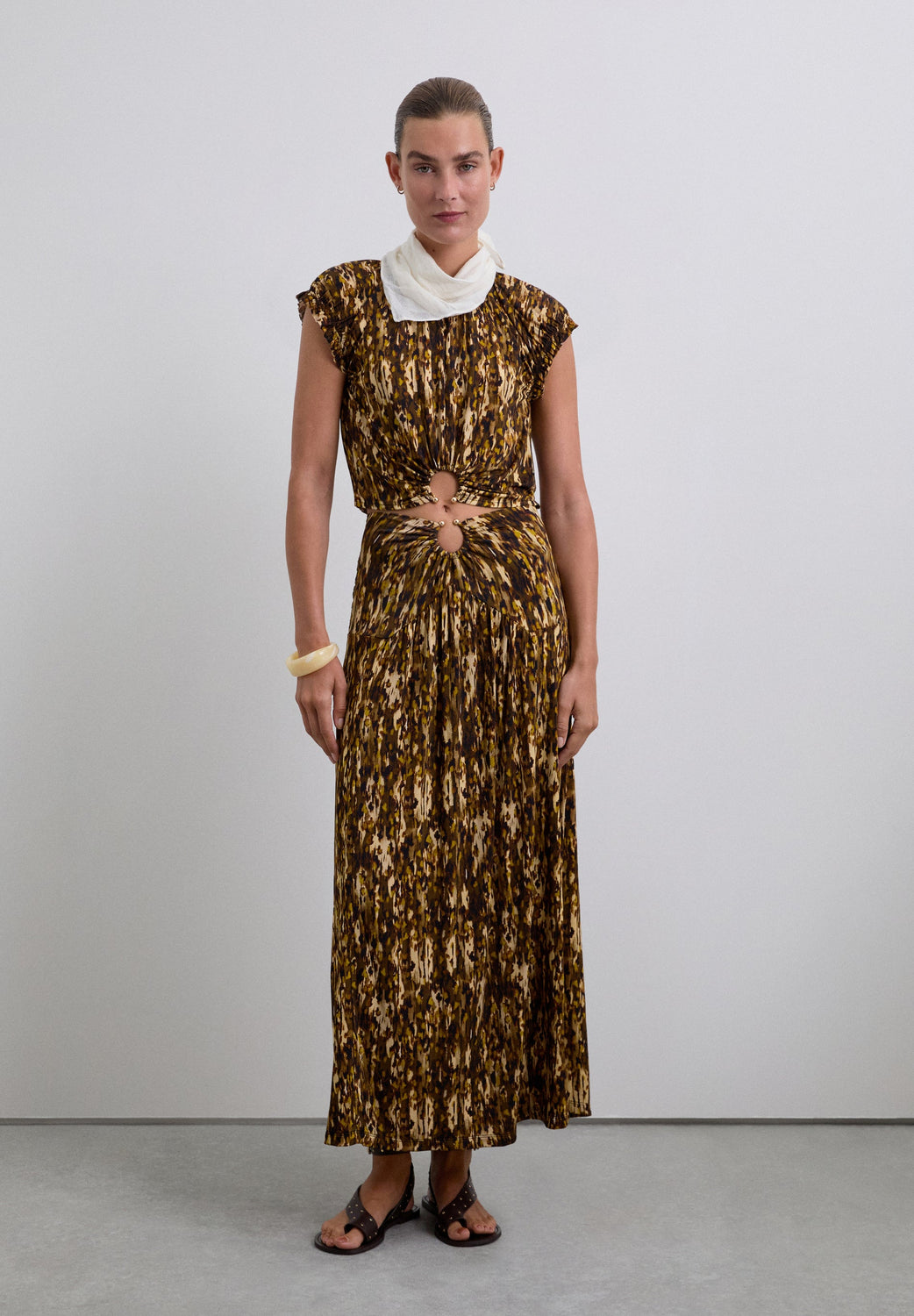 Top com padrão e pormenor de fivela metálica à frente. Manga curta. Decote redondo.