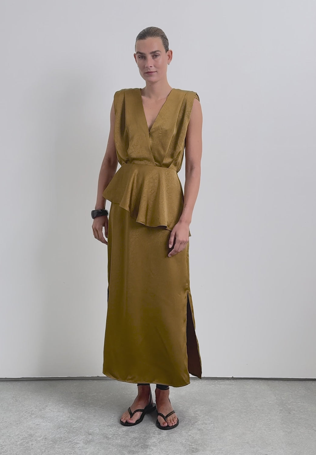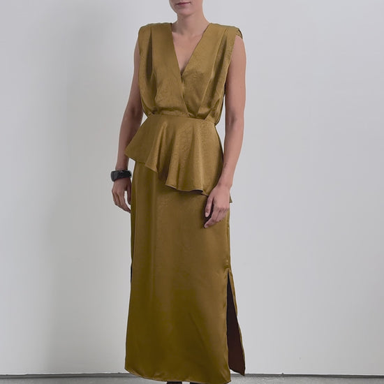 Top confecionado em tecido fluido com textura. Corte regular fit, decote em V e manga cava e ombreira ligeira. Plissados no peito, cingido na cintura e com folho na bainha.