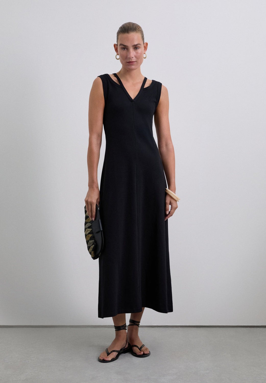 Vestido midi confecionado em 100% algodão orgânico BCI. Manga cava. Cut out nas alças. Decote com acabamento em V. Pormenor de aplique metálico nas costas.