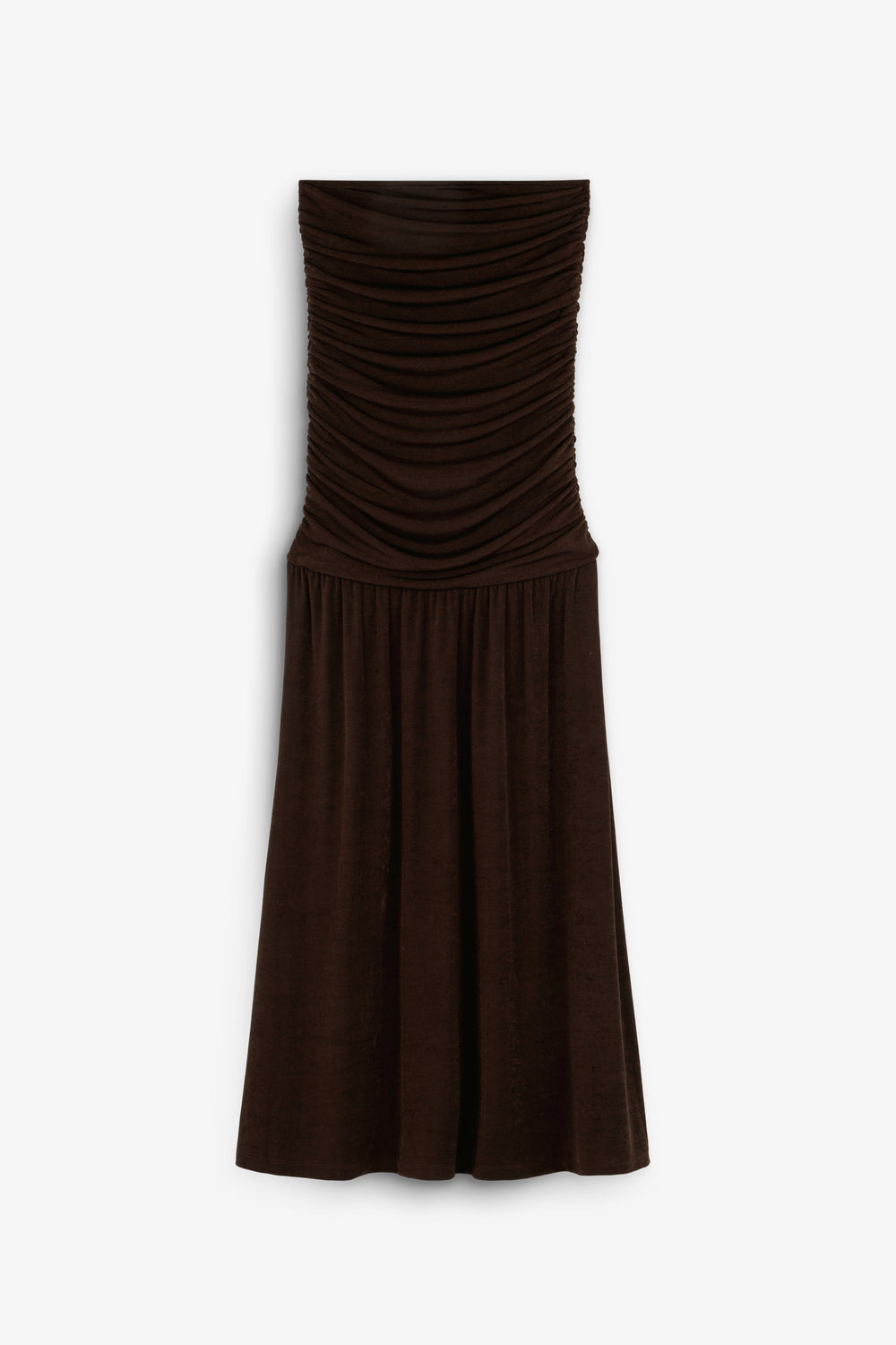 Vestido confecionado em malha fina ligeiramente elástica. Corte slim fit, sem alças, corpo com pormenor de franzidos. Corte midi.