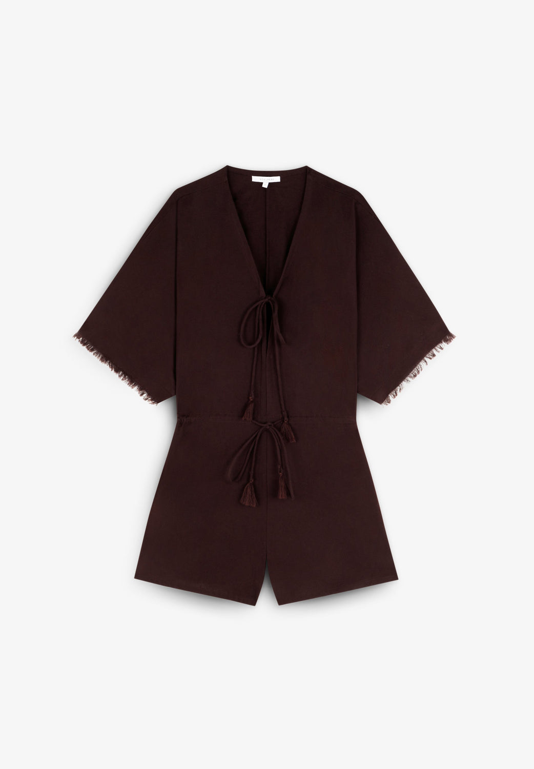 Macacão castanho. Decote terminado em V com pormenor de laço. Manga curta com pormenores de franjas. Combinação de algodão e linho.