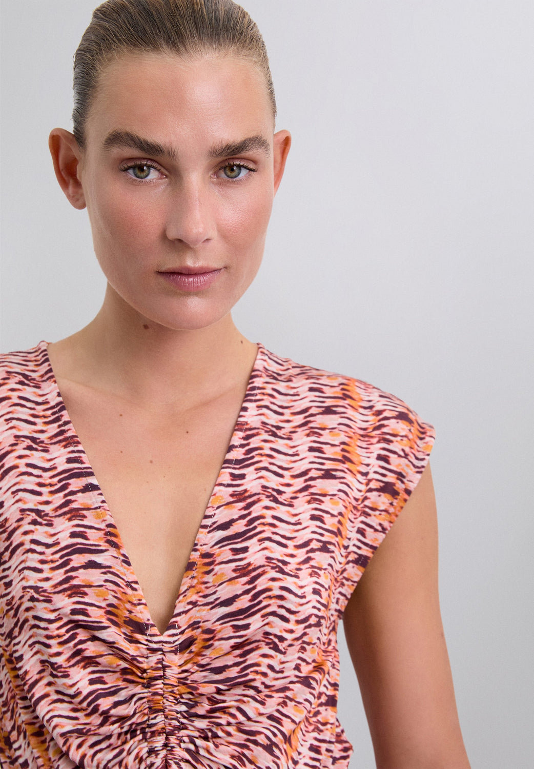 Vestido fluido estampado com cut out no peito. Manga curta. Decote em bico. Pormenor de laço ajustável frontal.