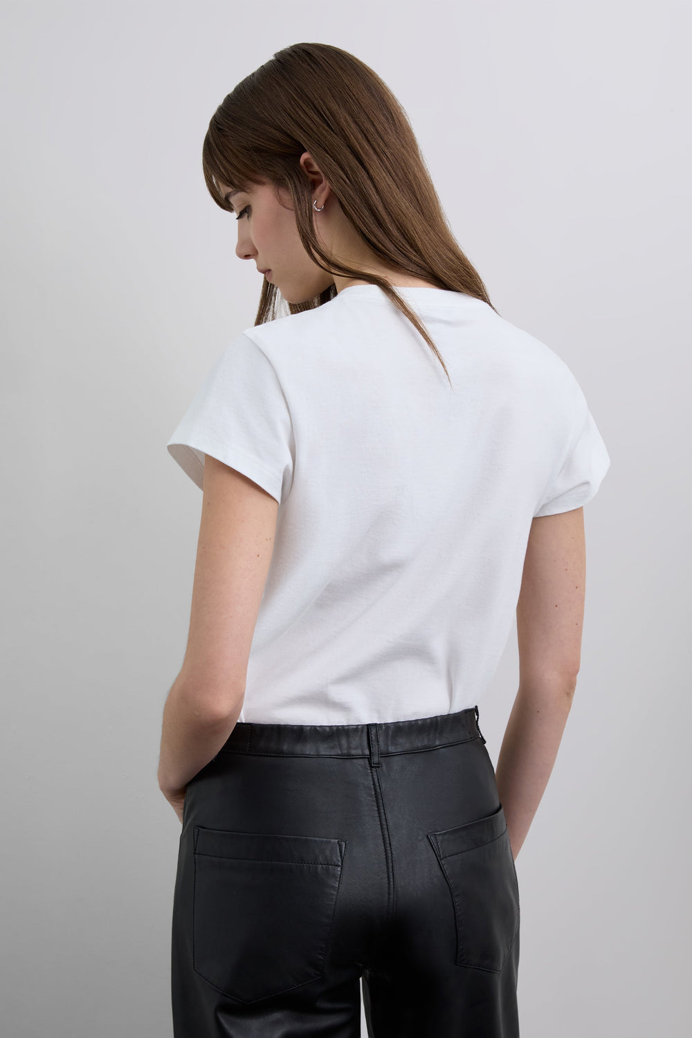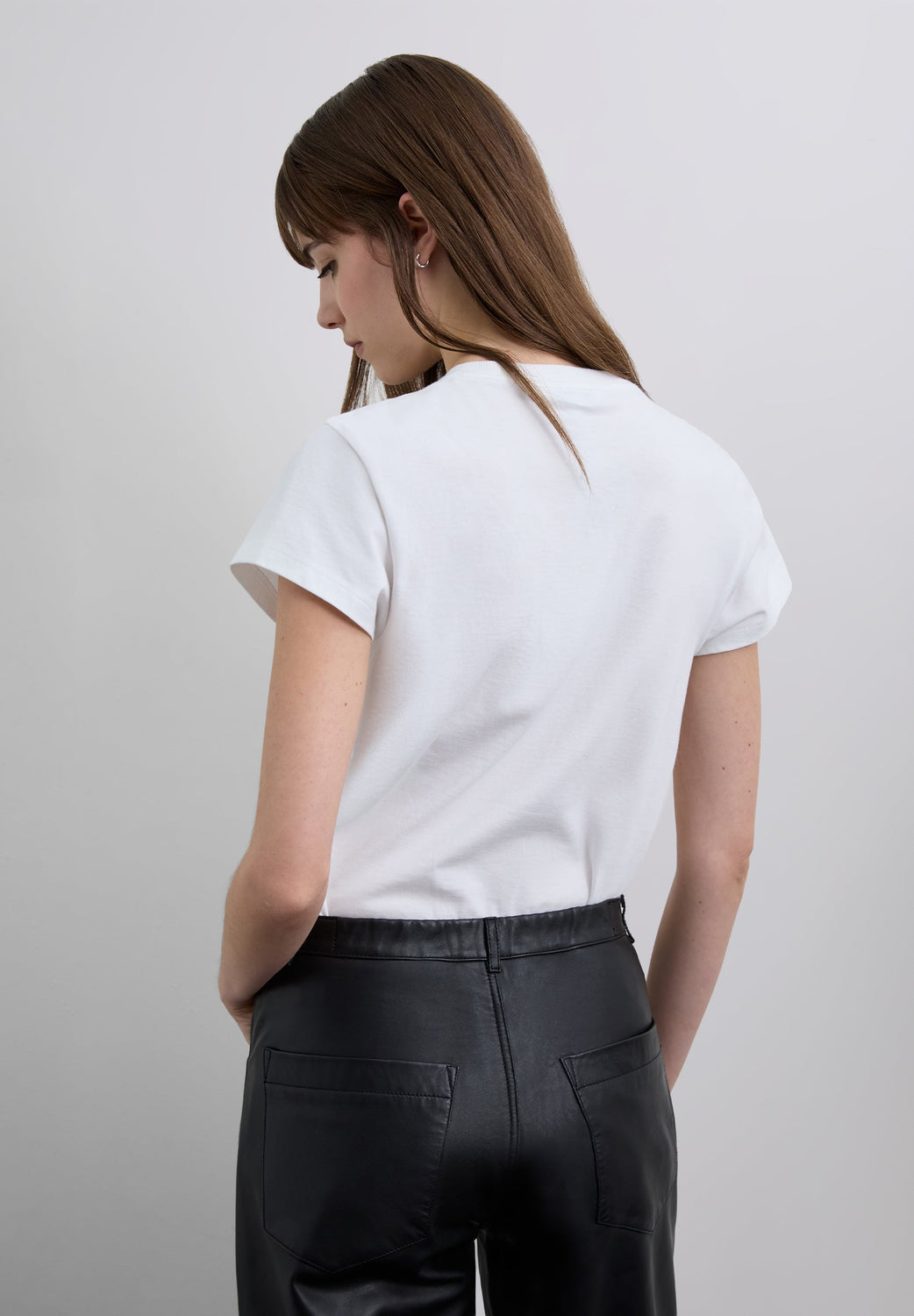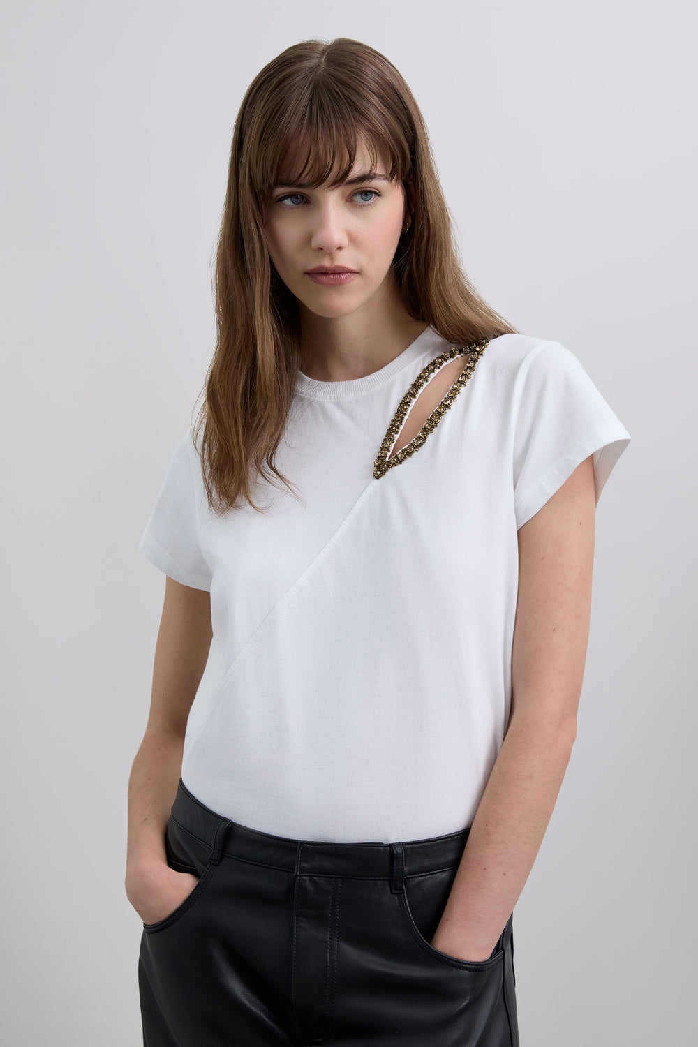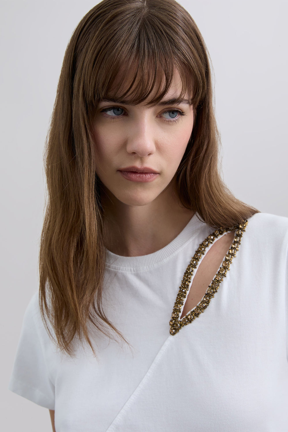 T-shirt de decote redondo e manga curta de corte regular. Pormenor de abertura com adorno na parte frontal.