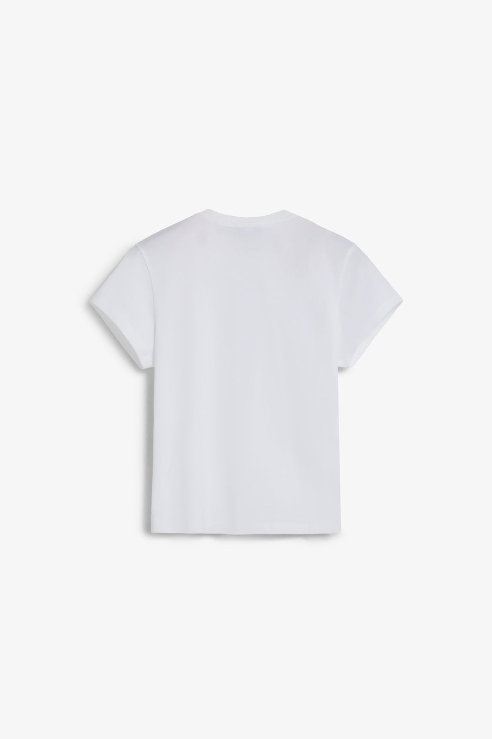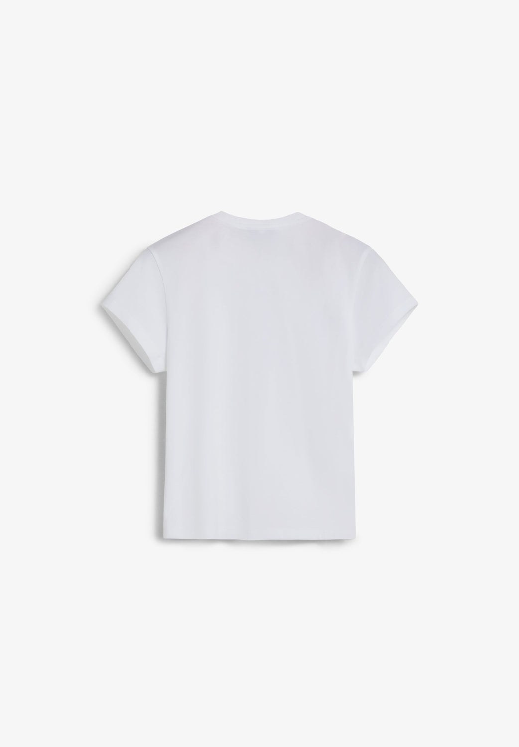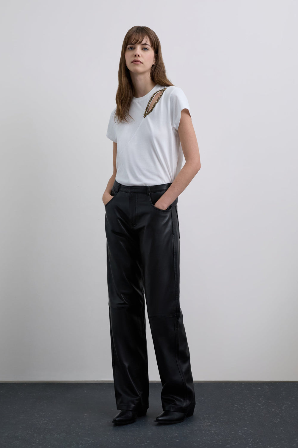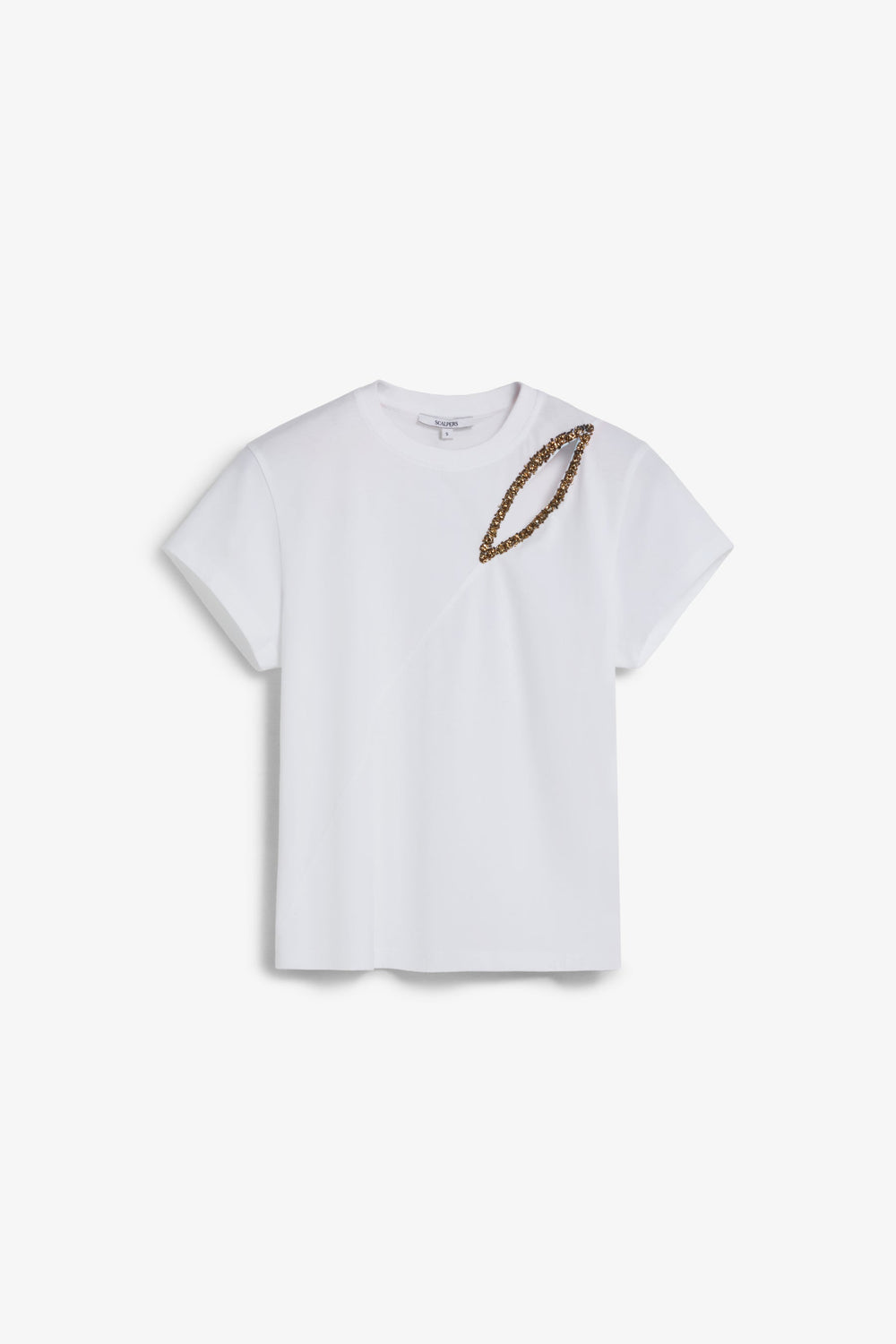 T-shirt de decote redondo e manga curta de corte regular. Pormenor de abertura com adorno na parte frontal.