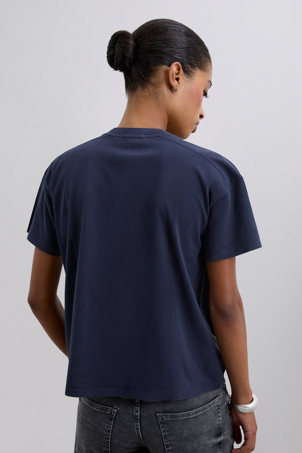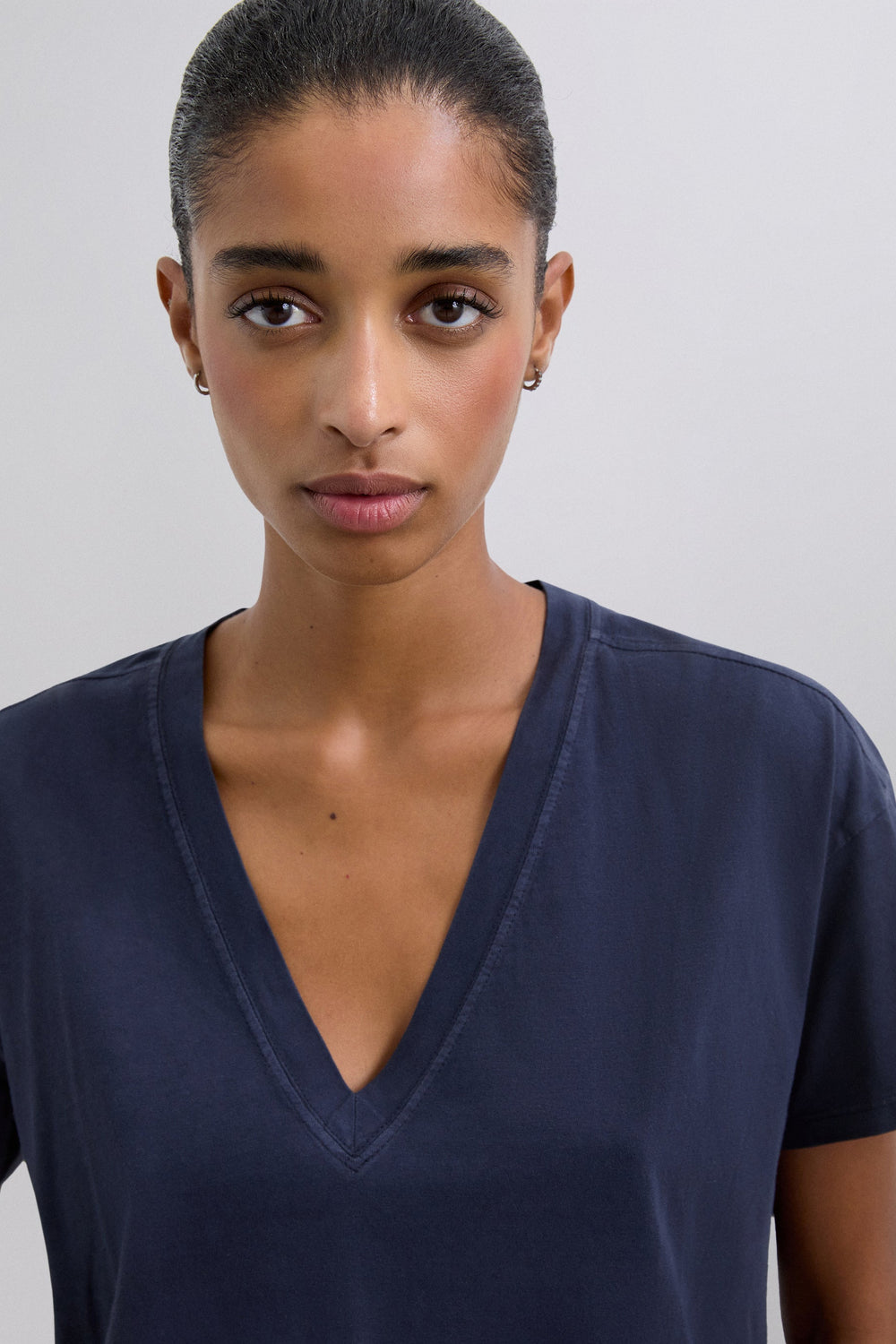 T-shirt básica confecionada em 100% algodão orgânico. Corte regular fit, decote em V e manga curta. Pormenor de logótipo bordado na parte inferior frontal.