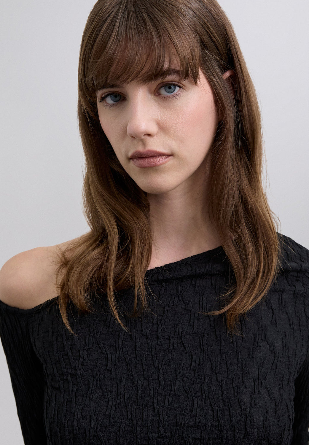 Top de manga comprida com design assimétrico. Ombro descoberto e design franzido. Acabamentos em nervuras.