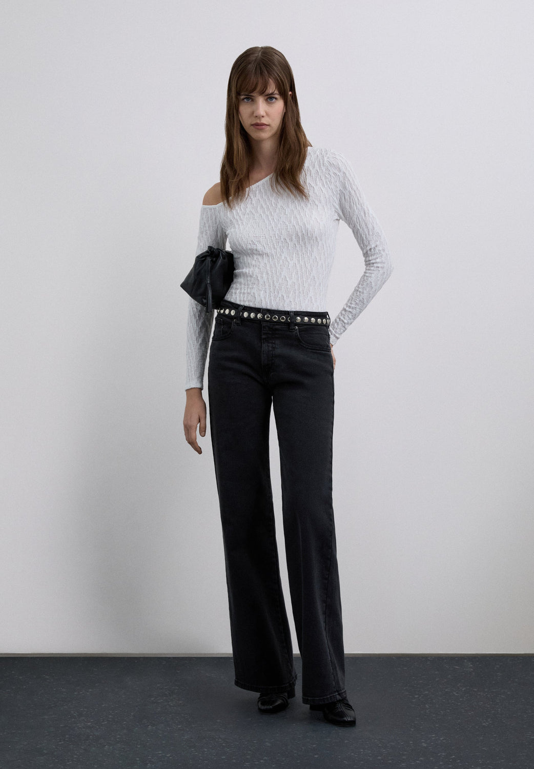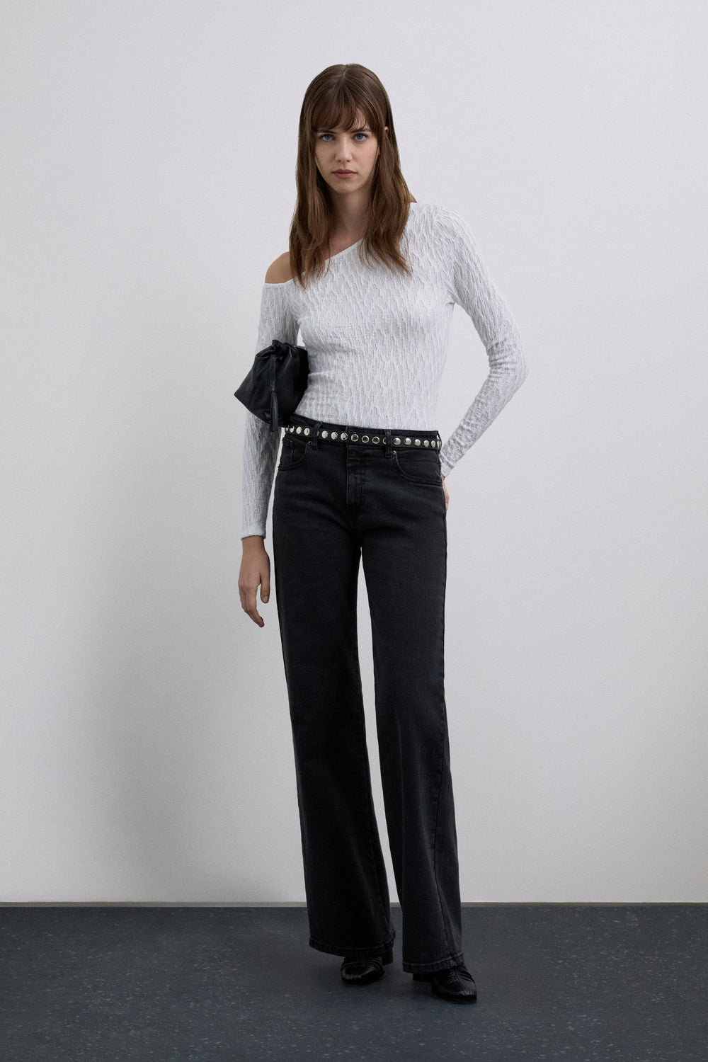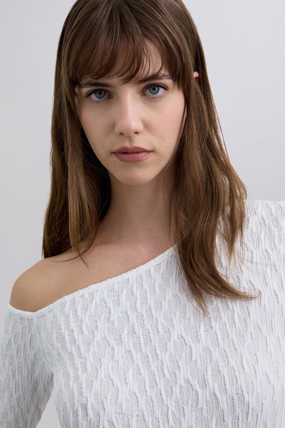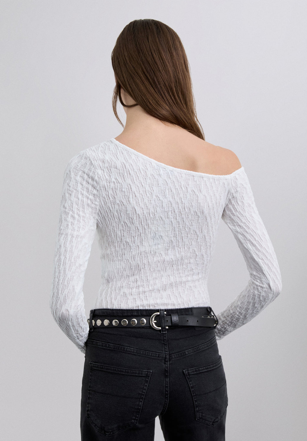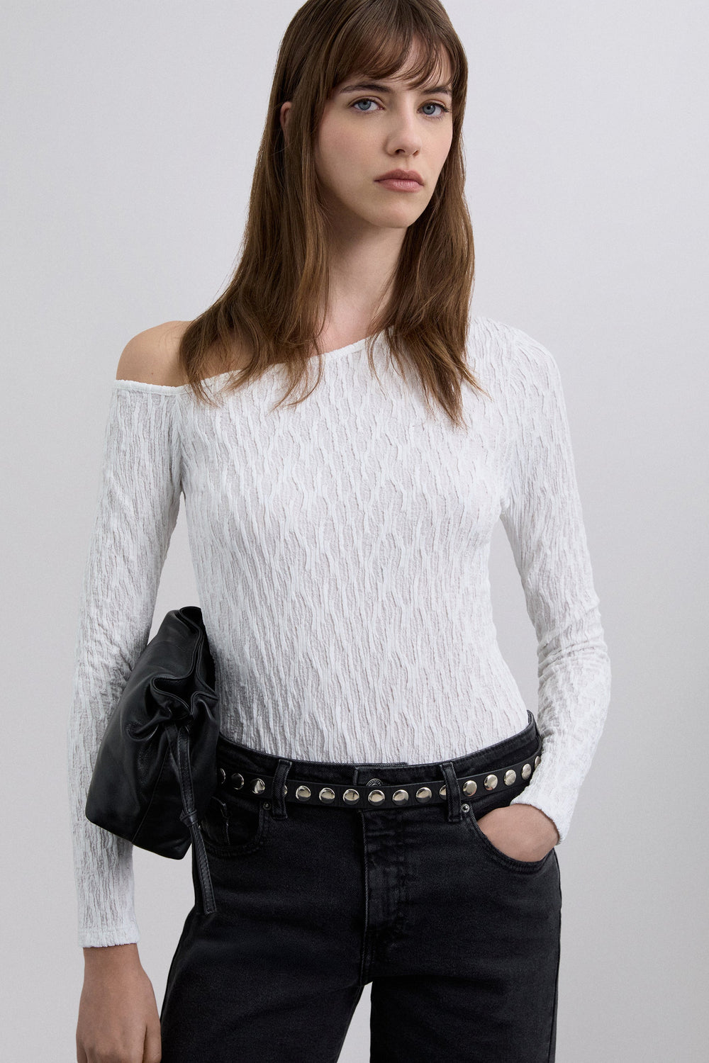Top de manga comprida com design assimétrico. Ombro descoberto e design franzido. Acabamentos em nervuras.