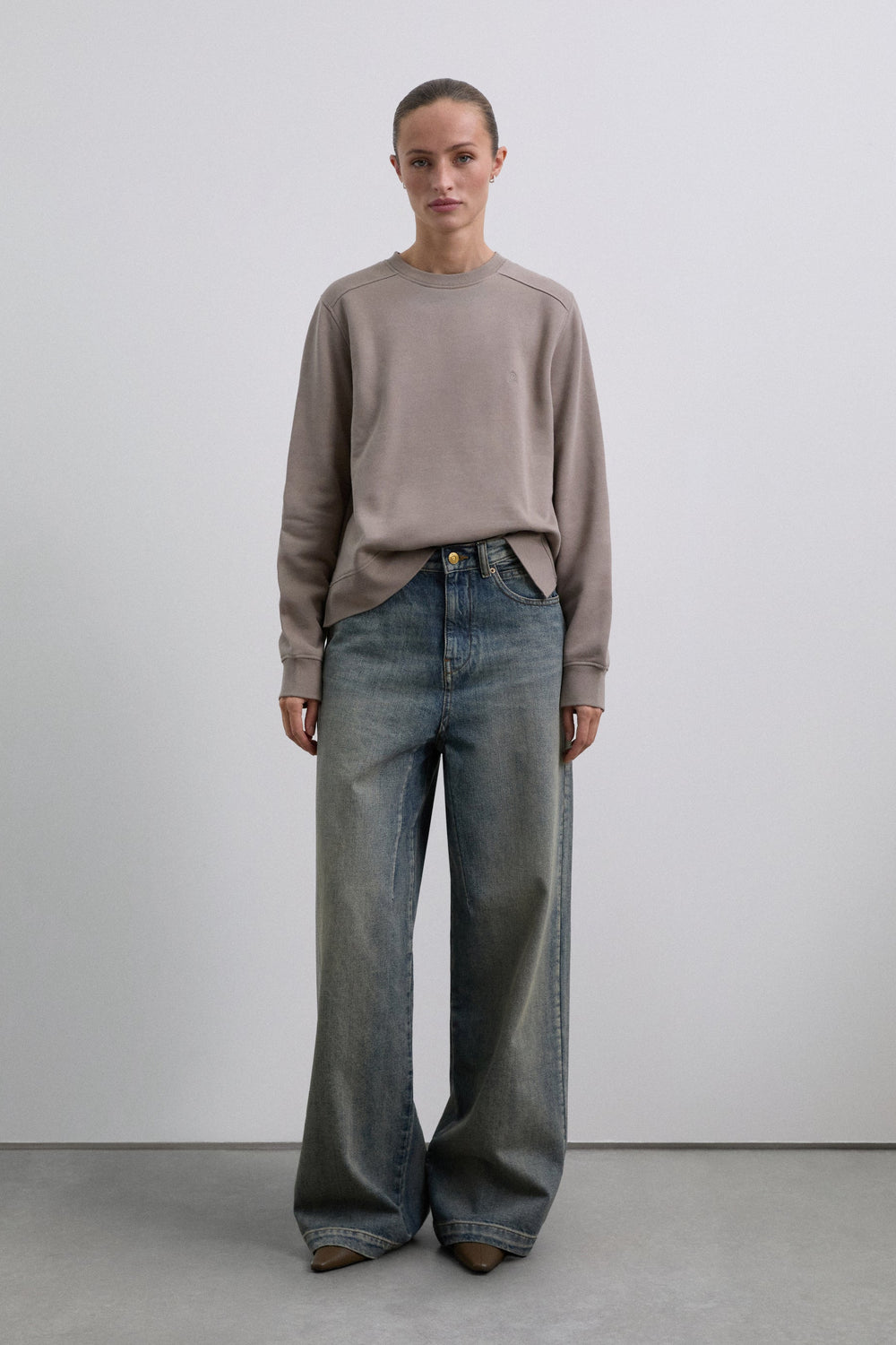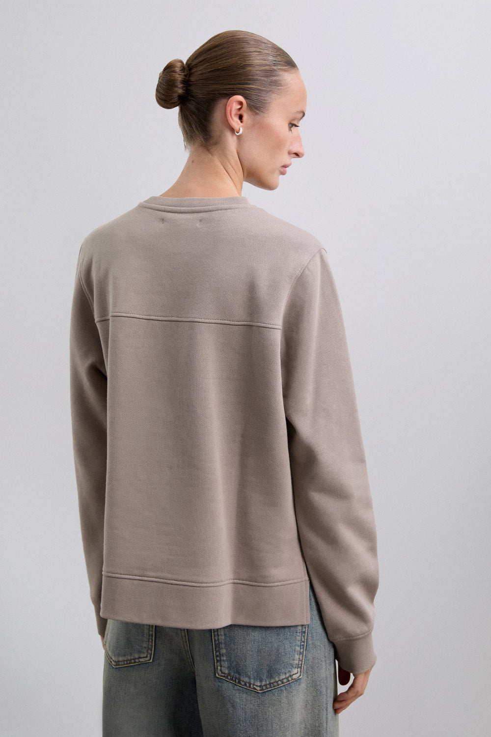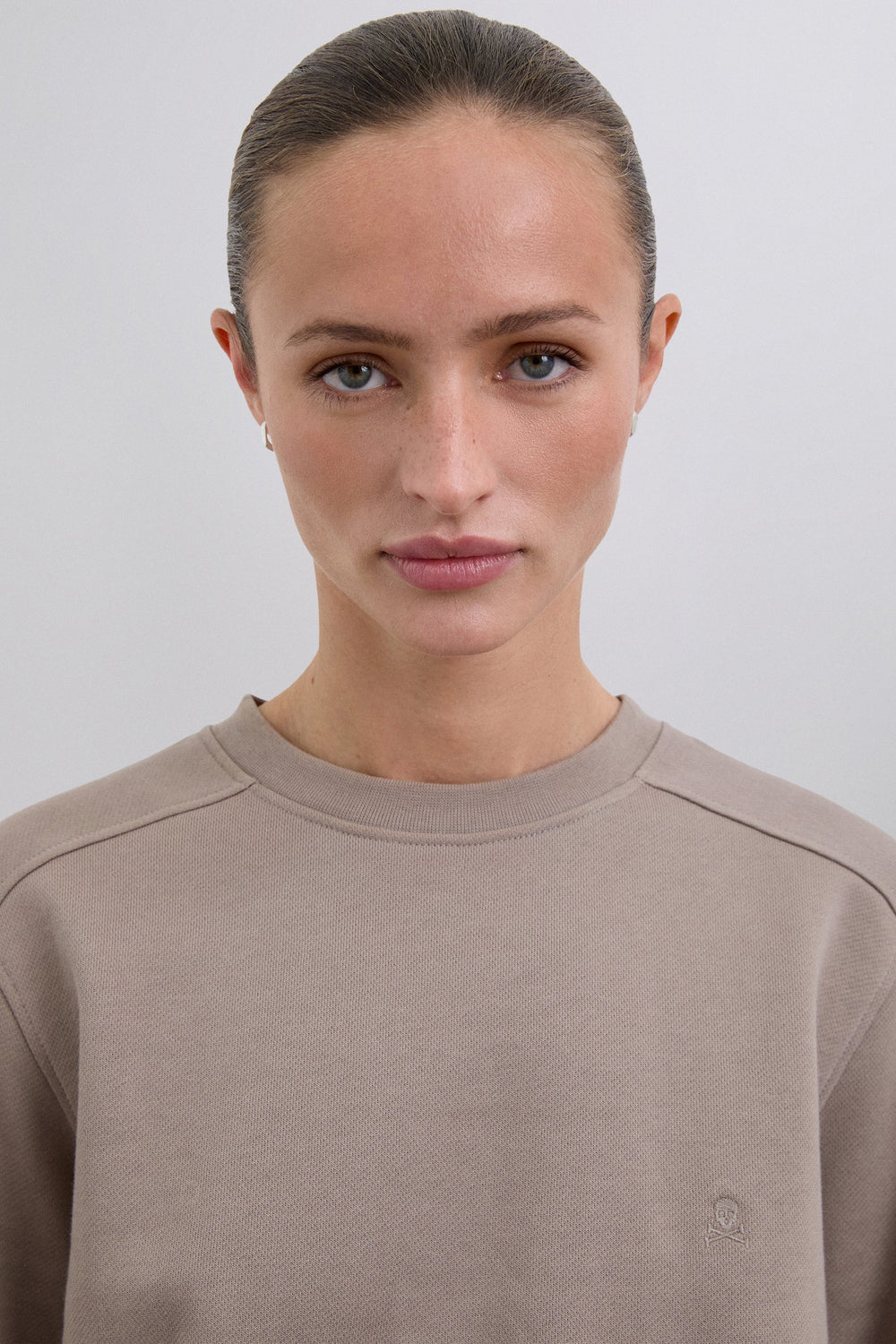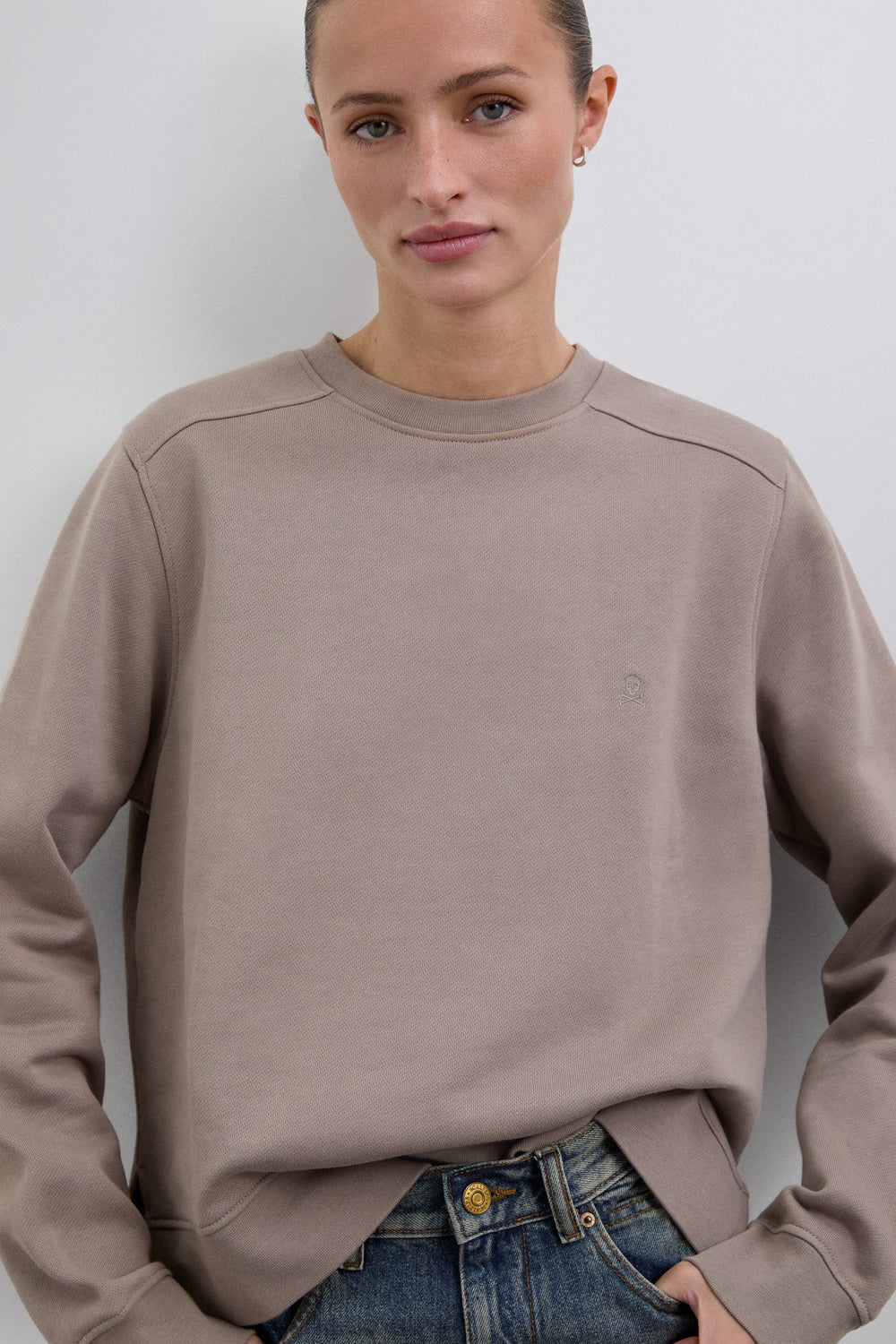 Sweatshirt confecionada em 100% algodão orgânico. Corte regular fit, decote redondo e manga comprida com punhos terminados em nervuras. Bainha assimétrica, parte traseira alongada. Pormenor de skull bordada no peito.