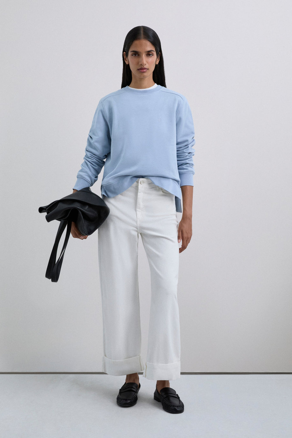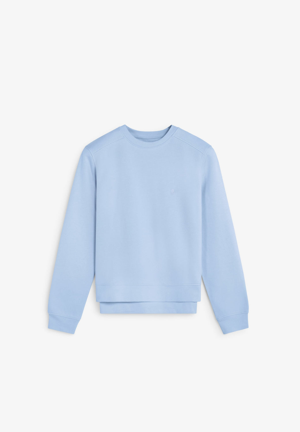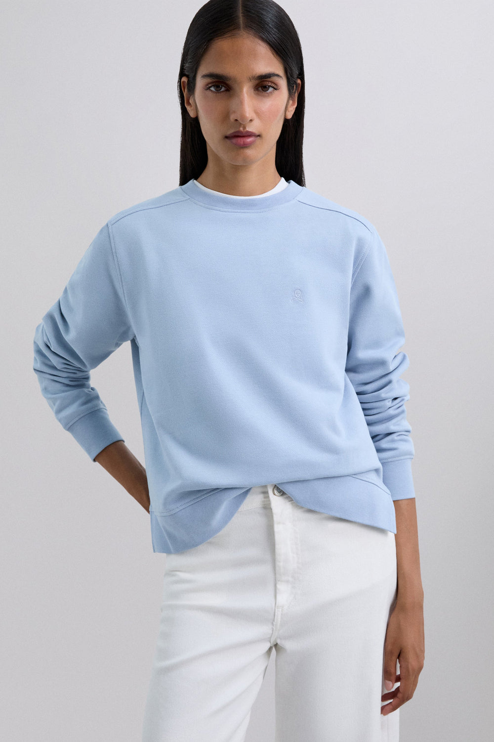 Sweatshirt confecionada em 100% algodão orgânico. Corte regular fit, decote redondo e manga comprida com punhos terminados em nervuras. Bainha assimétrica, parte traseira alongada. Pormenor de skull bordada no peito.