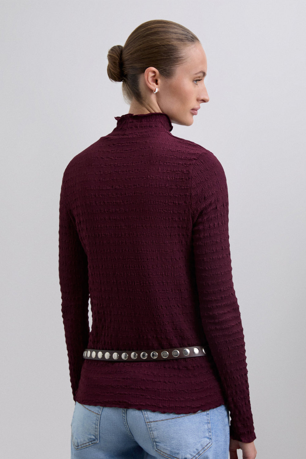 Top de gola alta e manga comprida. Tecido leve com design com estrutura franzida.
