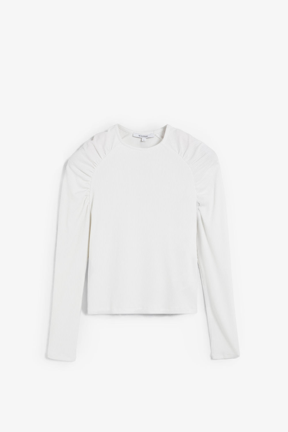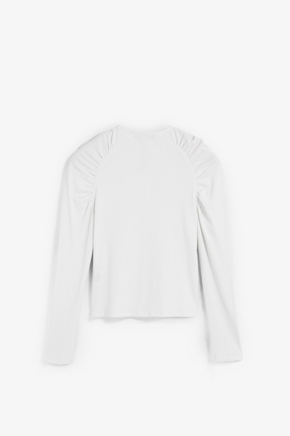 T-shirt de manga comprida canelada. Pormenor nos ombros com franzido. Tecido elástico e decote redondo.